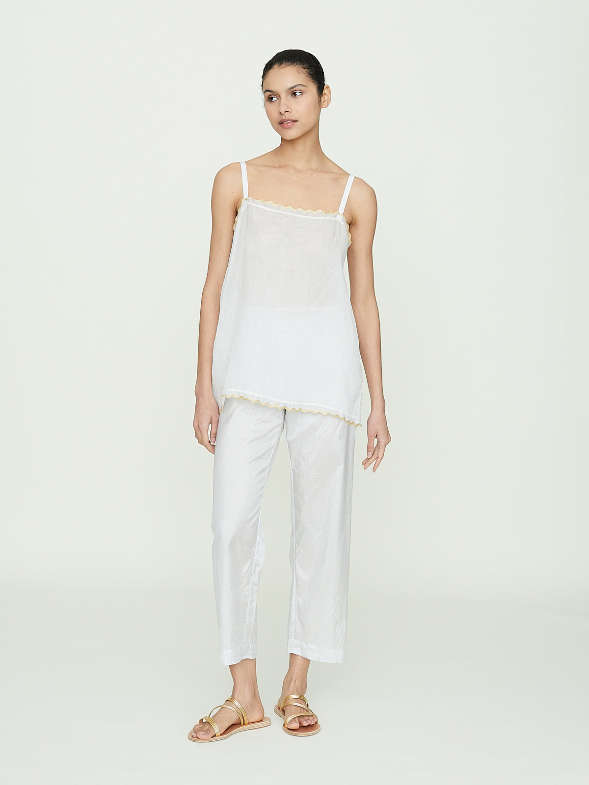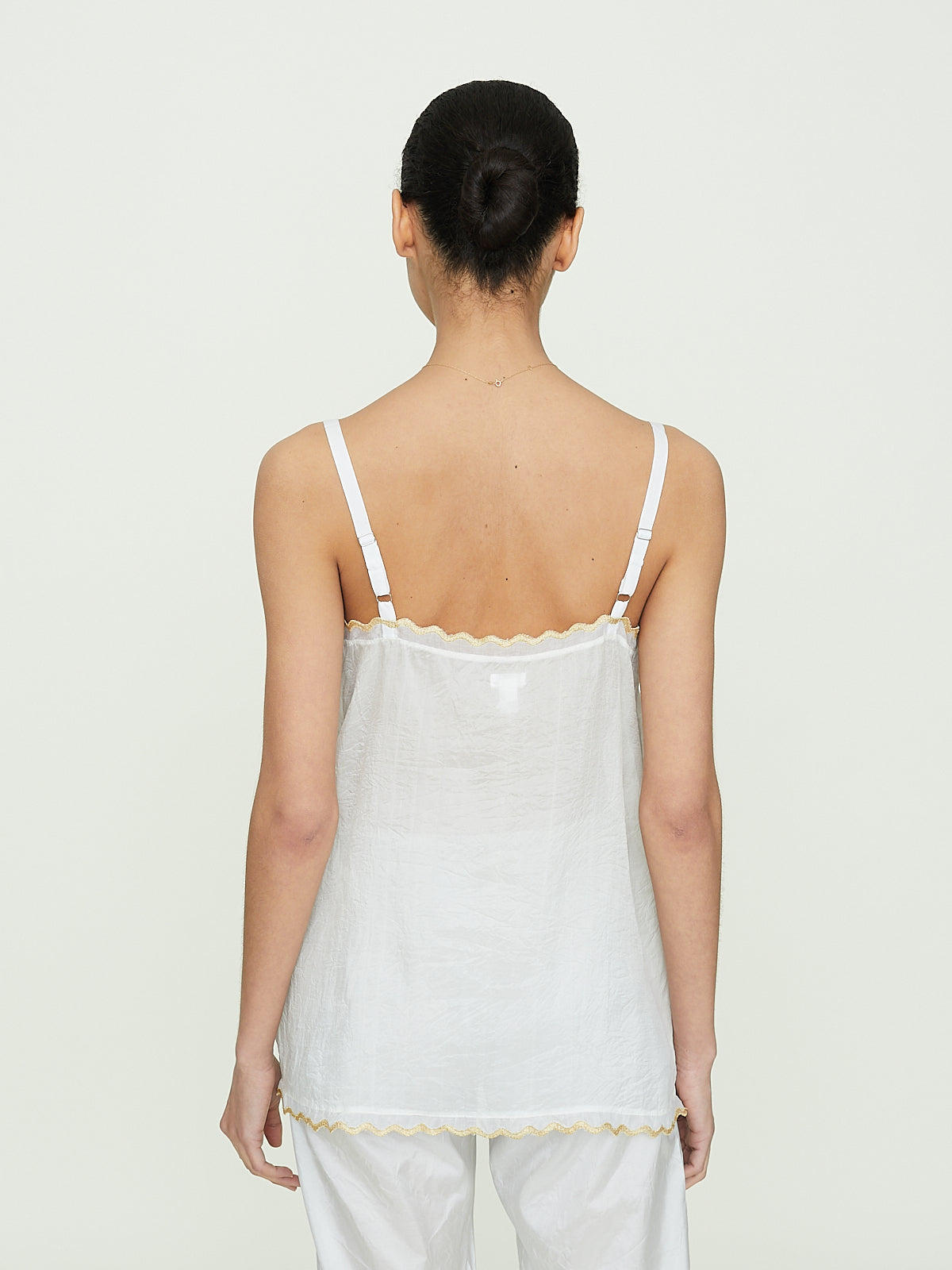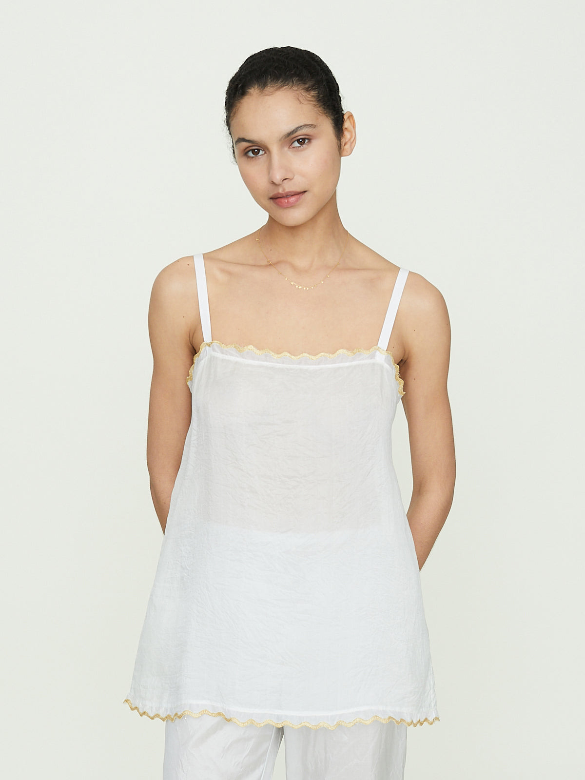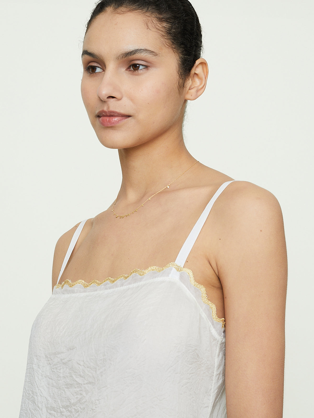 Tank top in lightweight off white iridescent habutai silk cloth. Square neckline, thin adjustable shoulder straps and with a vintage gold lace trim detail at the neck and bottom hem. Straight cut and relaxed fit.