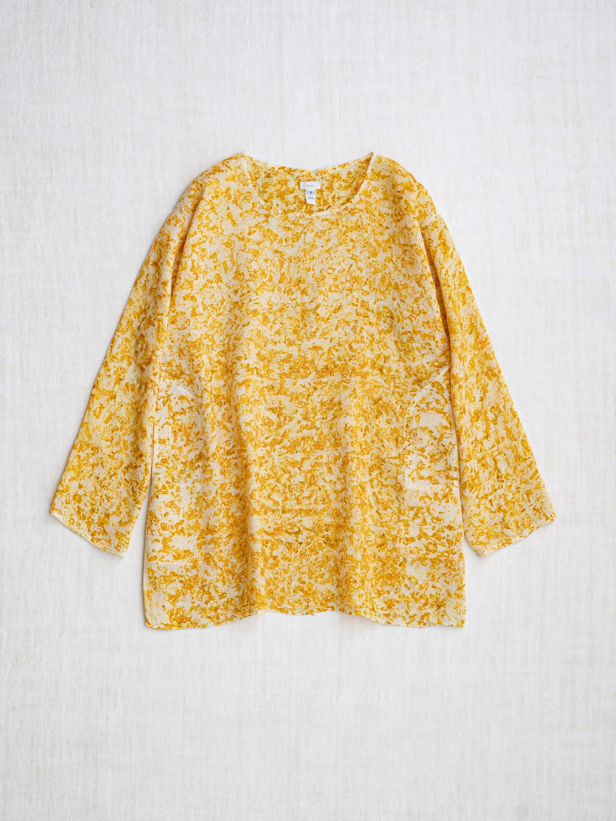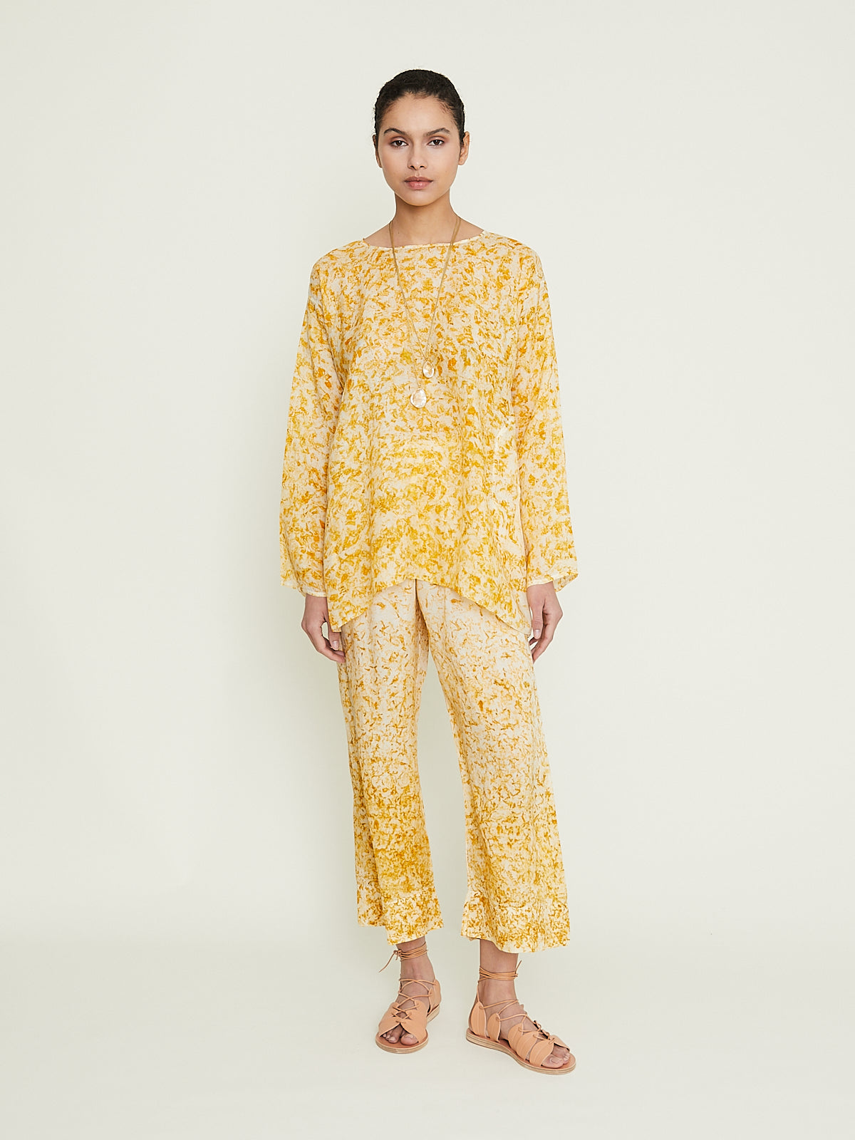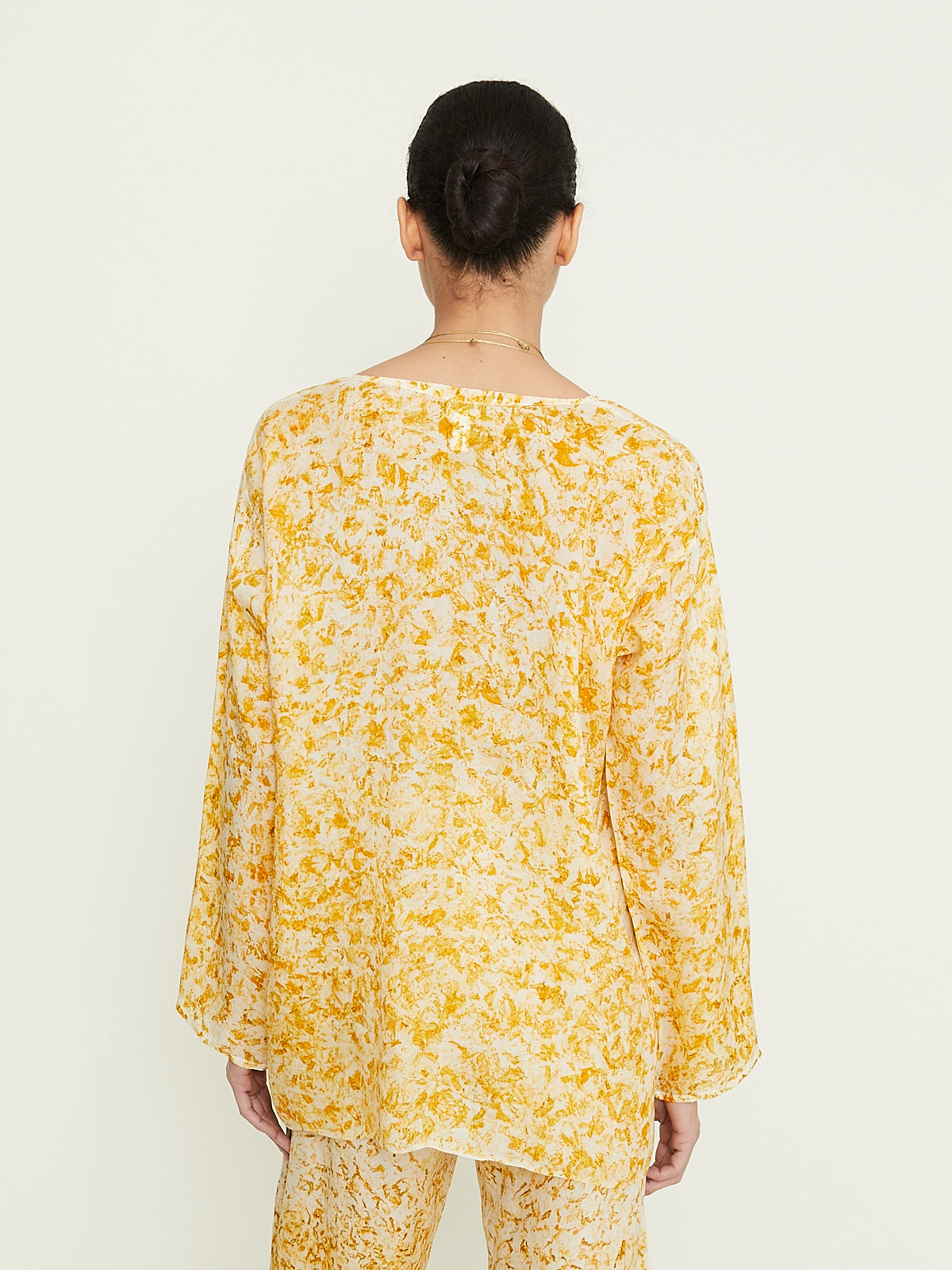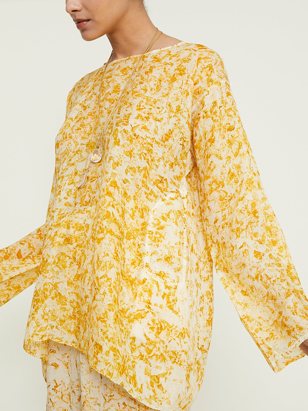 Relaxed top in cream khadi silk with a pattern that has been dyed by hand using fresh and dried marigold petals. Subtle square neckline and side seam pockets.