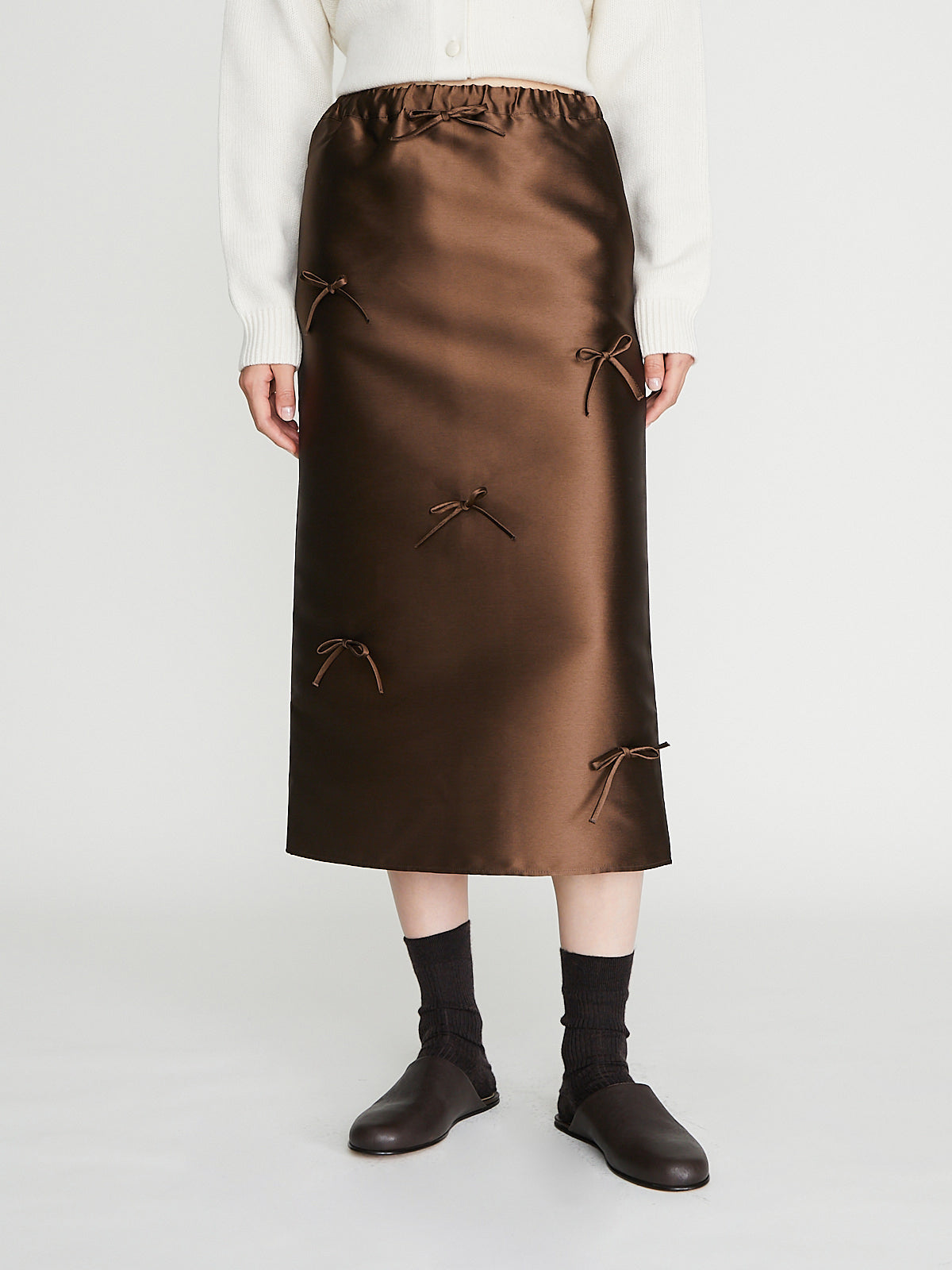 A-line skirt in shiny slightly stiff brown polyester. Pull-on style with an elasticated waistband and a back vent. Side seam pockets. Features a delicate bow details scattered across the skirt.