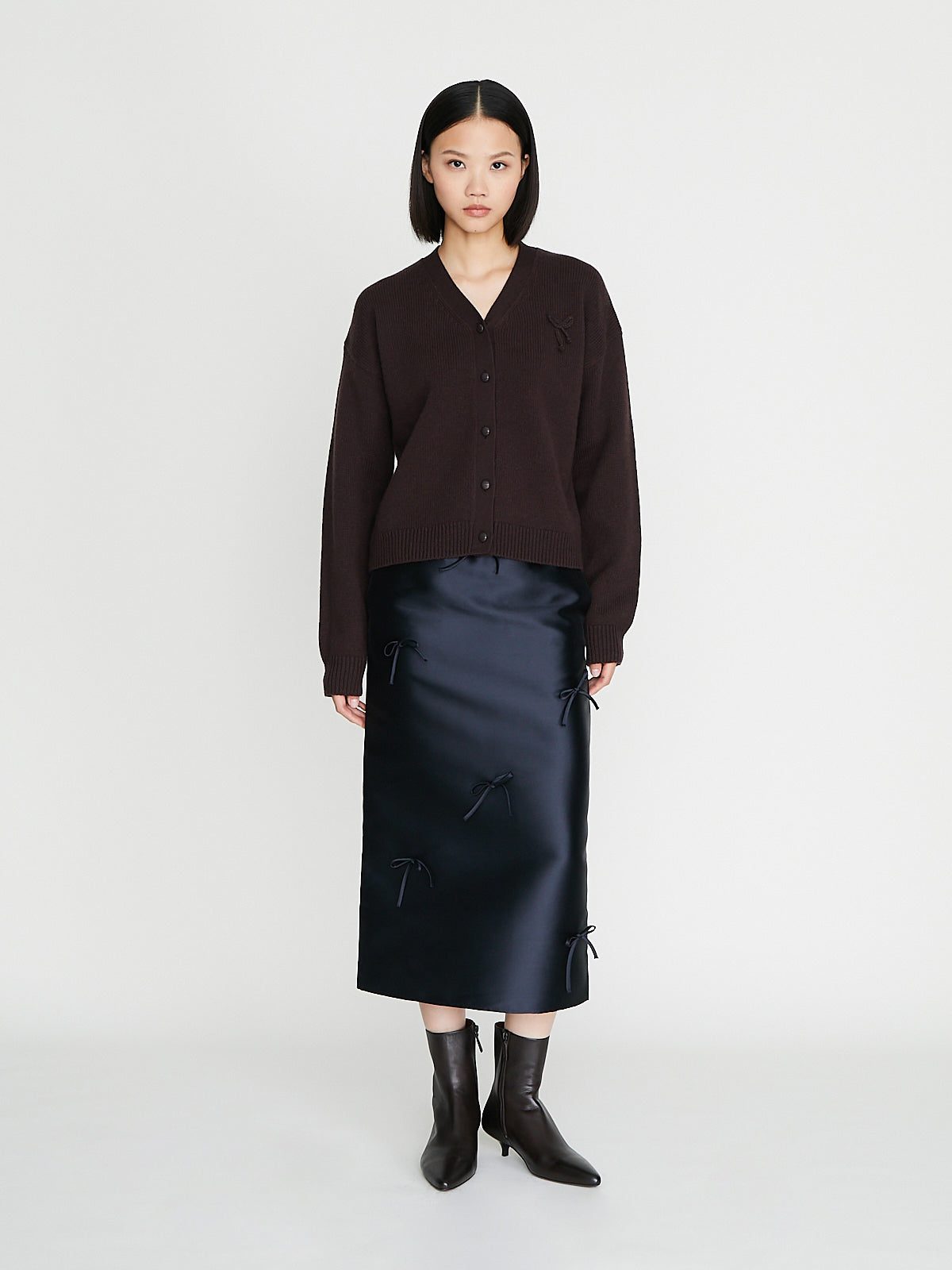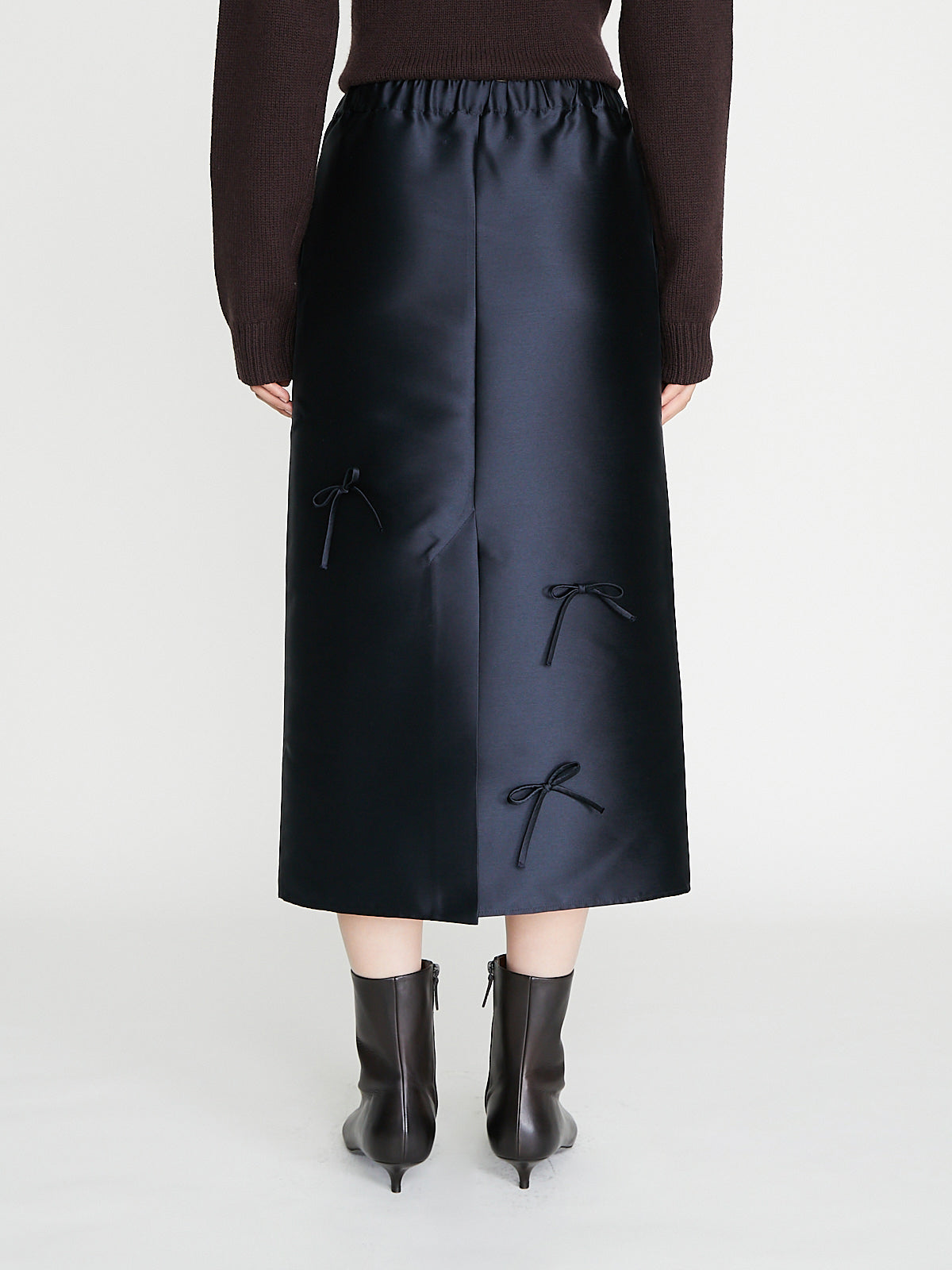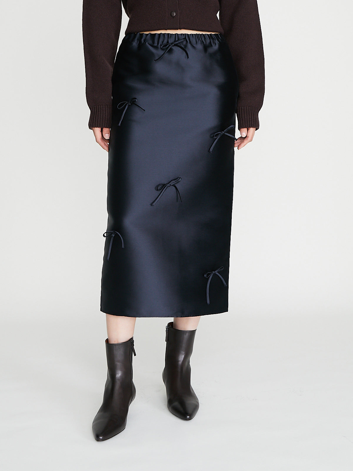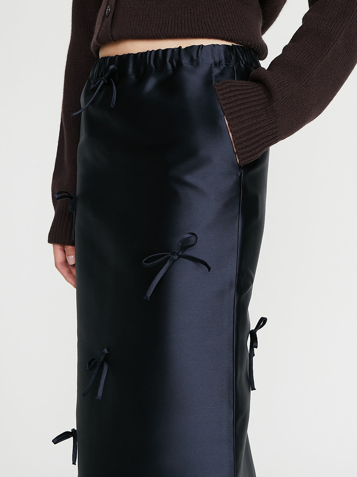 A-line skirt in shiny slightly stiff navy polyester. Pull-on style with an elasticated waistband and a back vent. Side seam pockets. Features a delicate bow details scattered across the skirt.