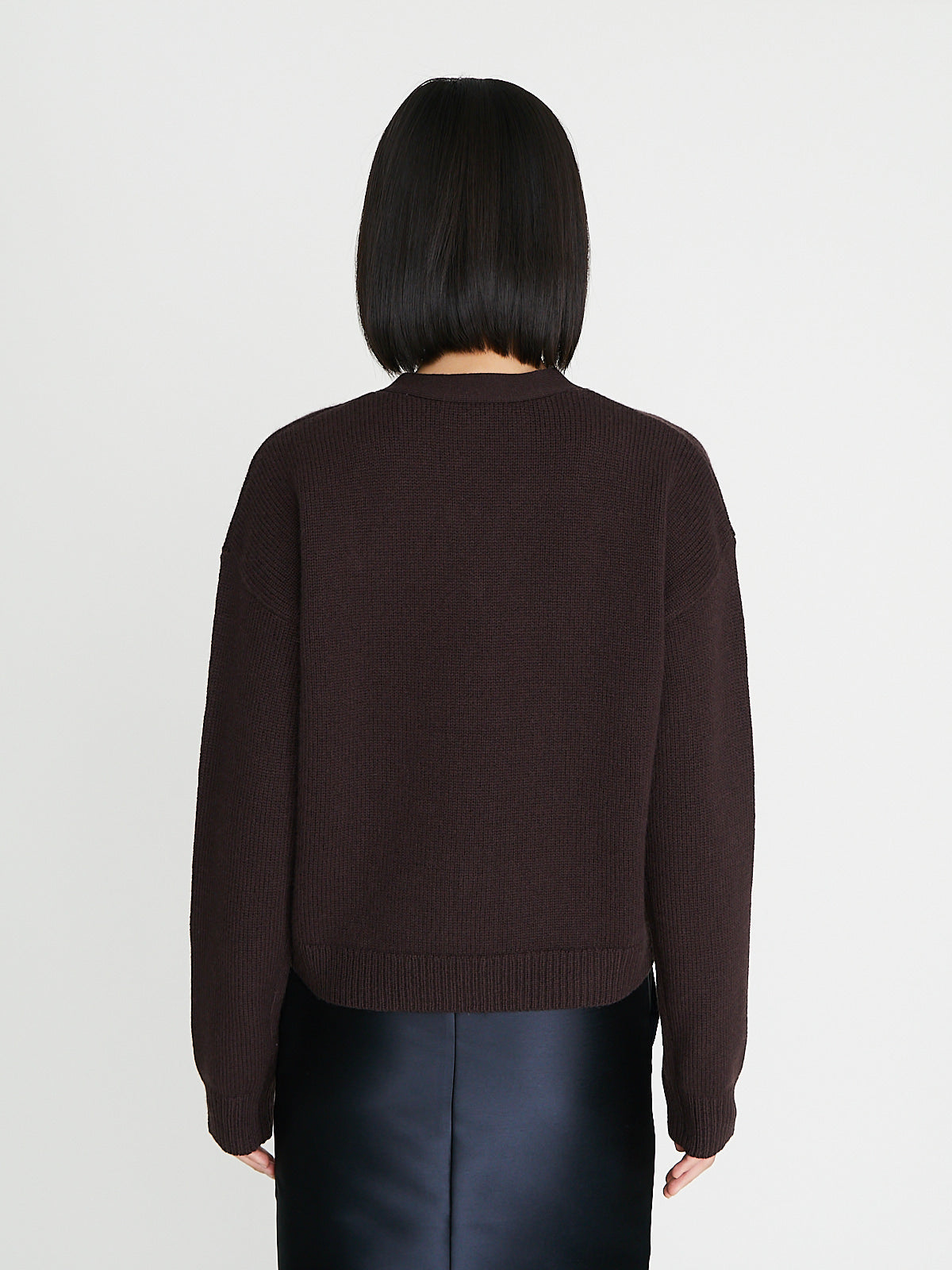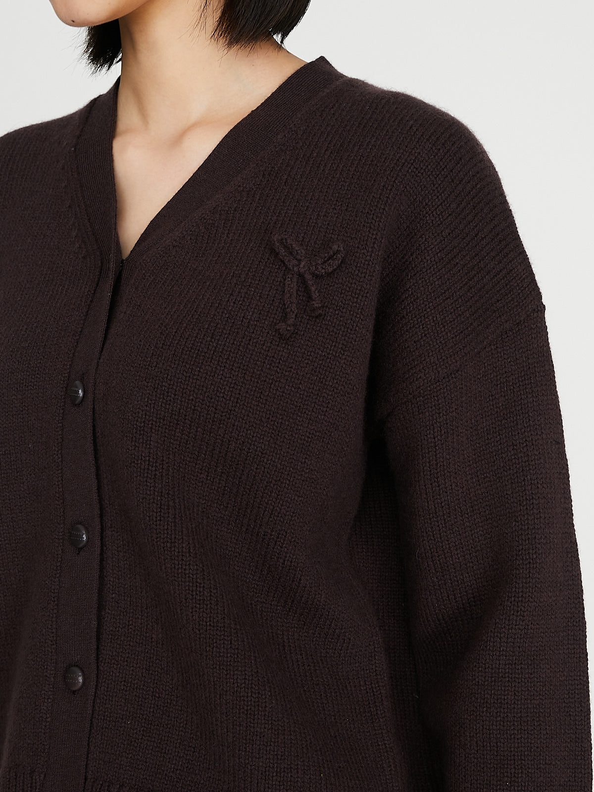 Relaxed classic cardigan in soft burgundy lambswool. V-neck, front button fastening and long sleeves with a dropped shoulder. Features a bow detail at the front. Boxy fit.