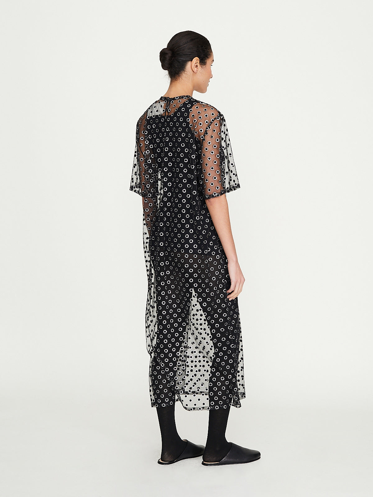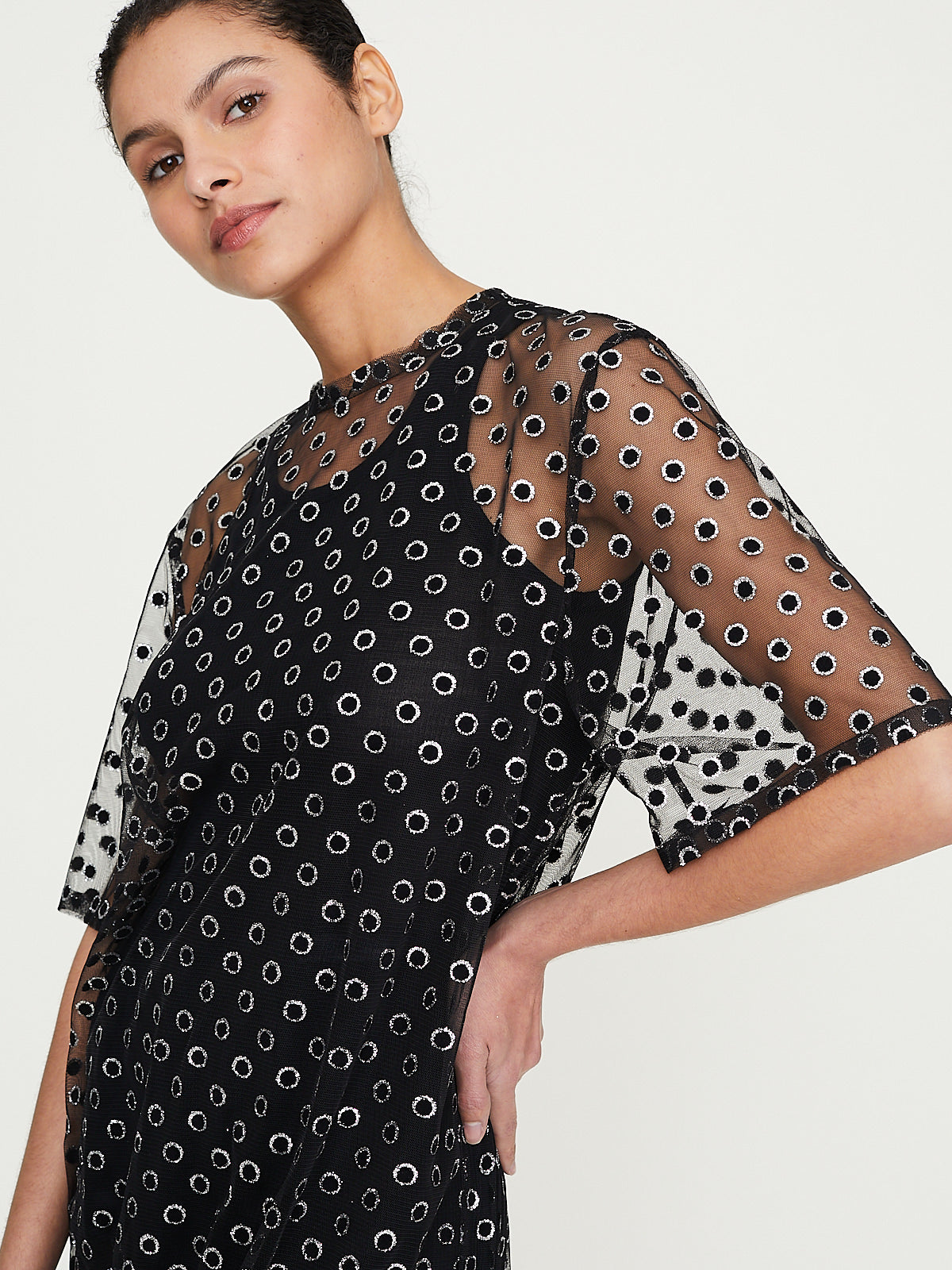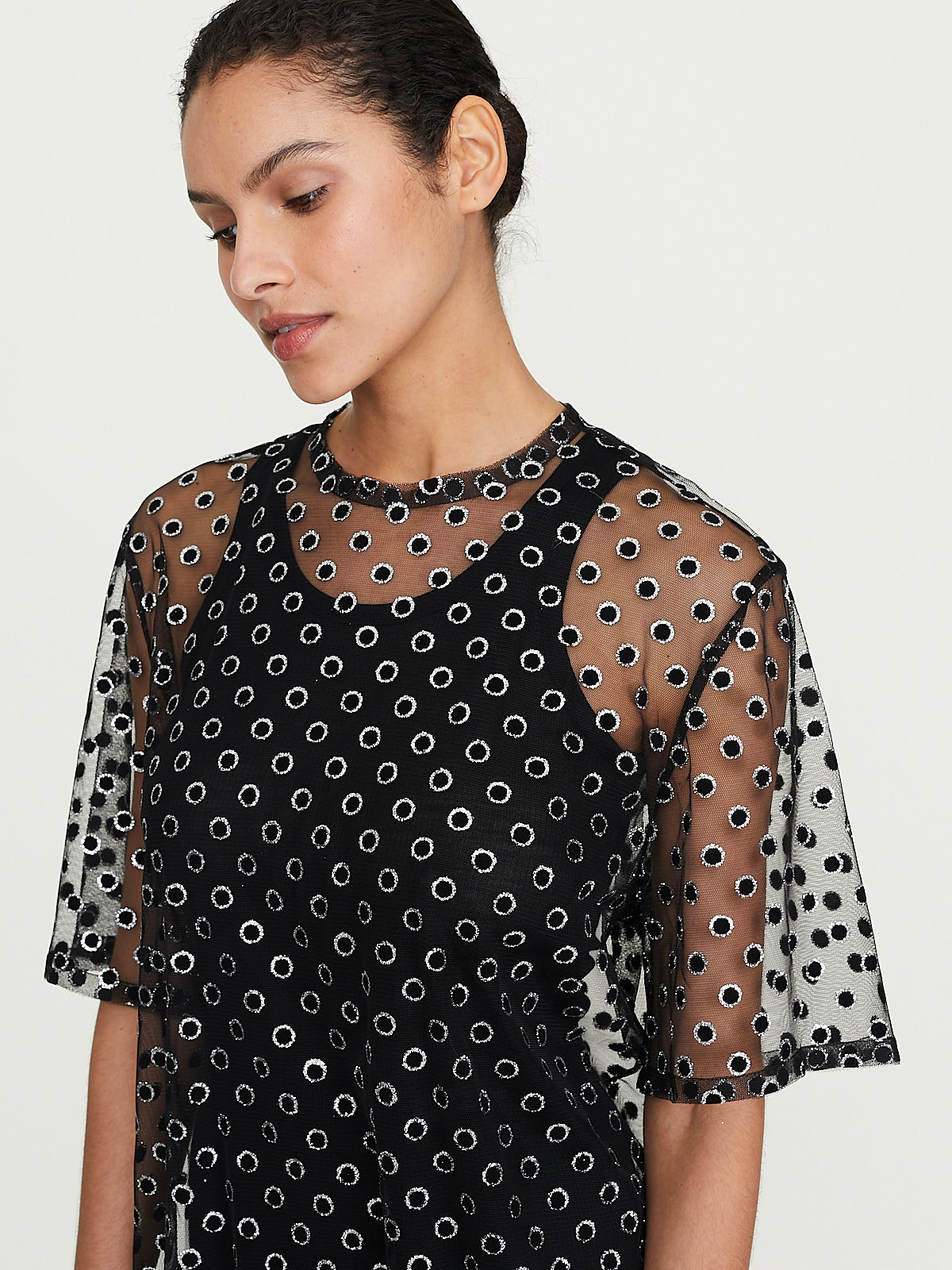 T-shirt dress in black polyester with shiny silver circle details for a touch of sparkle. Crewneck with a single button closure at the back and wide elbow-length sleeves. Regular fit.
