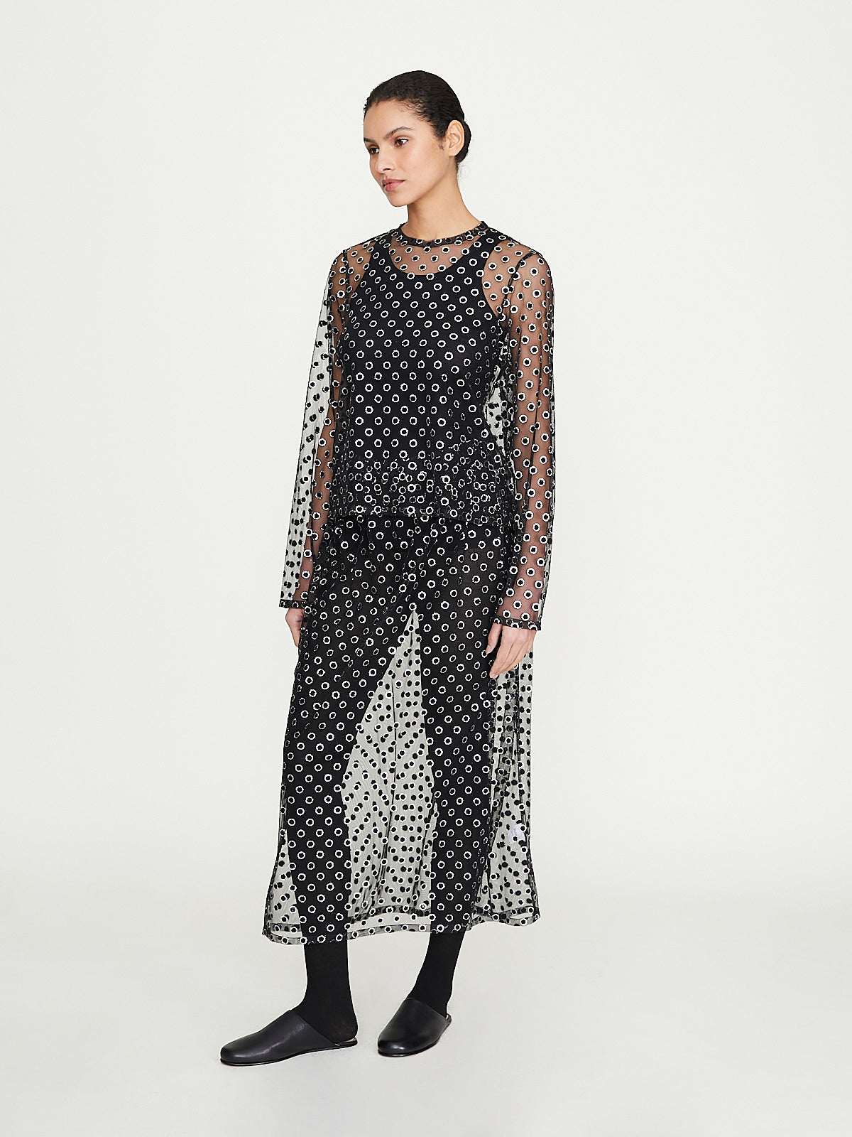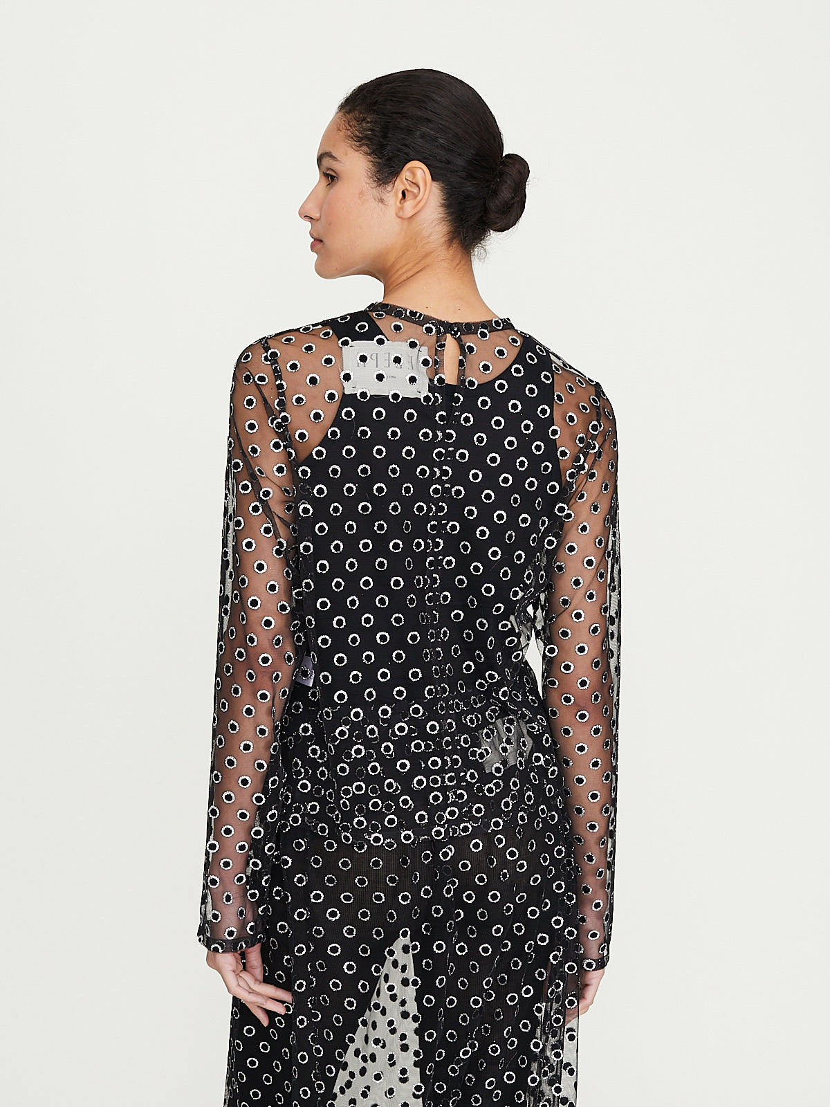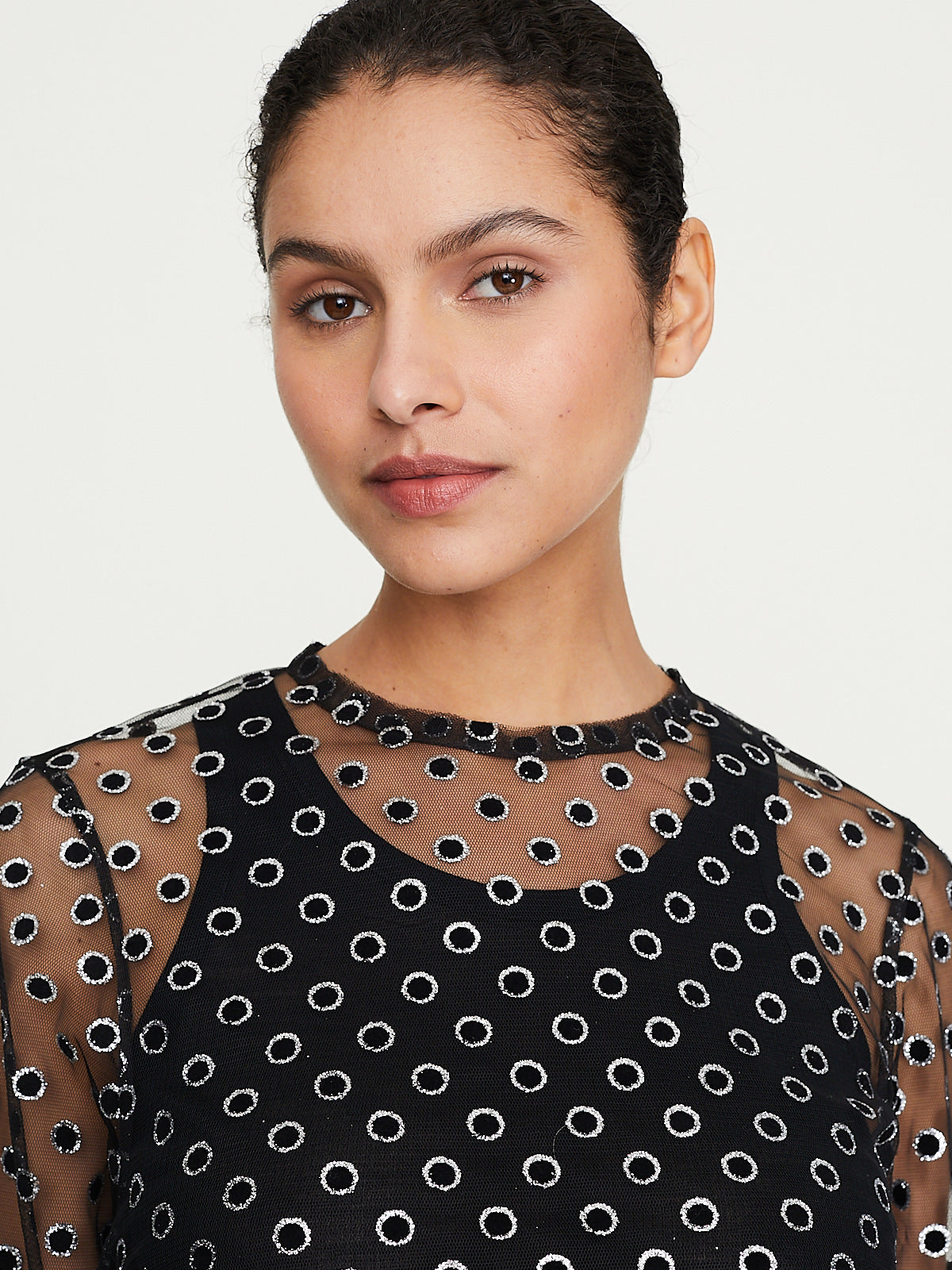 Top in black polyester with shiny silver circle details for a touch of sparkle. Crewneck with a single button closure at the back and long sleeves. Regular fit.