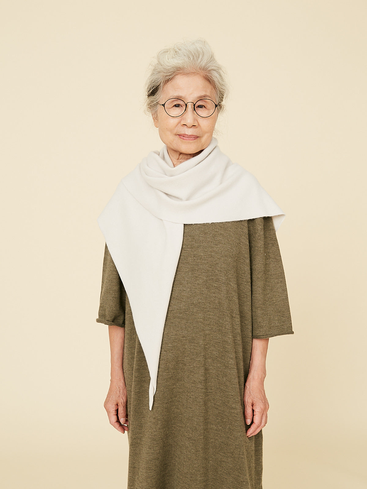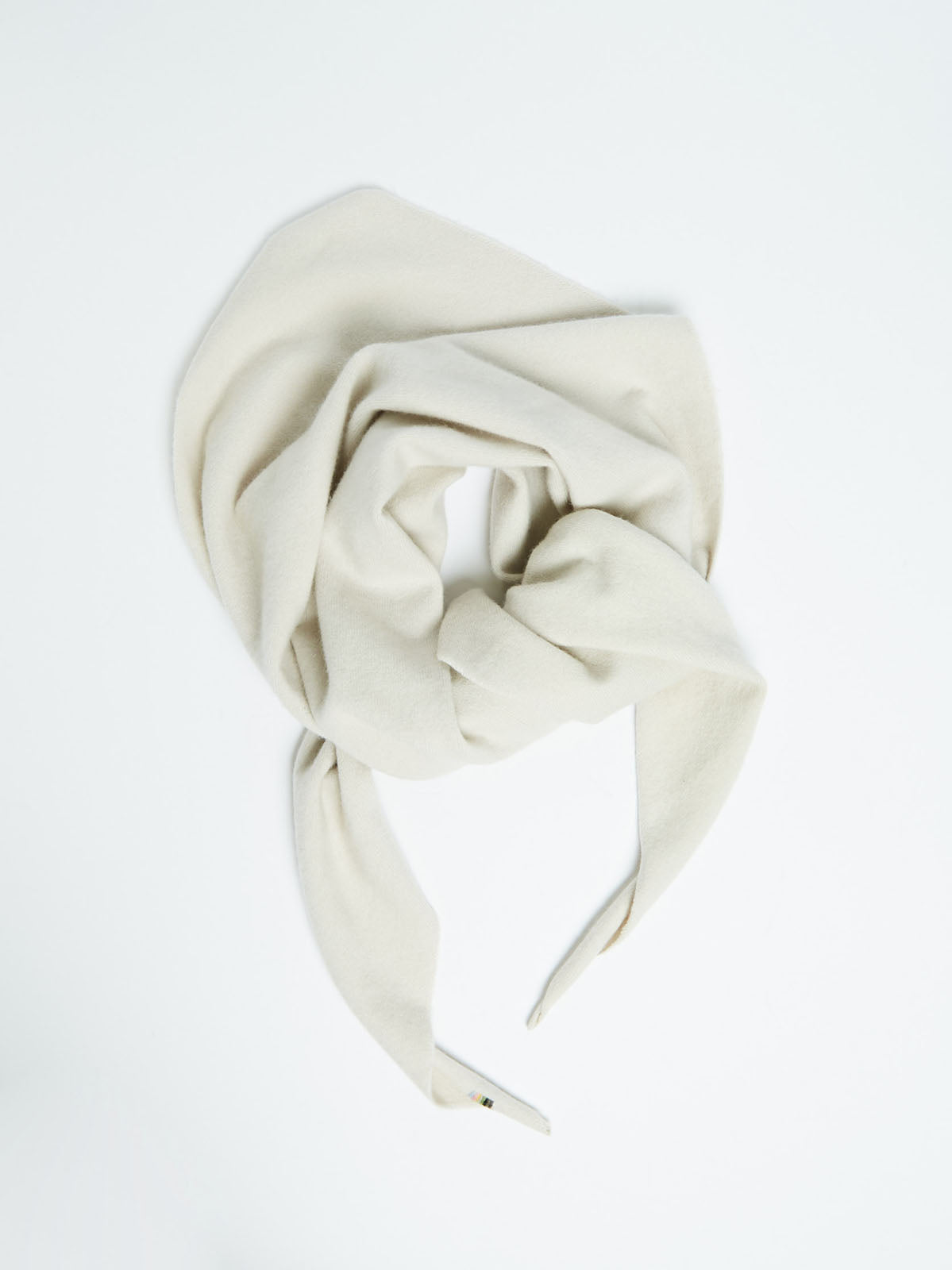 Knitted scarf in an off white cashmere blend. Triangle-shaped and with rolled hems throughout. Features Extreme Cashmere’s signature multi-coloured stitching detail.