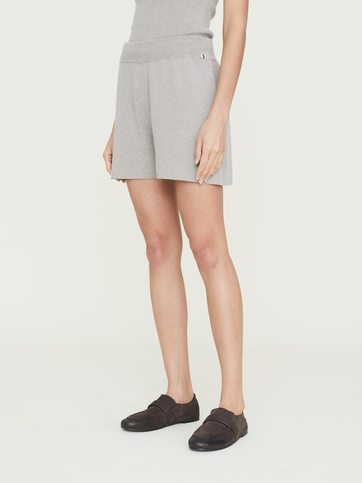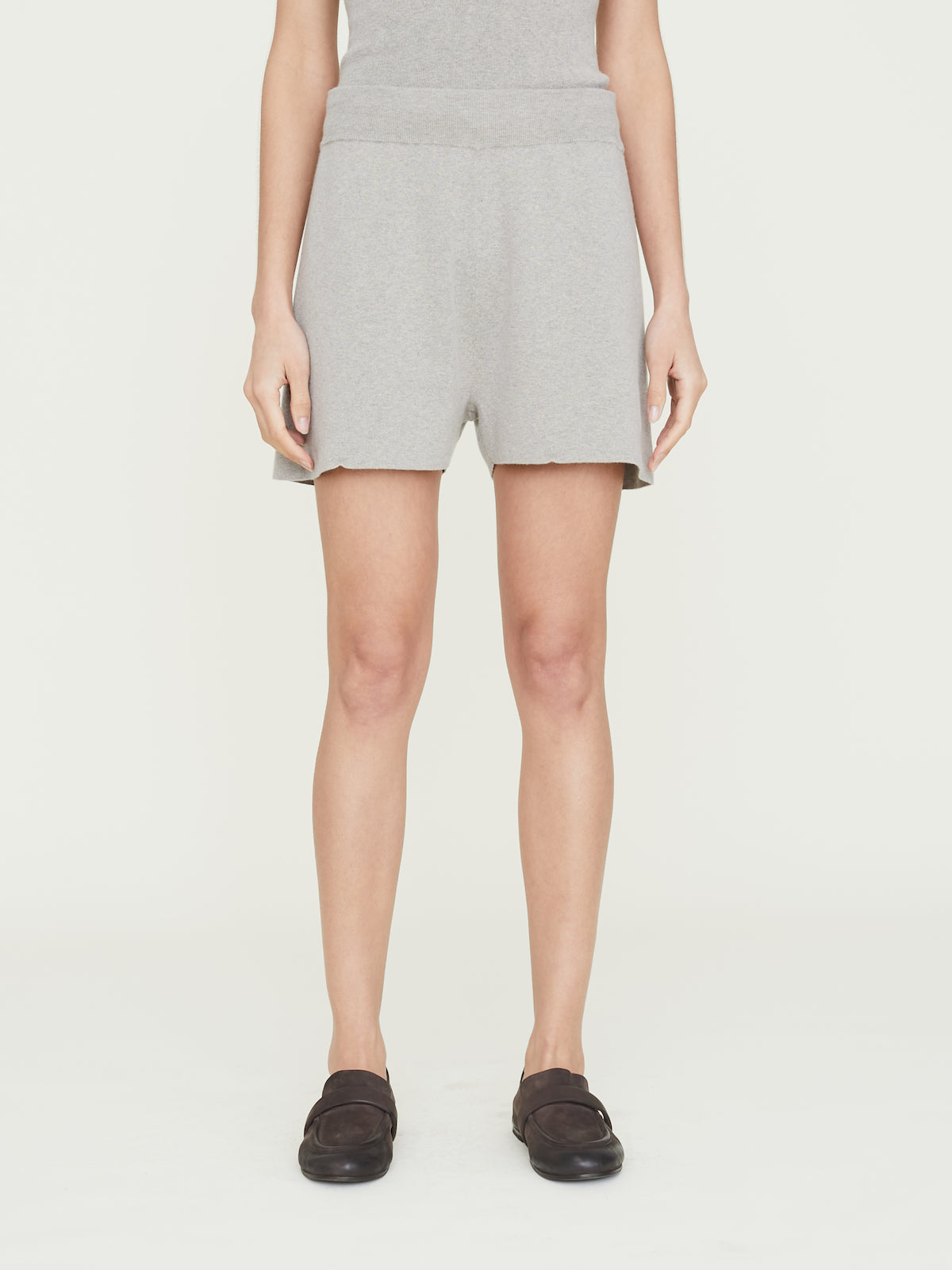 Relaxed short in a beige mini-ribbed cotton/cashmere blend. Pull-on style with a wide ribbed waistband and an internal drawstring. Features raw cuffs and a single patch pockets on the back.