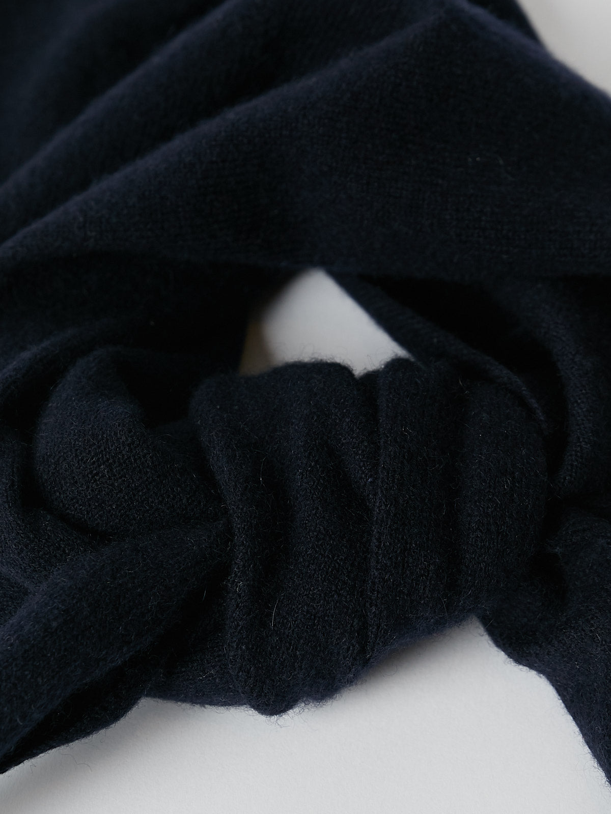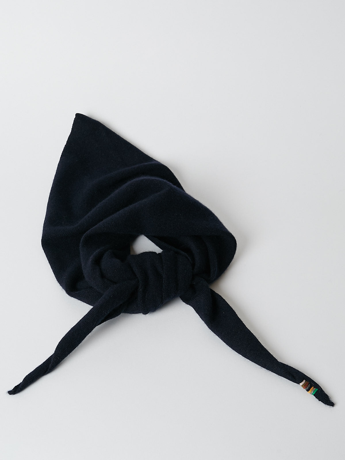 Triangle-shaped bandana in a navy cashmere blend. Raw cut with rolled edges. Features Extreme Cashmere's signature multi-coloured stitching detail. Wear it as a scarf or bandana. Can be washed in the machine.