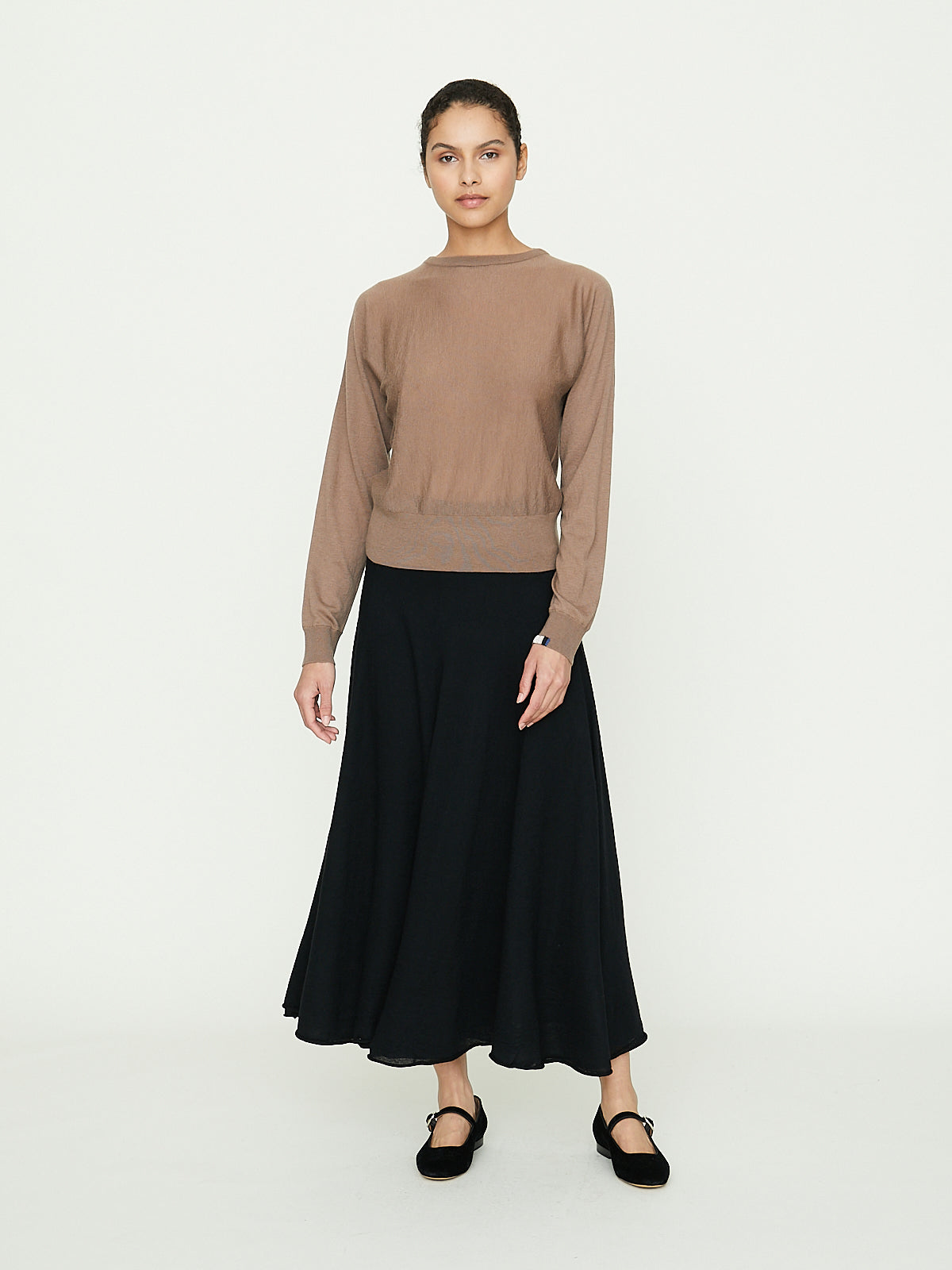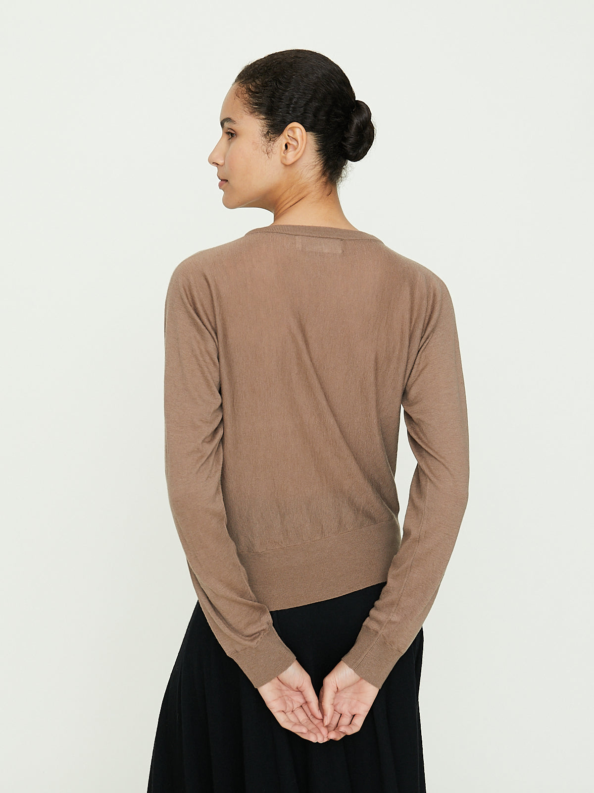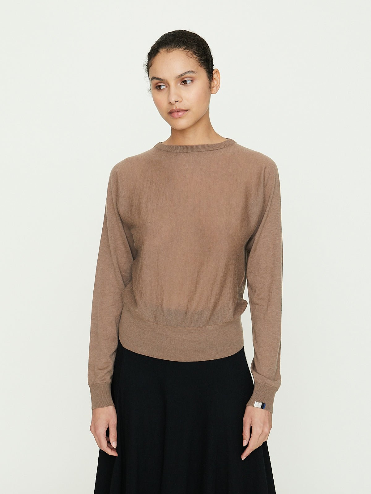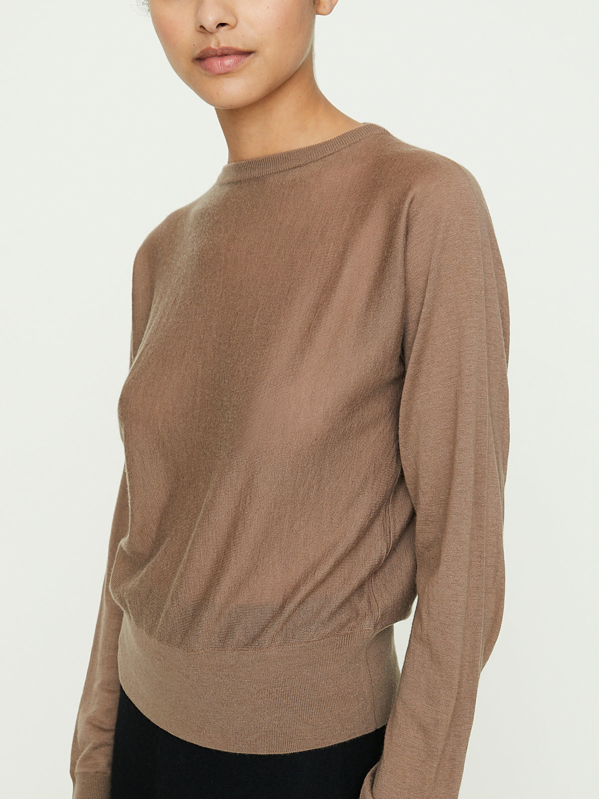 Cropped sweater in lightweight brown super-fine cashmere that is slightly sheer. Crewneck and long subtle bat-sleeves. Rib detail around the neck, cuffs and bottom hem. Relaxed fit.