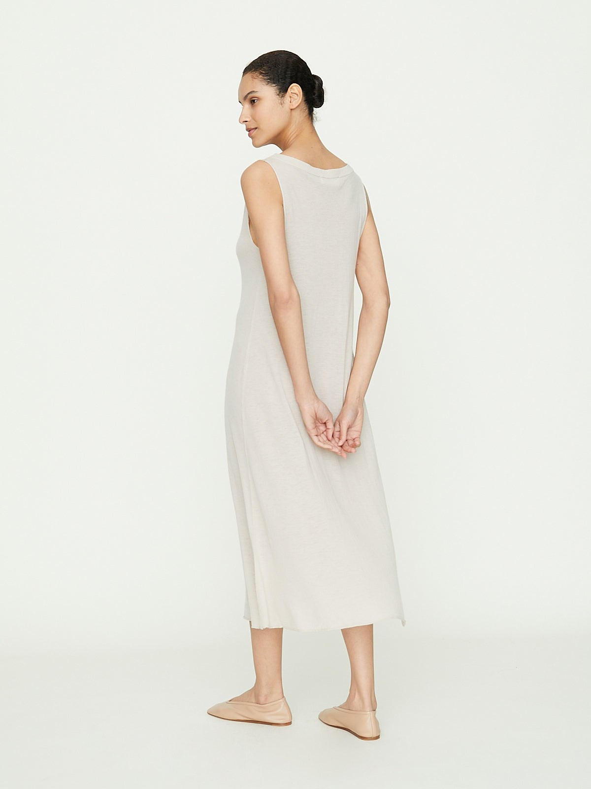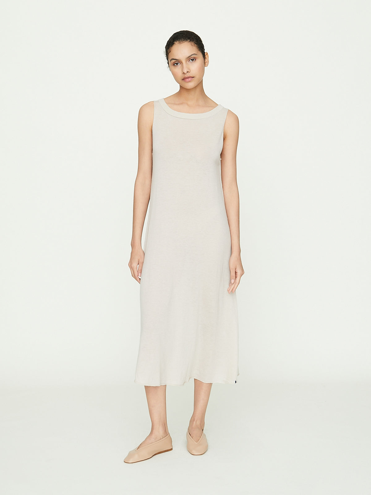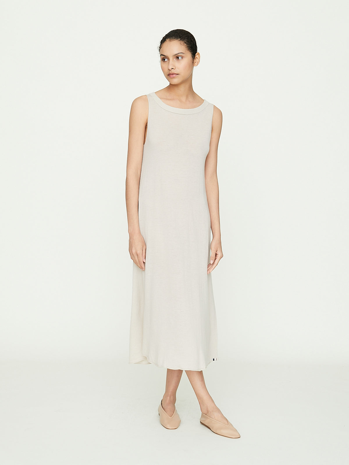 Knee-length dress in lightweight pale beige super-fine cashmere that is slightly sheer. Boatneck and sleeveless. A-line silhouette. Ribbed detail around the neck and a rolled bottom hem.