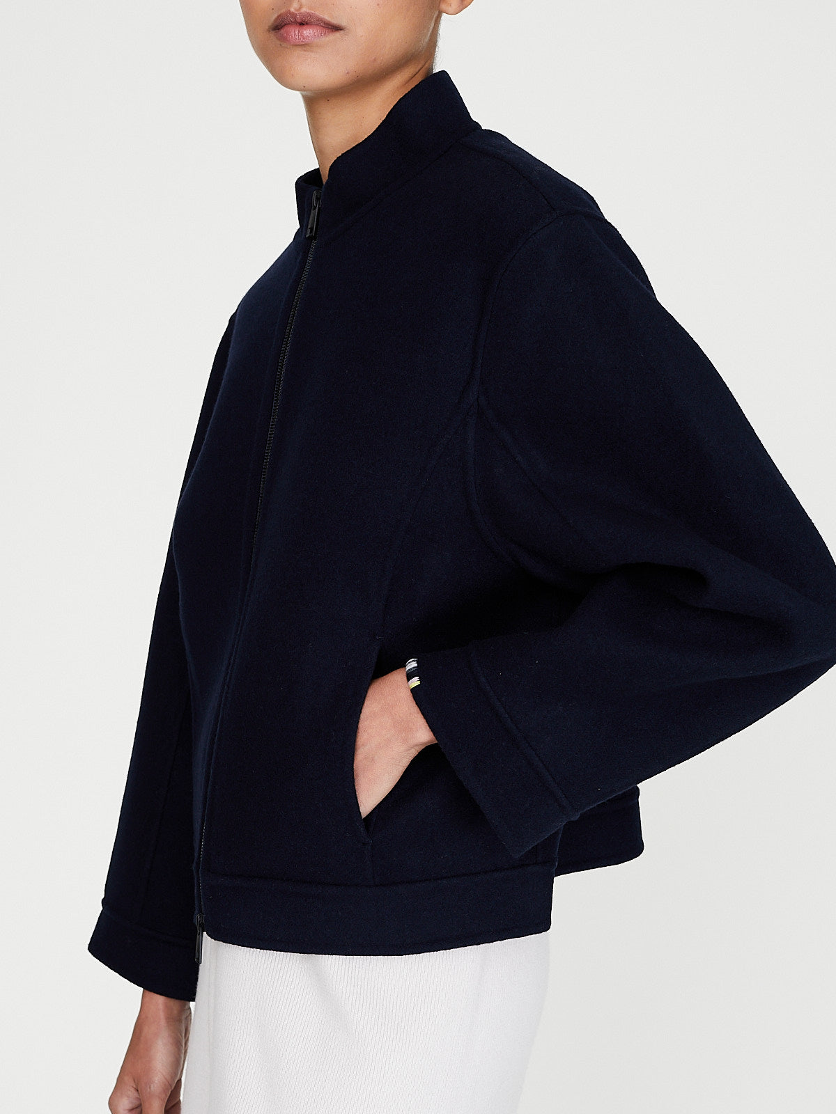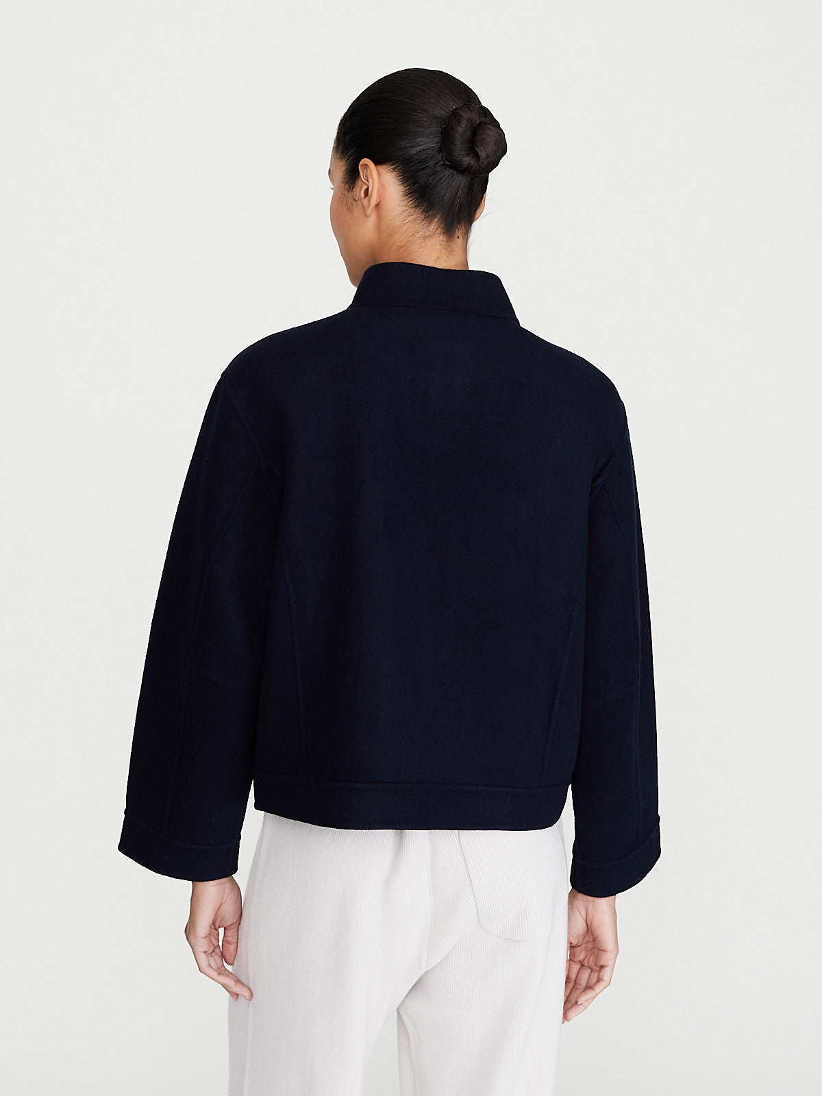 Cropped jacket in navy double-faced wool/cashmere inspired by a classic motorcycle jacket. Stand collar, front two-way zipper fastening and cropped sleeves with a dropped shoulder. Slip pockets on the front. Unisex.