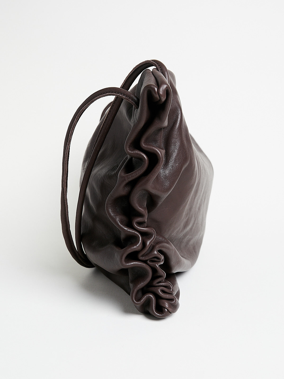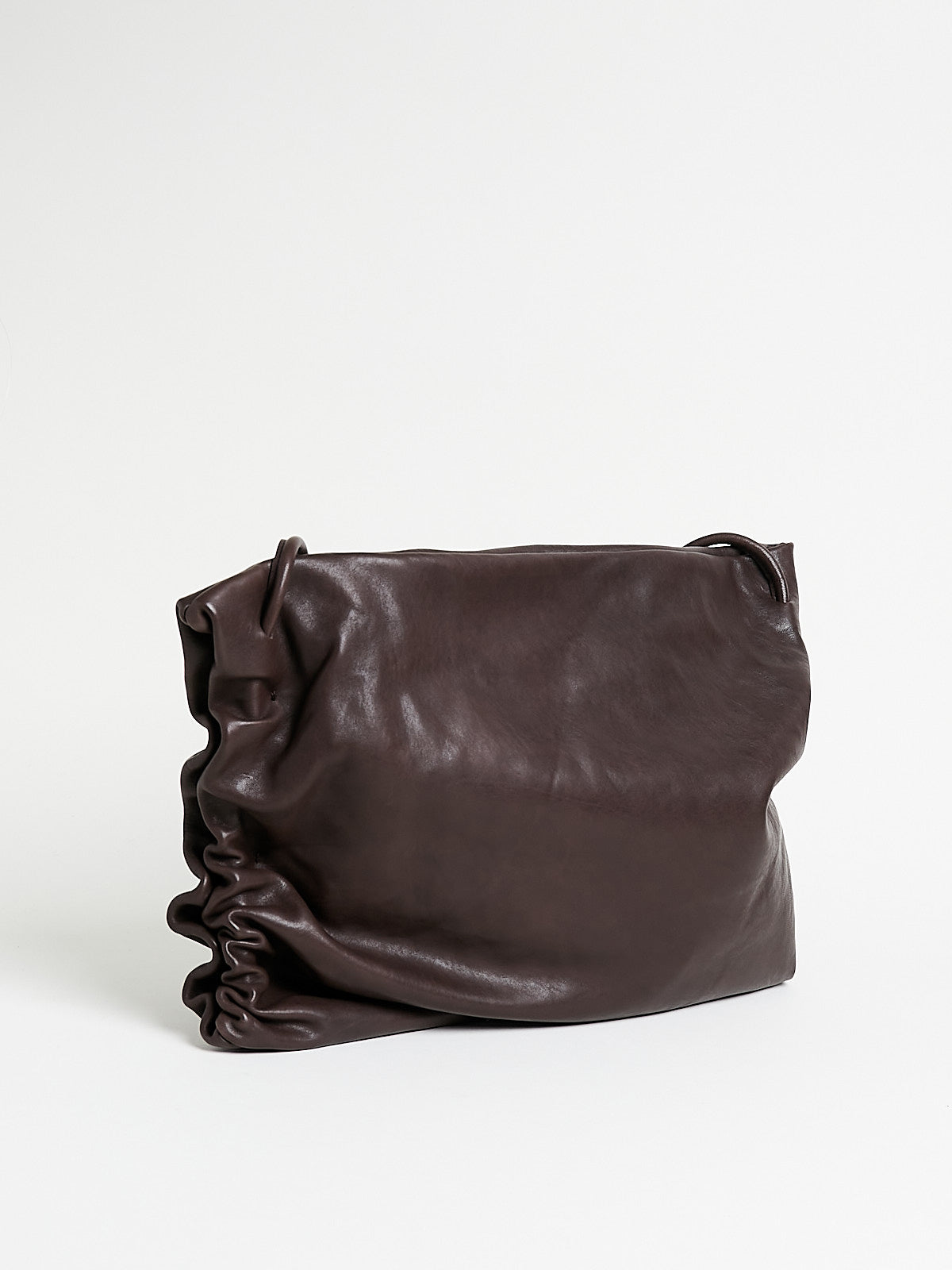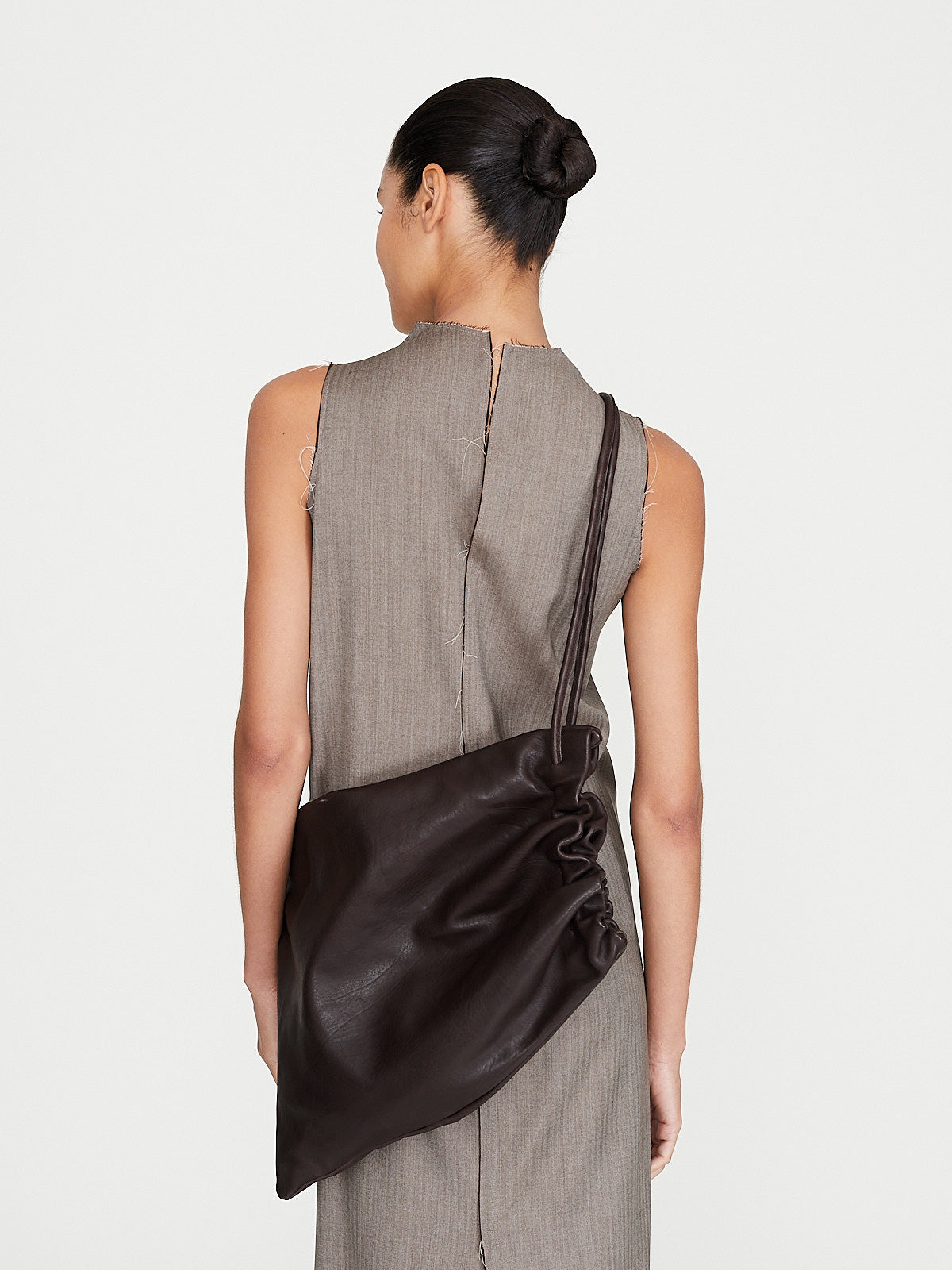 Messenger bag in brown lamb leather. Twin sliding crossbody straps and a zip fastening. Features a gathering detail on one side and an Internal patch pocket. Unlined.
