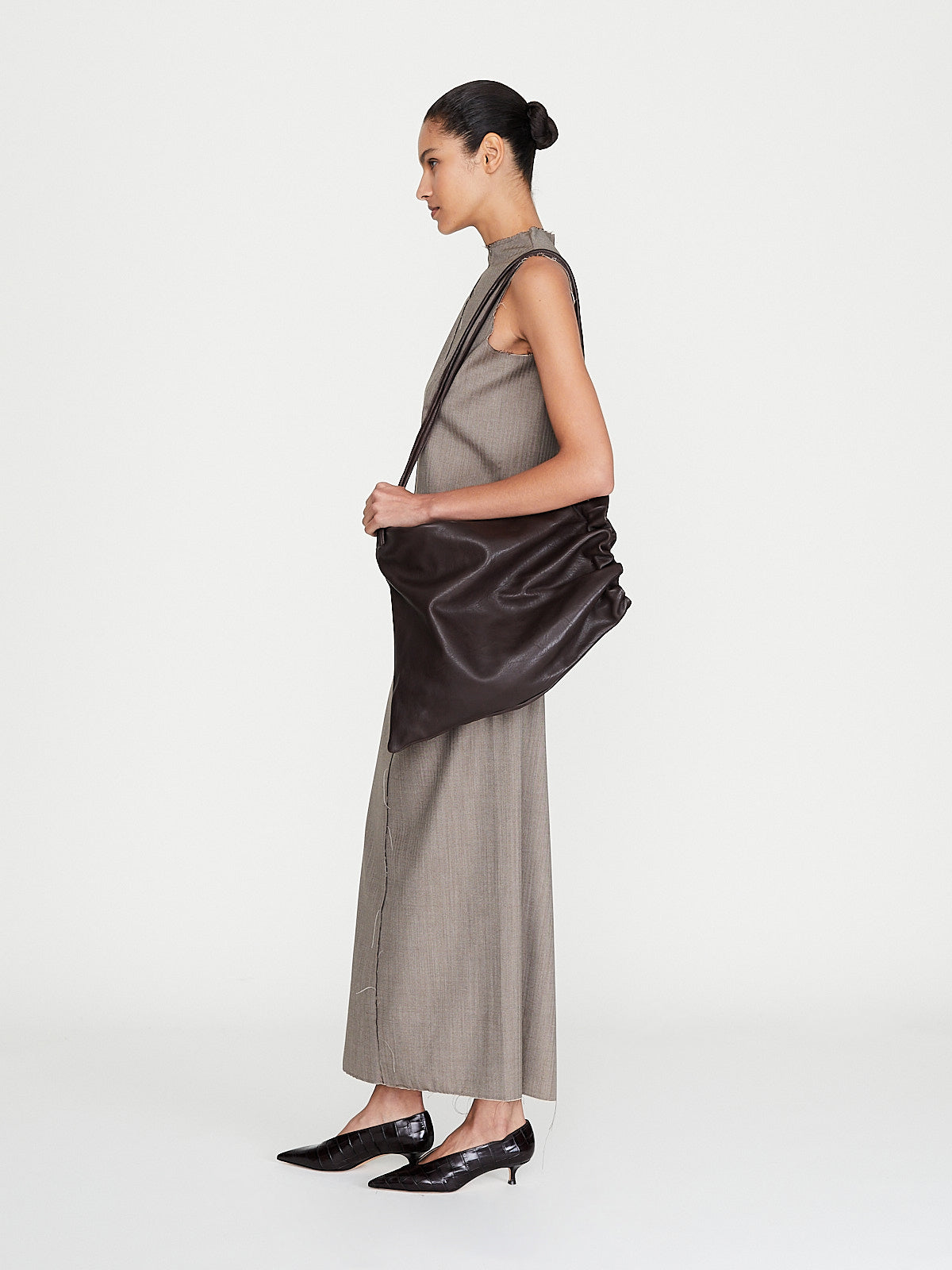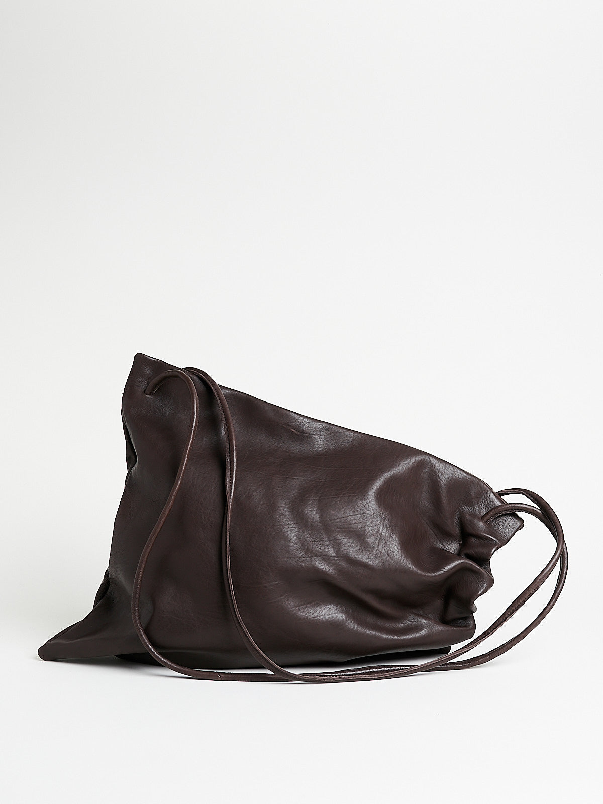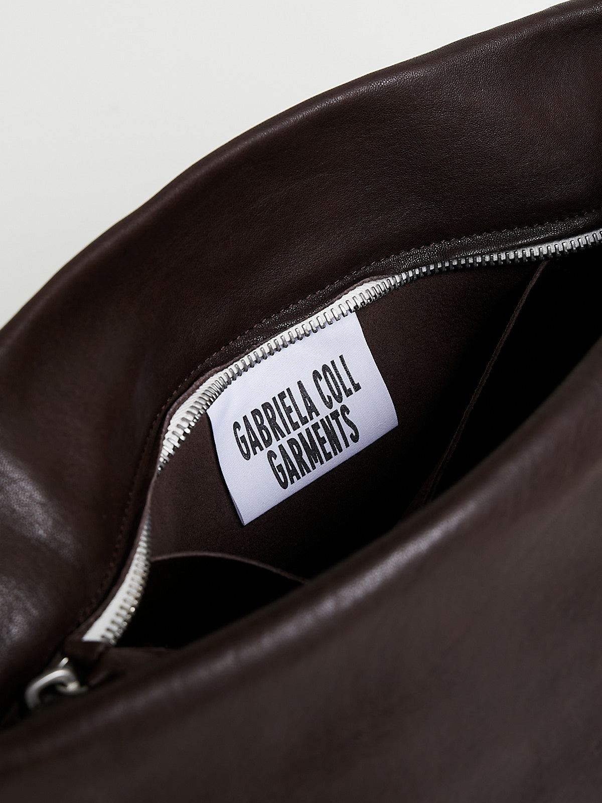 Messenger bag in brown lamb leather. Twin sliding crossbody straps and a zip fastening. Features a gathering detail on one side and an Internal patch pocket. Unlined.