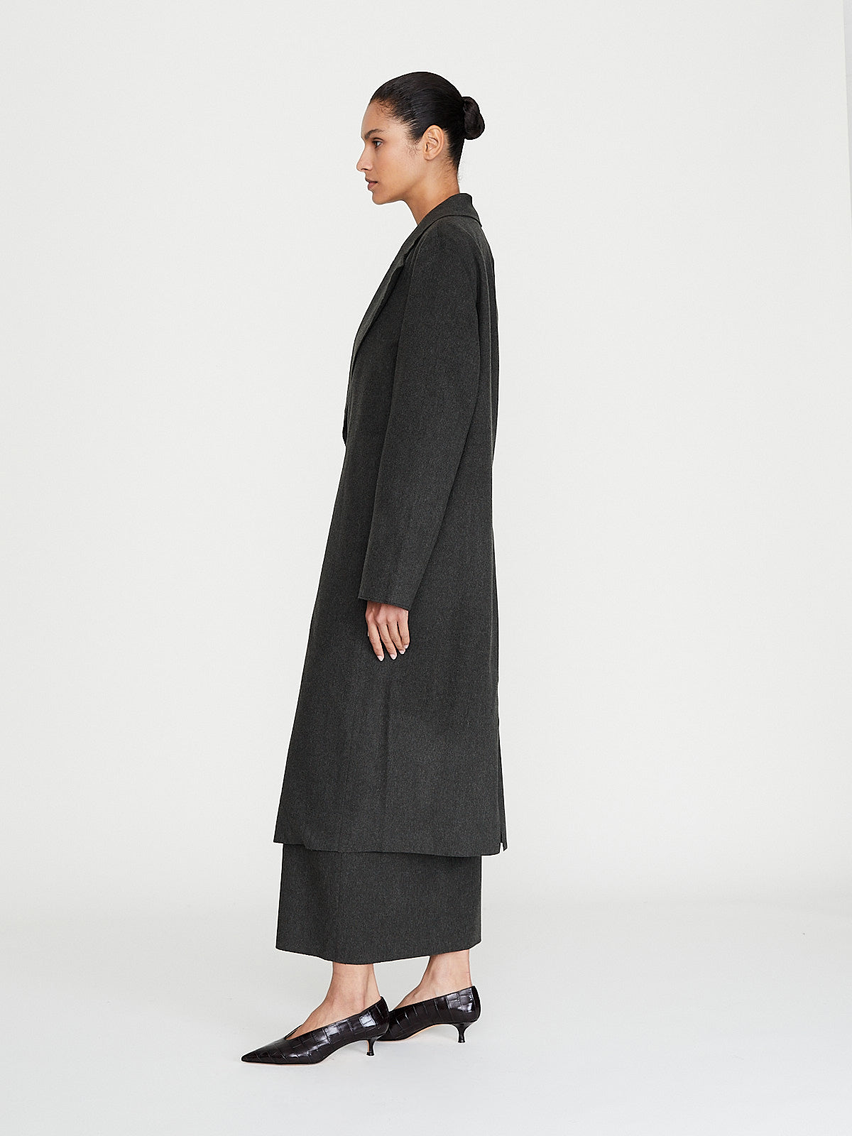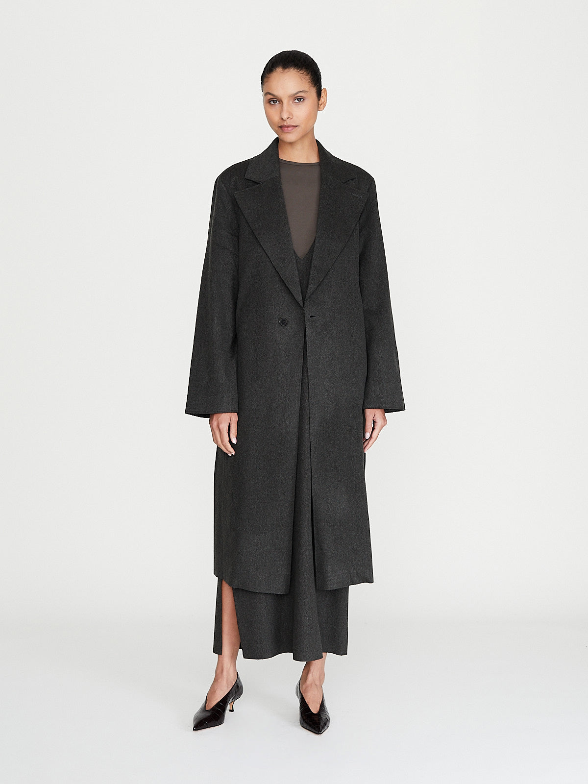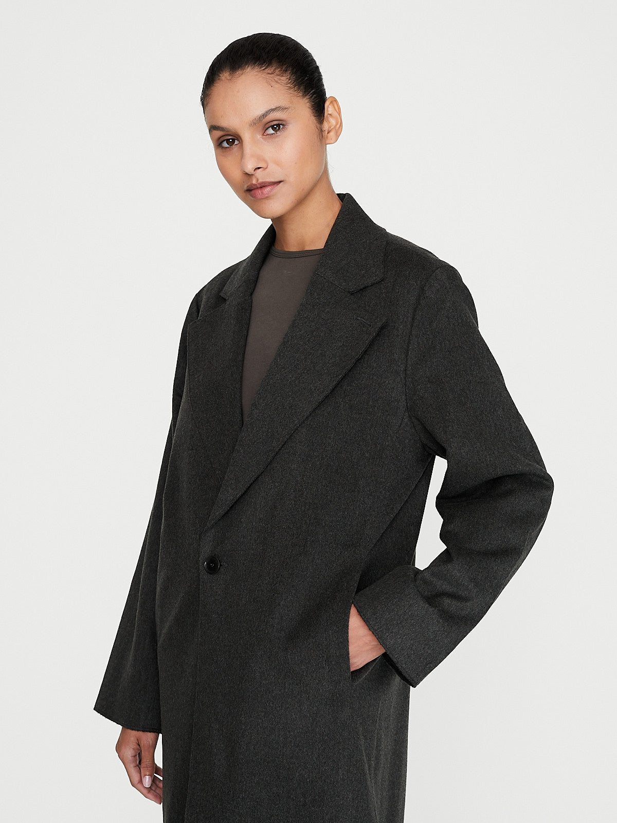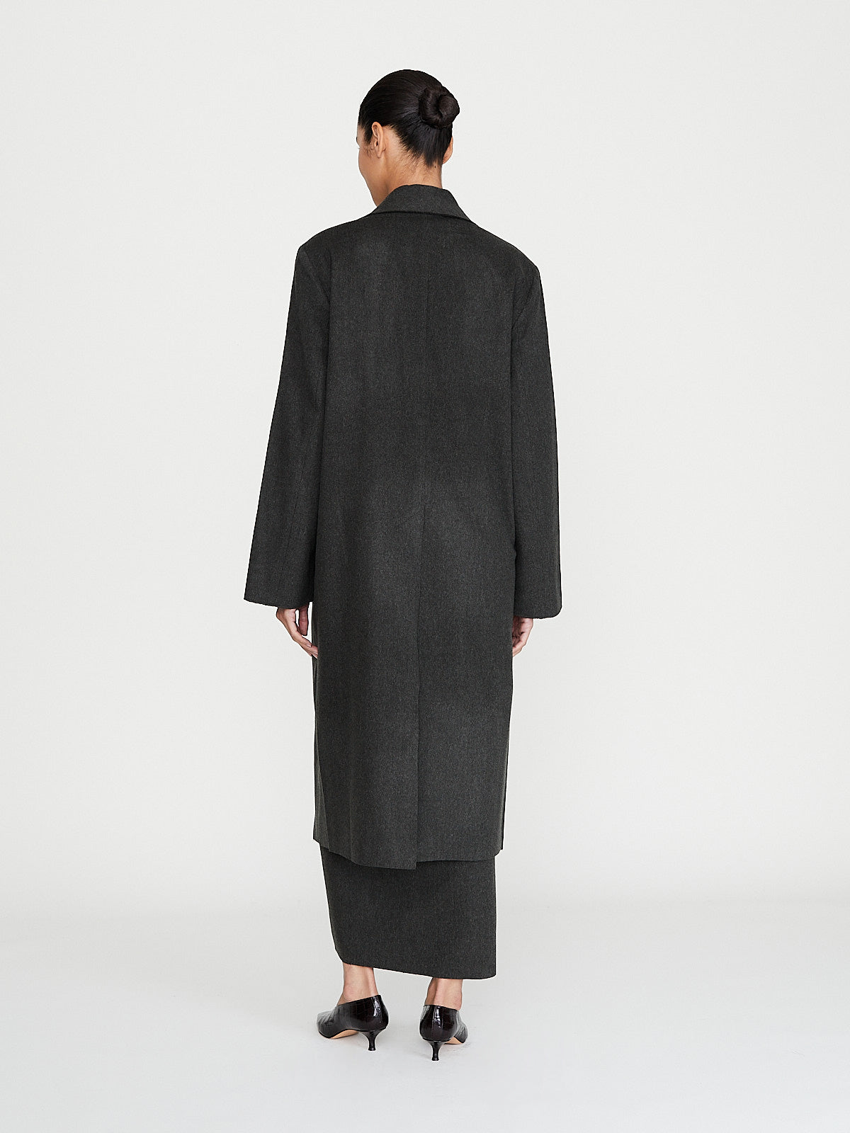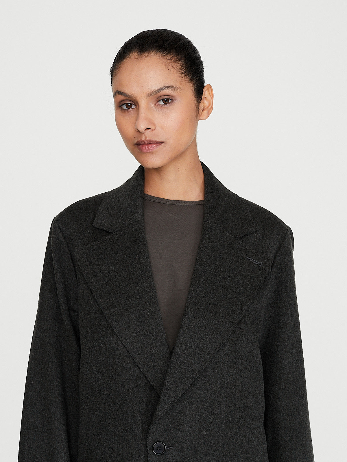 Oversized coat in a dark green heavy Loro Piana Suri wool. Oversized collar with notched lapels that conceals a second button, allowing the jacket to be worn fully fastened with a standing collar. Side seam pocket and a rear vent. Fully lined. The linings raw edges are visible at the cuffs and bottom hem.