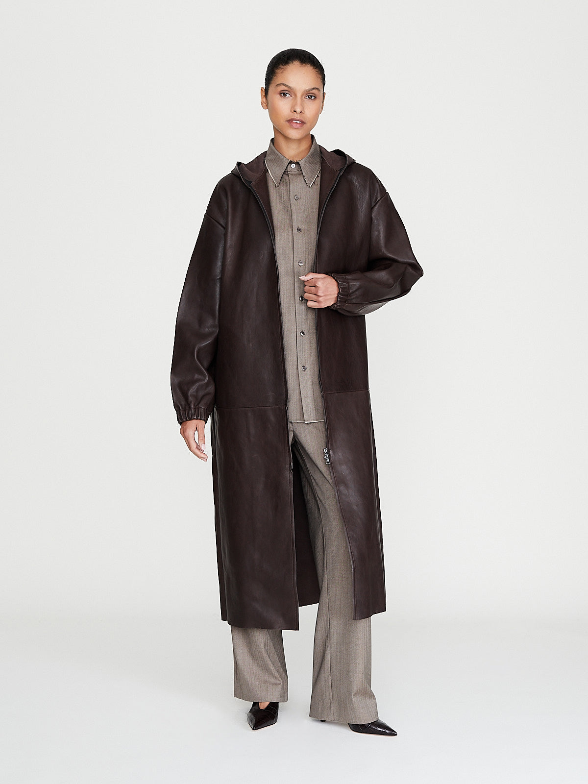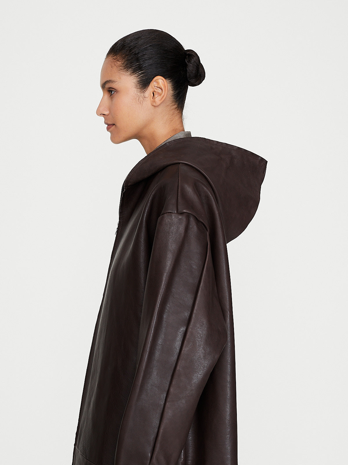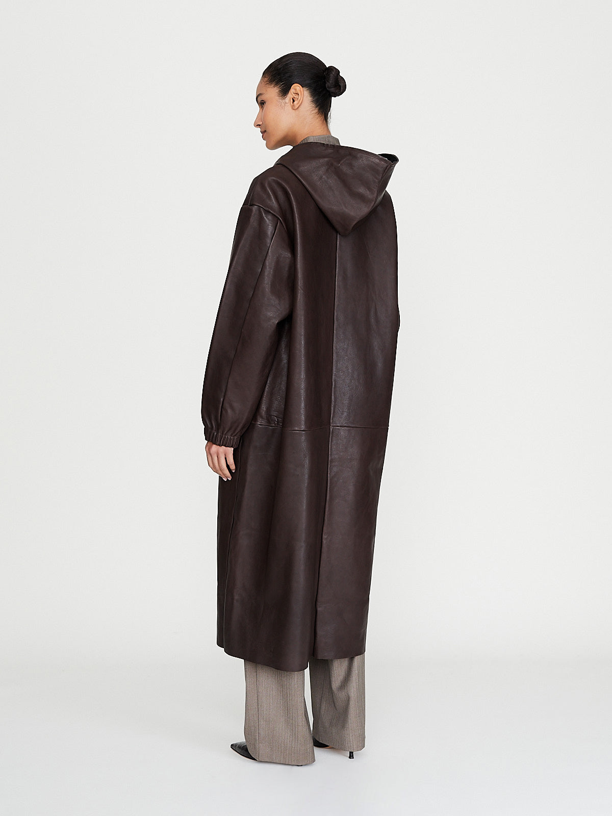 Oversized hooded coat in brown leather. Front two-way zipper closure and long sleeves with a dropped shoulder. Side seam pockets. Features gathered cuffs. Subtle cocoon silhouette and mid-calf length. Fully lined.