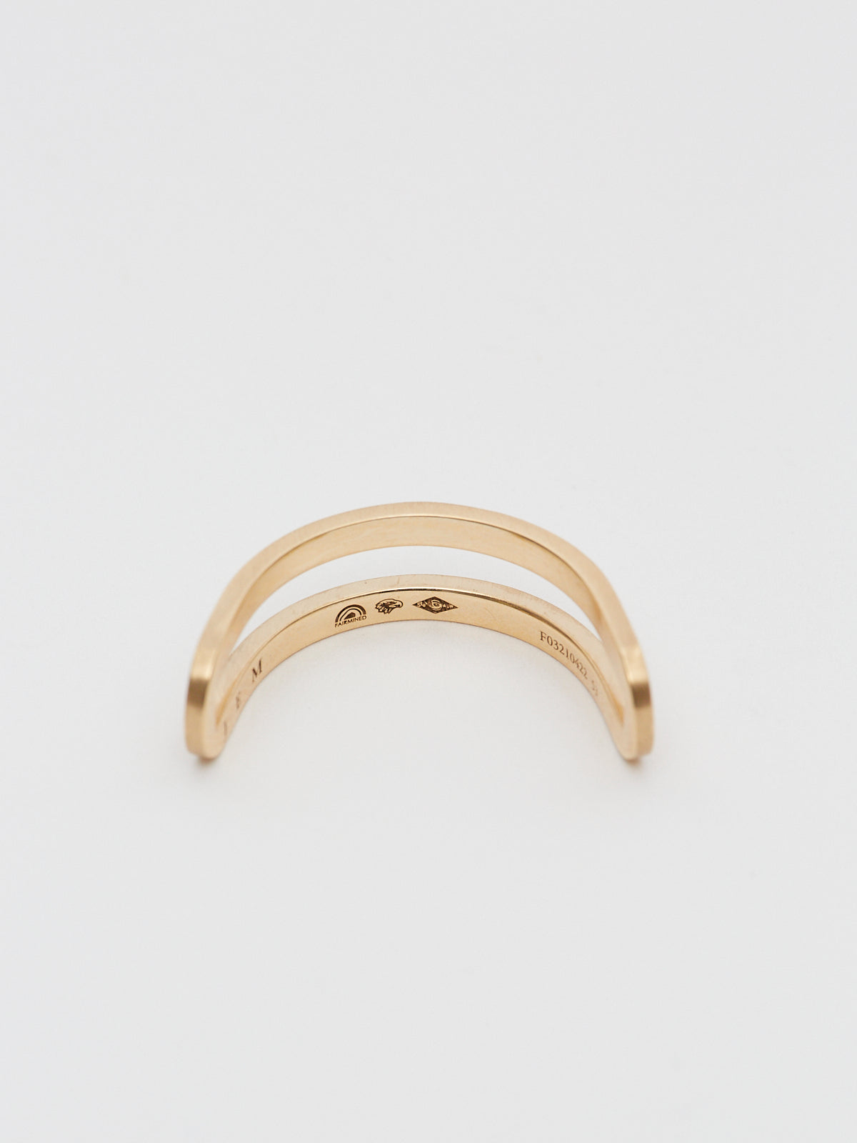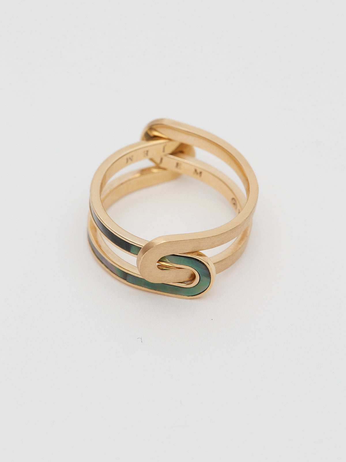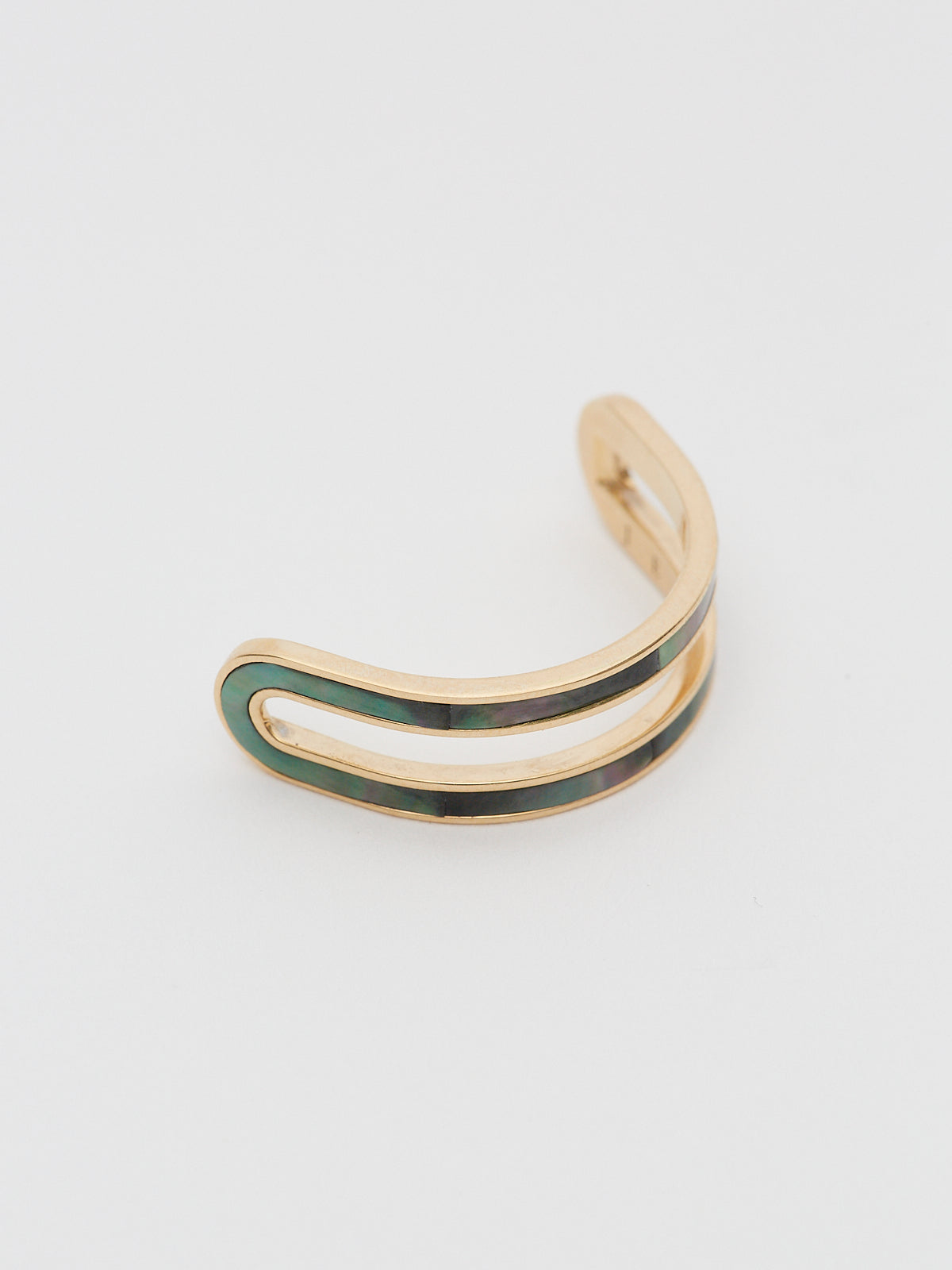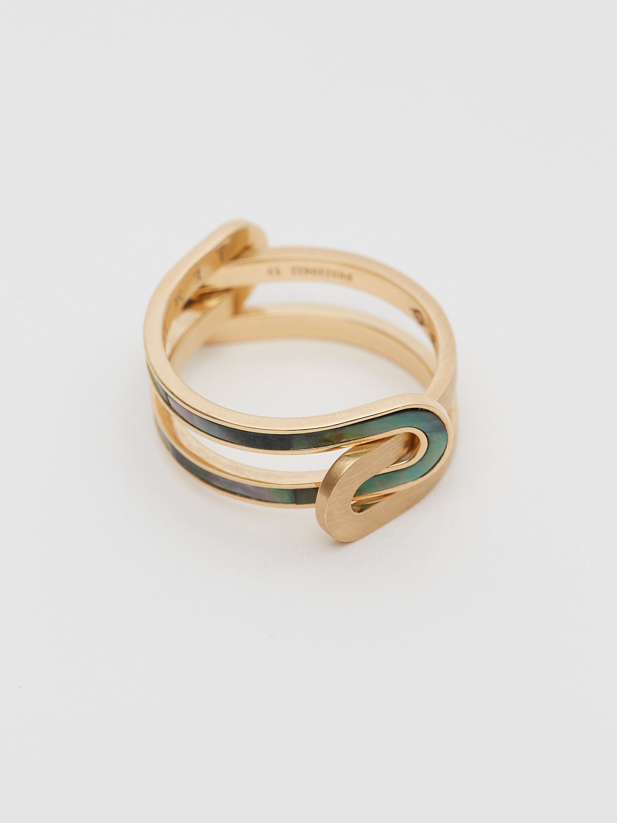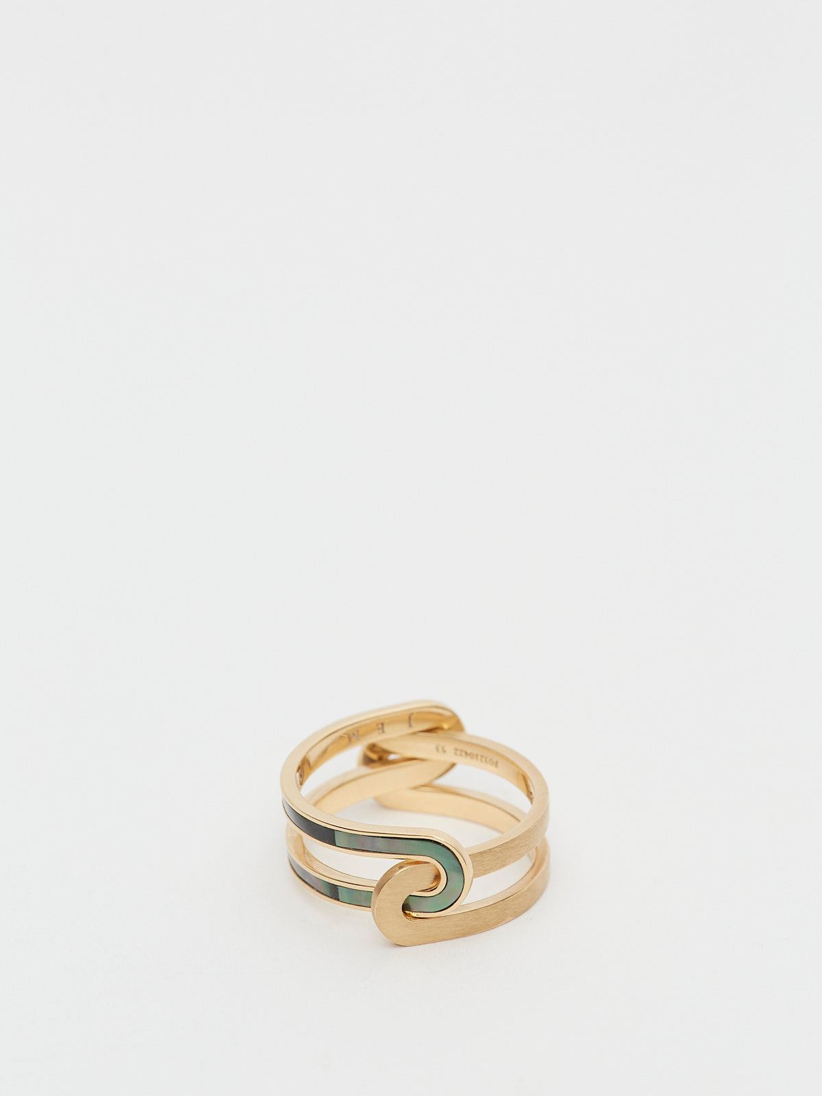 Ring in 18k ethical Fairmined yellow gold inlaid with green mother of pearl on one side. This ring is made from two half-rings that you assemble together.