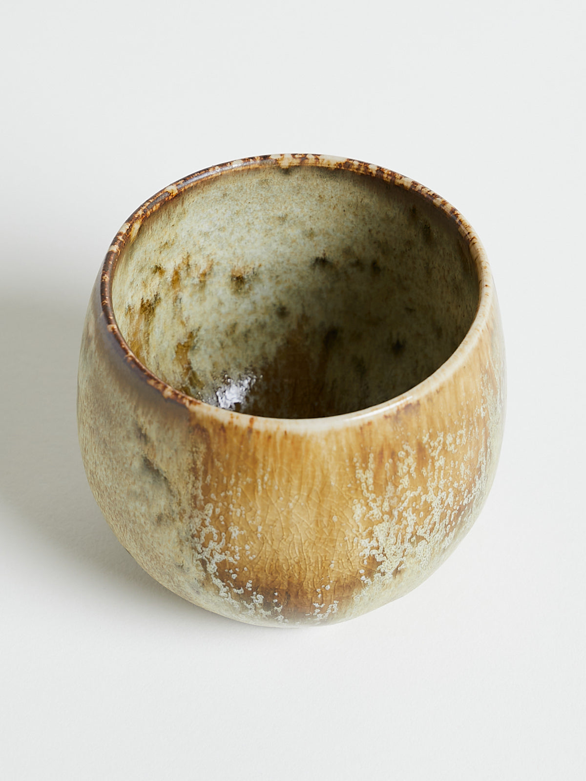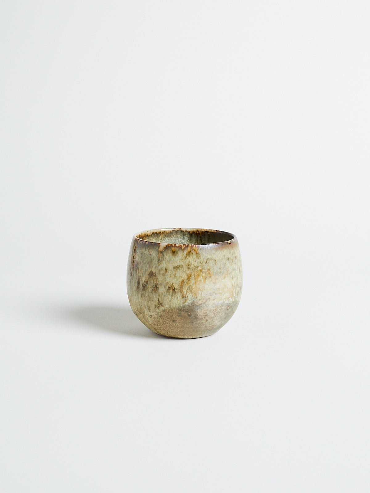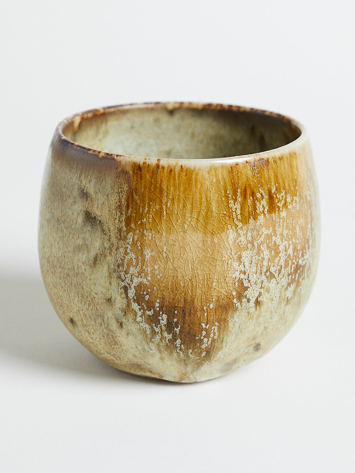 Hand-thrown and hand-glazed cup in shades of white and yellow. Each piece is created using ancient wheel-turning and glazing methods.