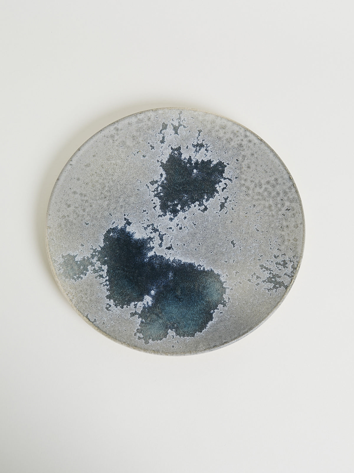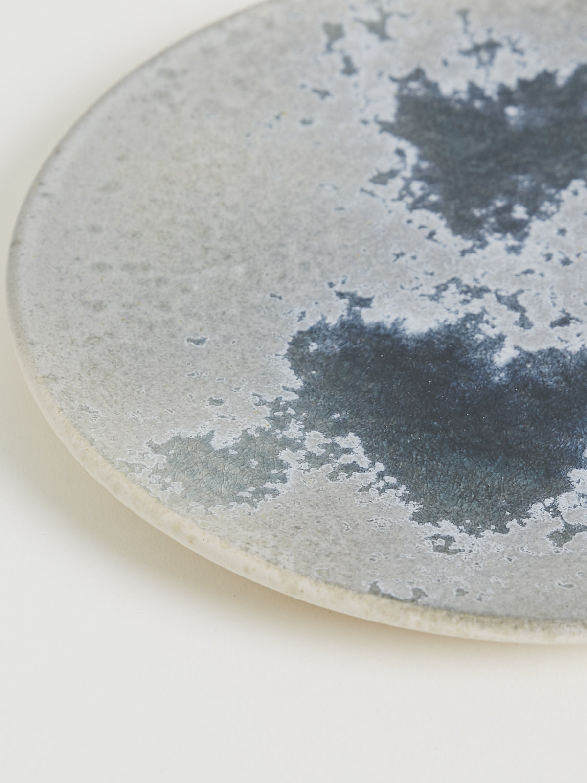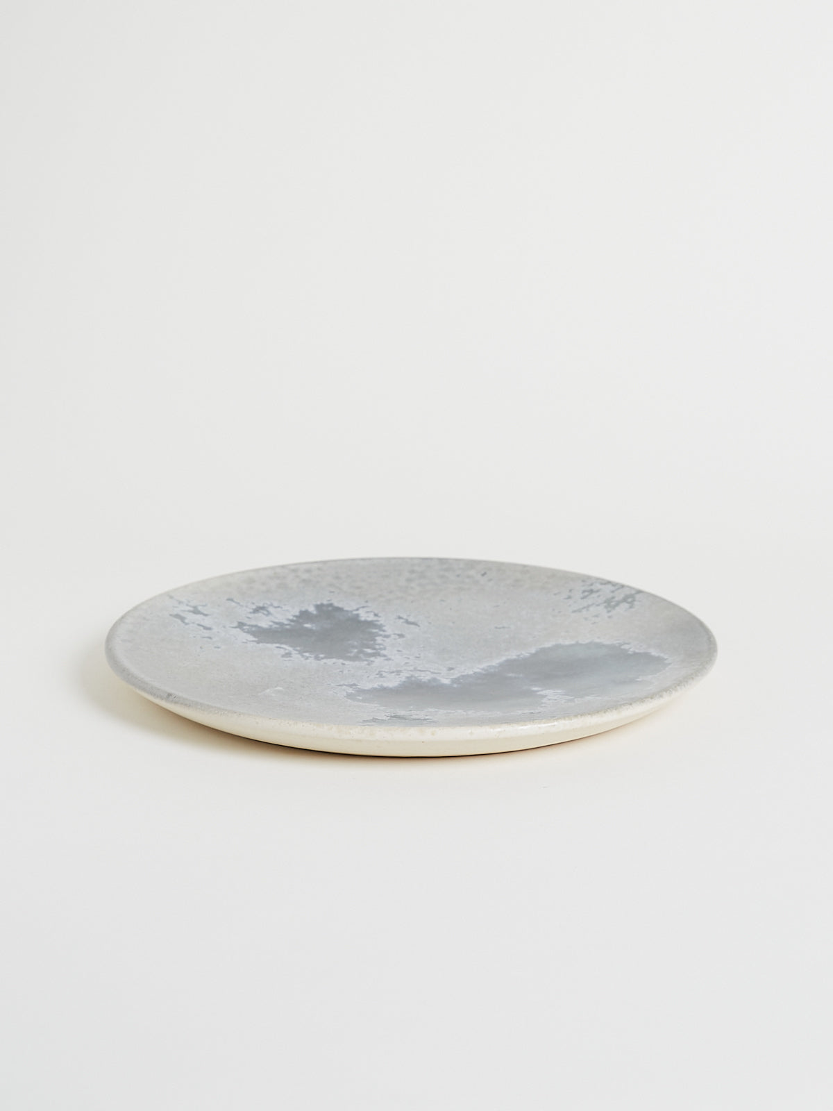 Hand-thrown, hand-glazed large ceramic plate in white and soft blue. Each piece is created using ancient wheel-turning and glazing methods.