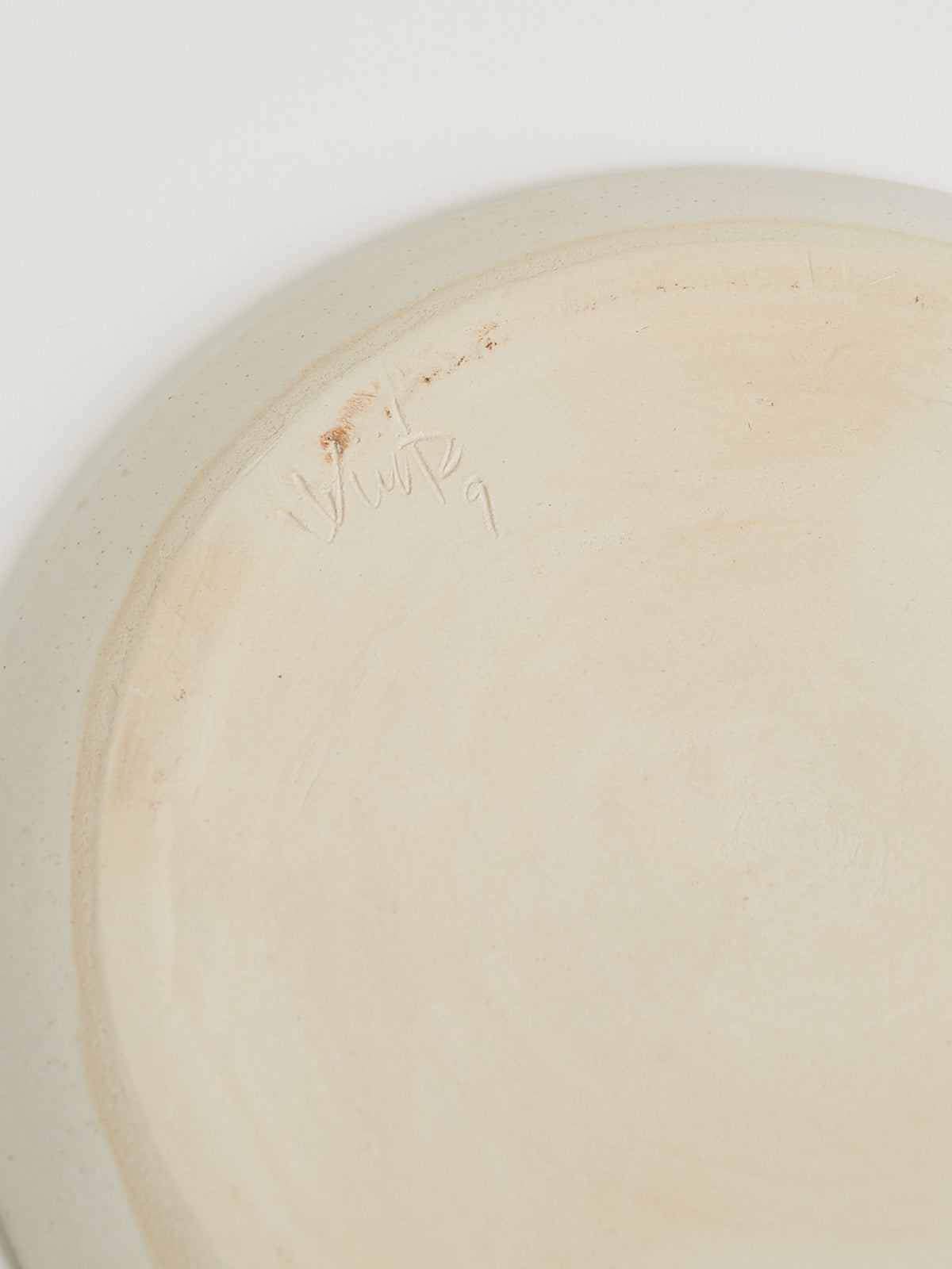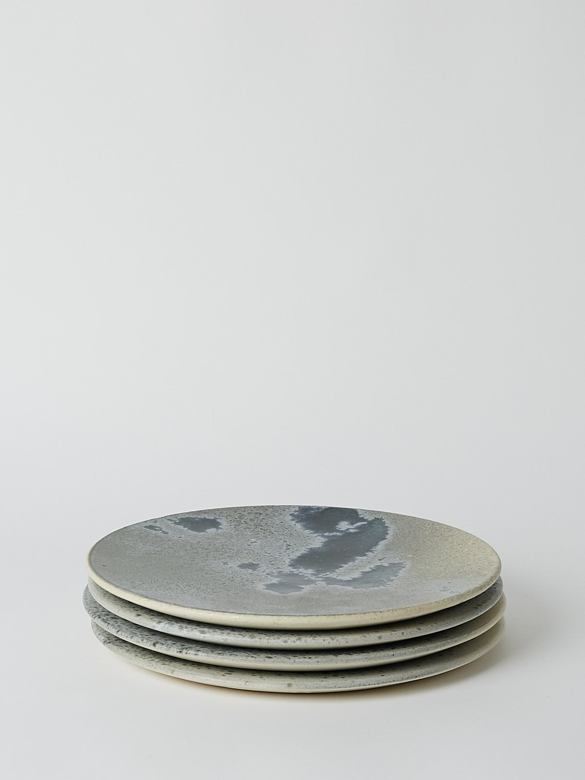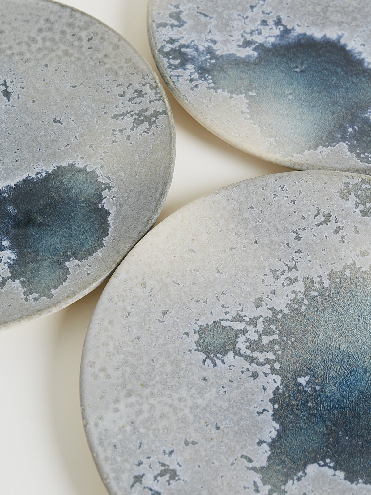 Hand-thrown, hand-glazed large ceramic plate in white and soft blue. Each piece is created using ancient wheel-turning and glazing methods.