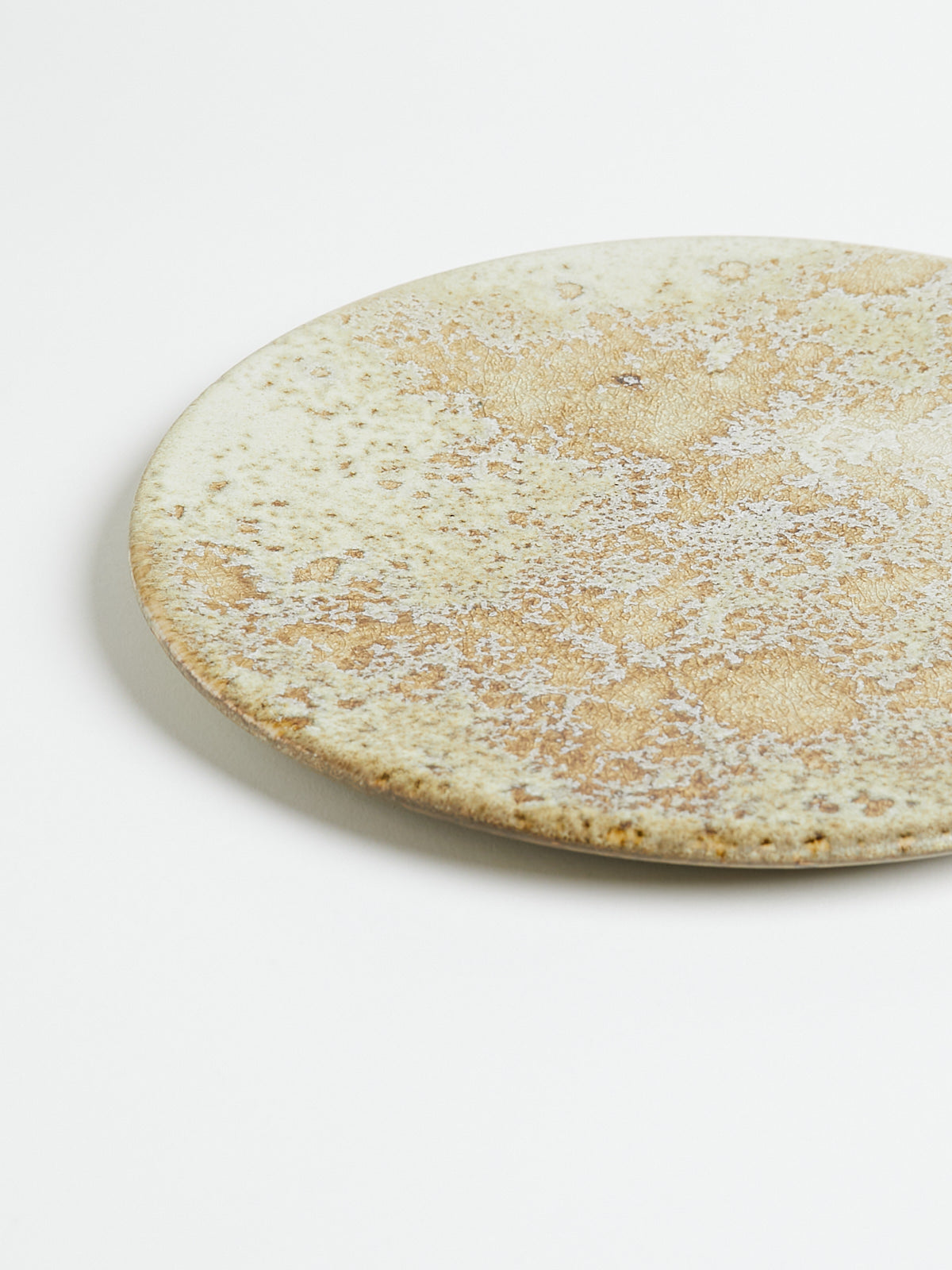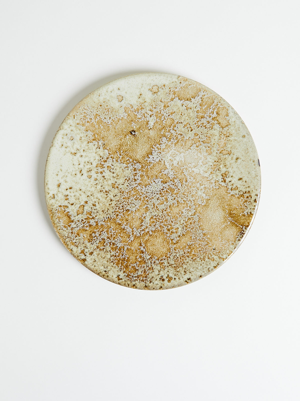 Hand-thrown, hand-glazed large ceramic plate in white and yellow shades. Each piece is created using ancient wheel-turning and glazing methods.
