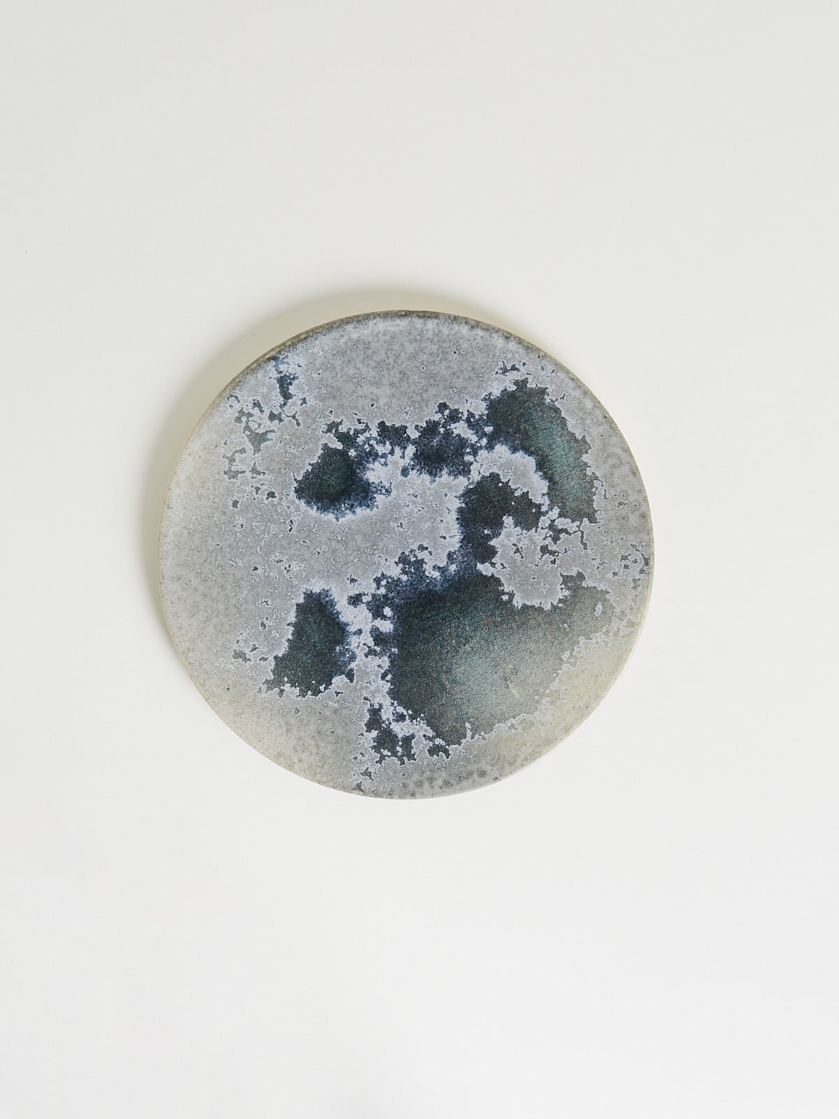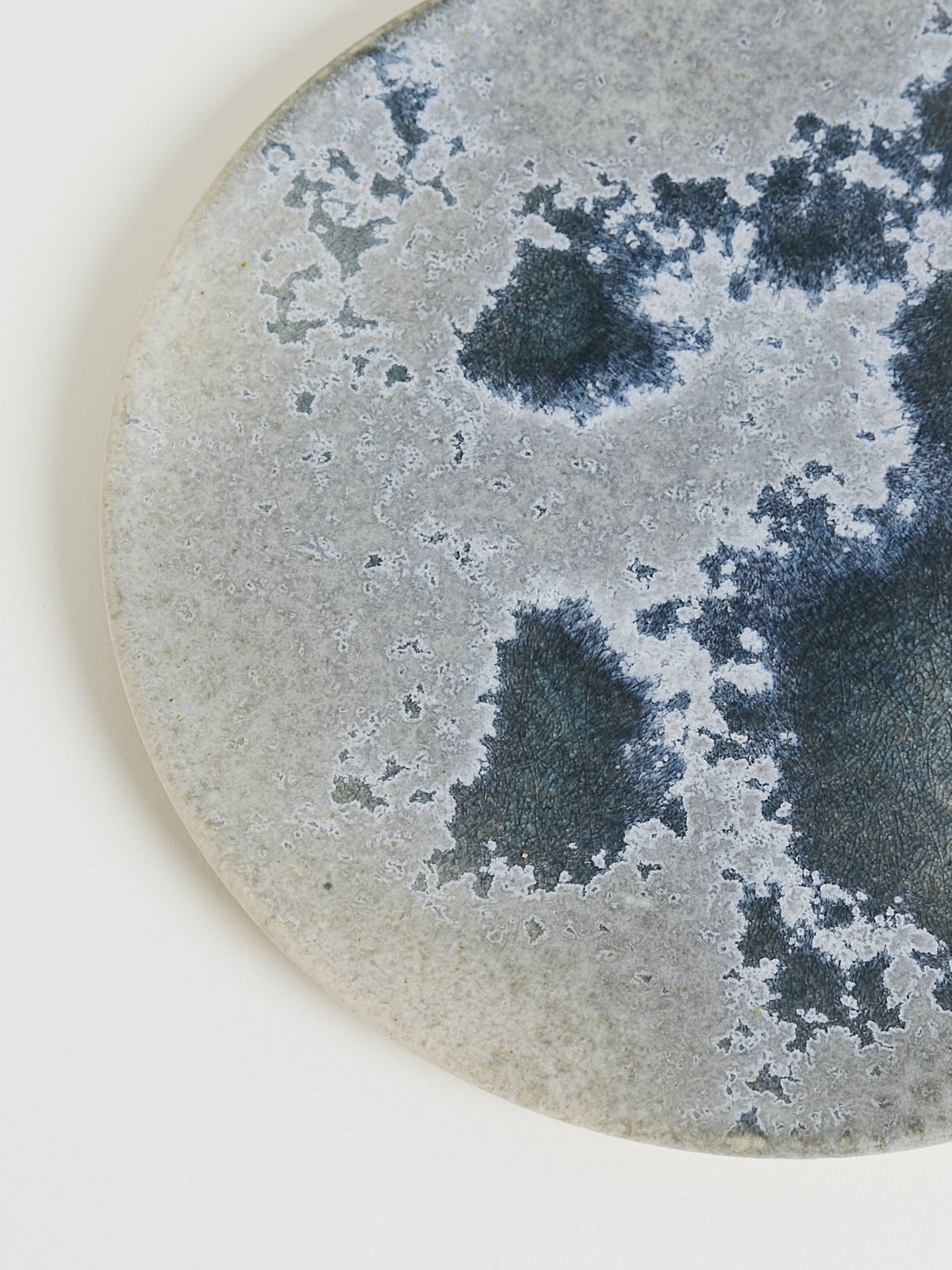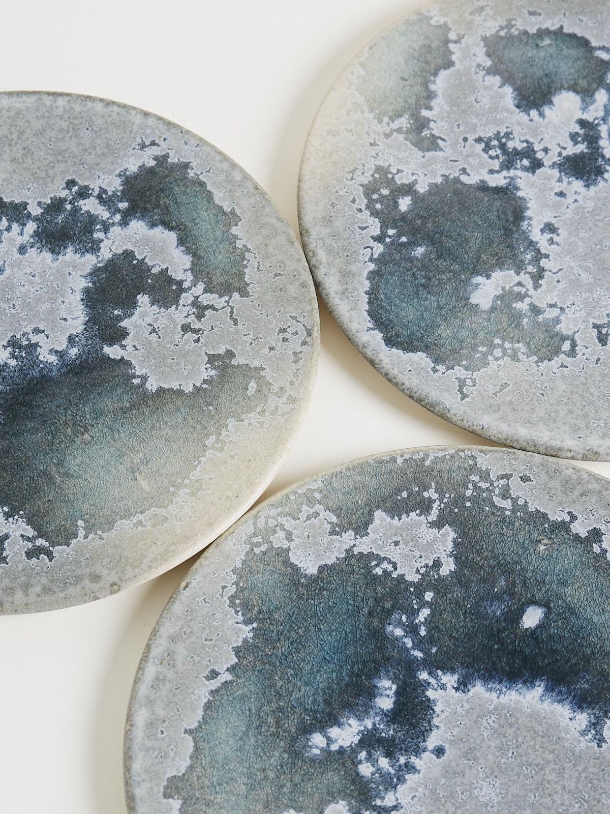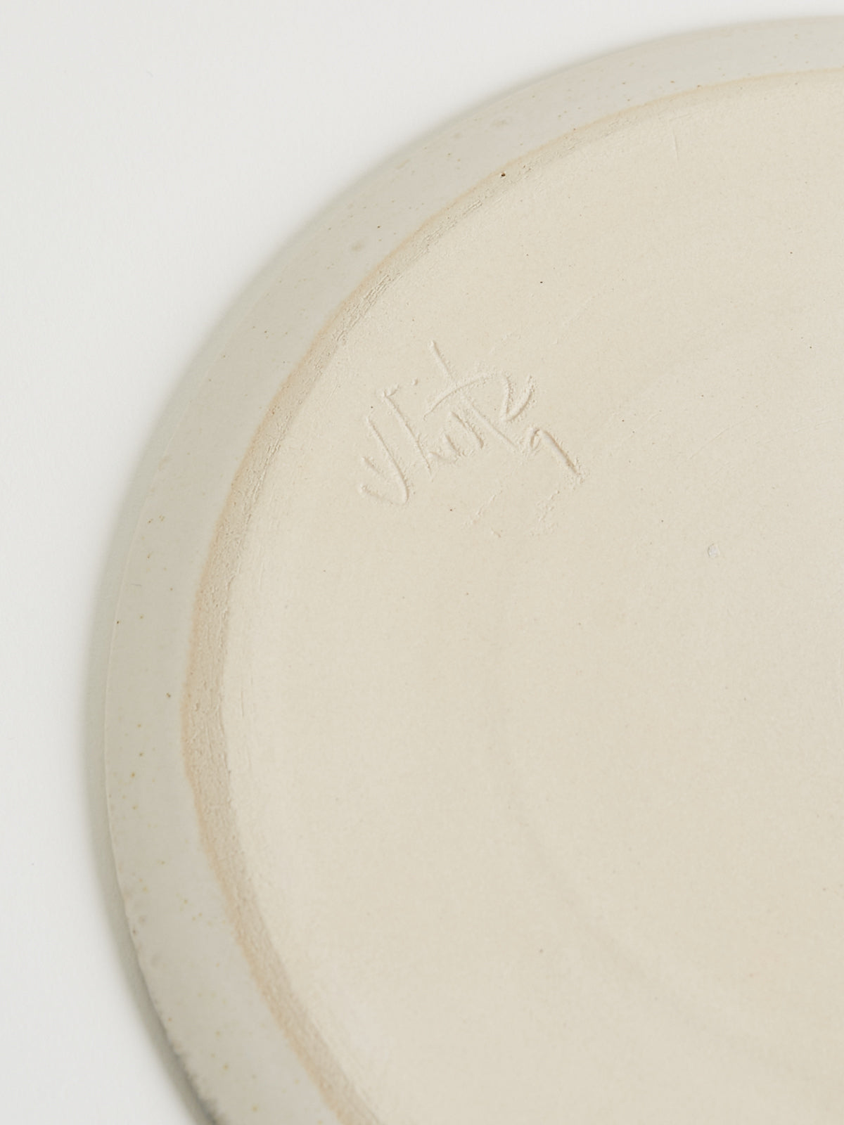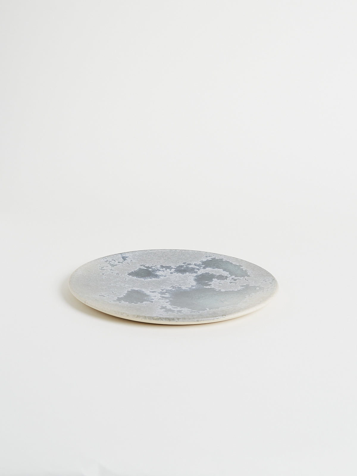 Hand-thrown and hand-glazed ceramic plate in white and soft blue. Each piece is created using ancient wheel-turning and glazing methods.