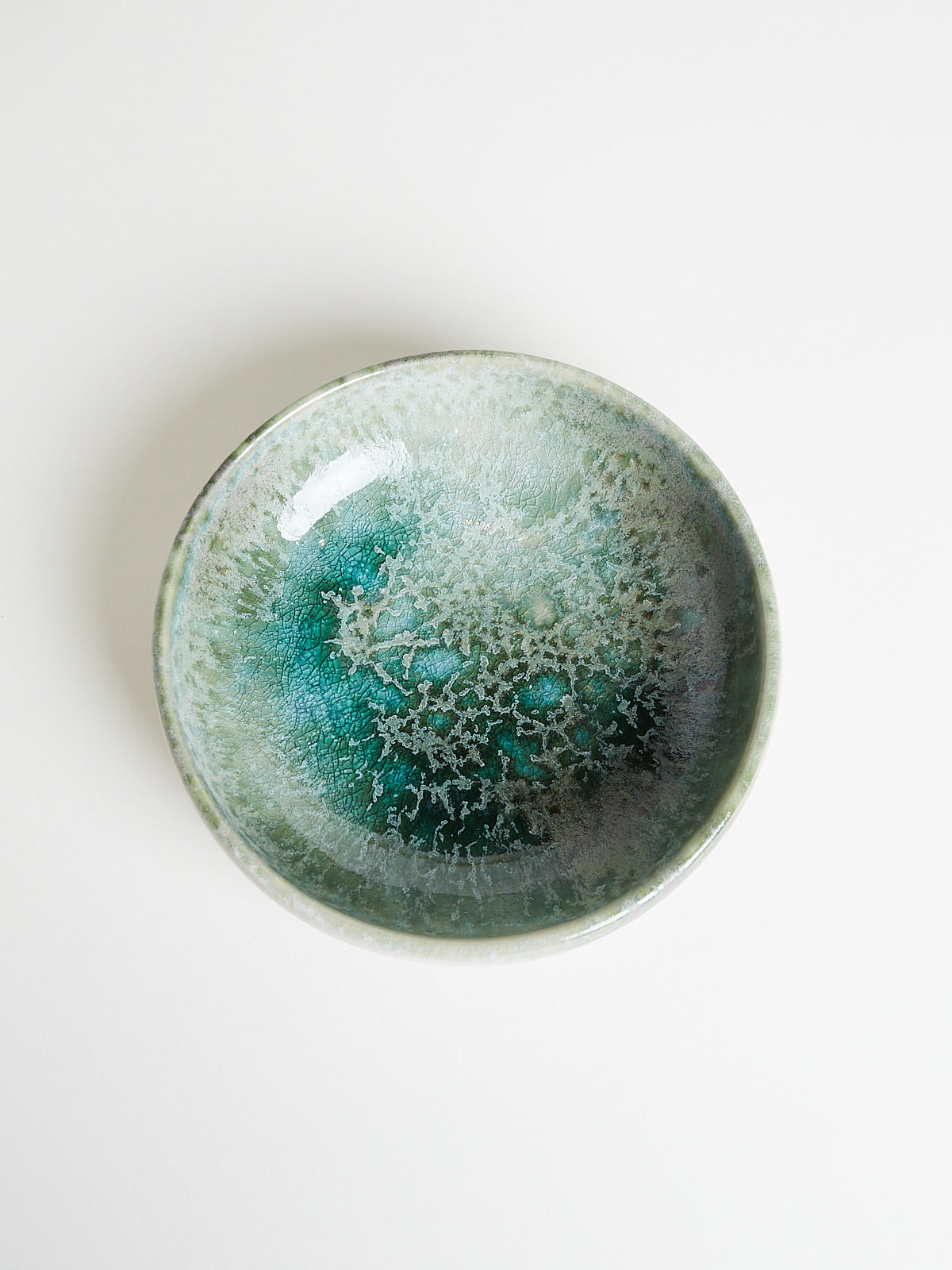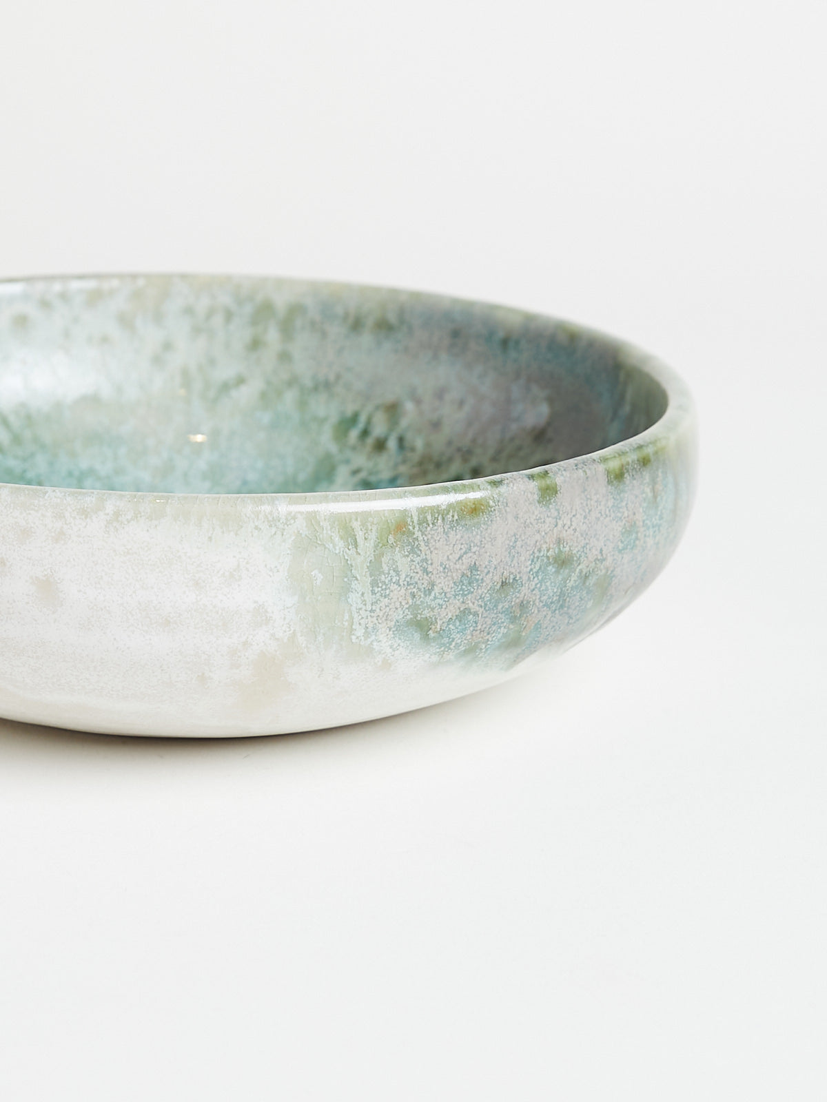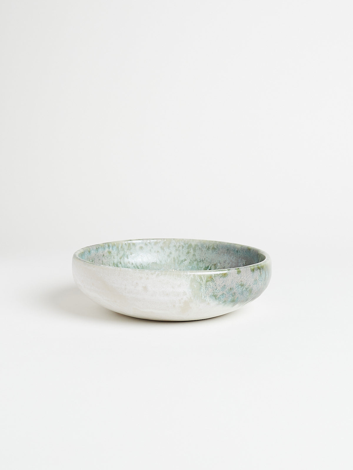 Hand-thrown, hand-glazed shallow ceramic bowl in green shades. Each piece is created using ancient wheel-turning and glazing methods.