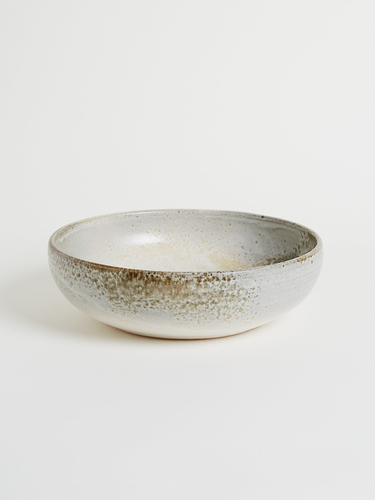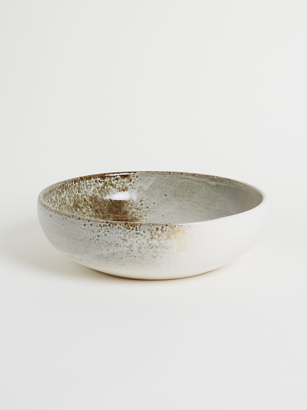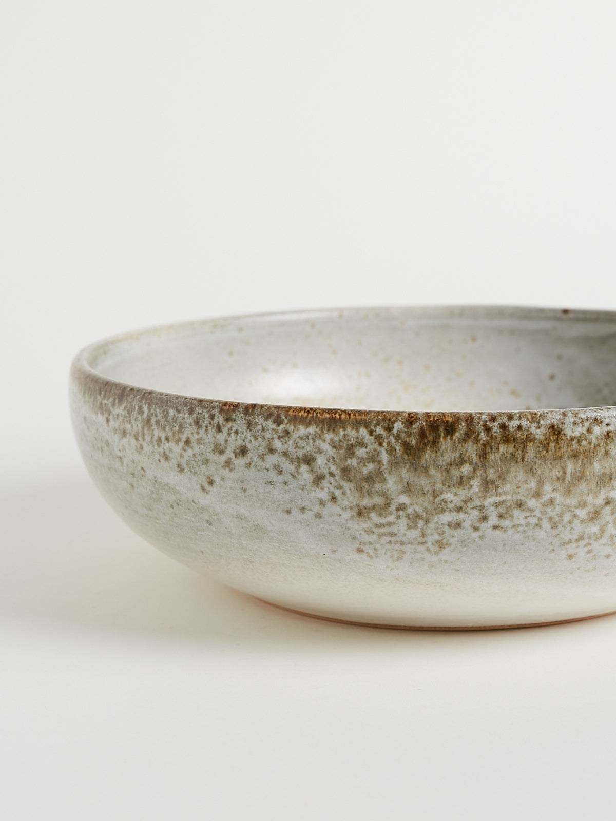 Hand-thrown, hand-glazed ceramic serving bowl in white and brown shades. Each piece is created using ancient wheel-turning and glazing methods.