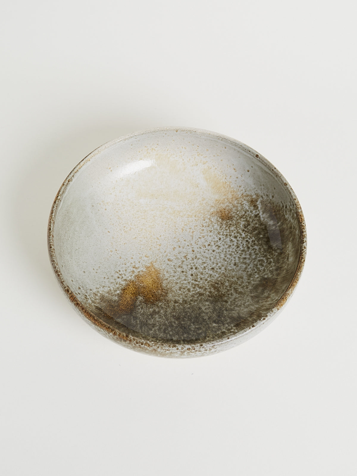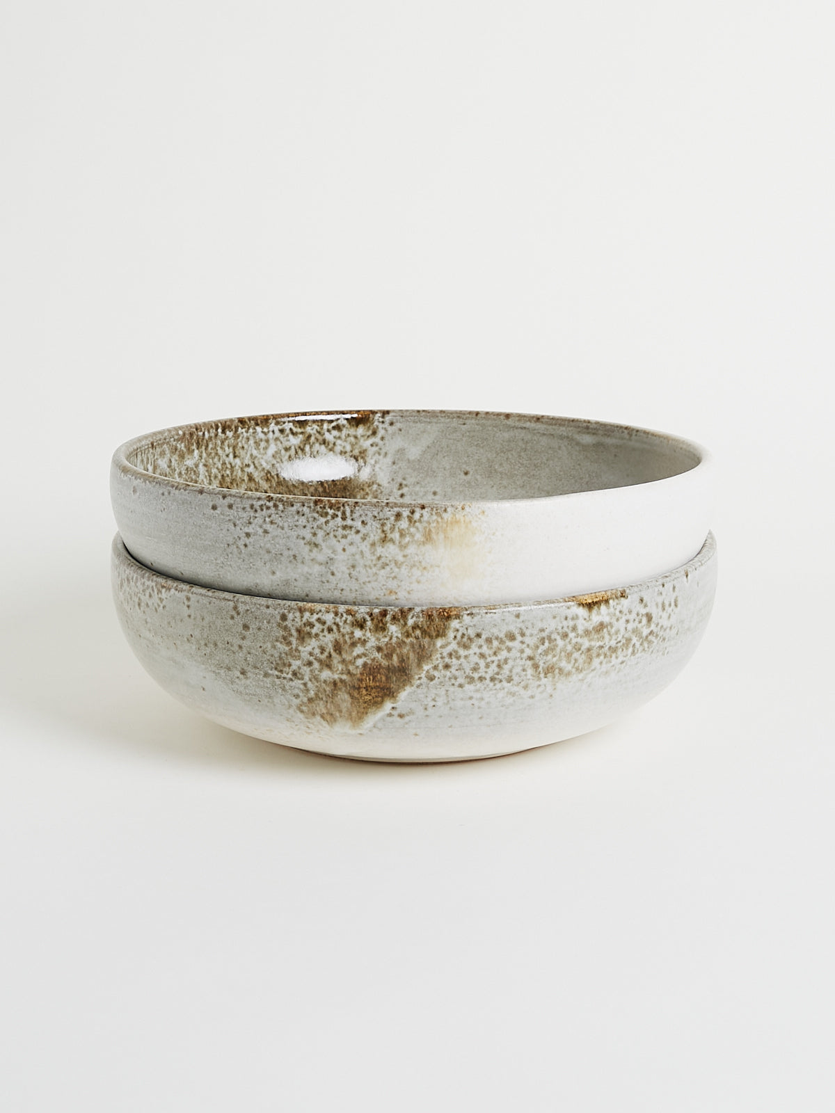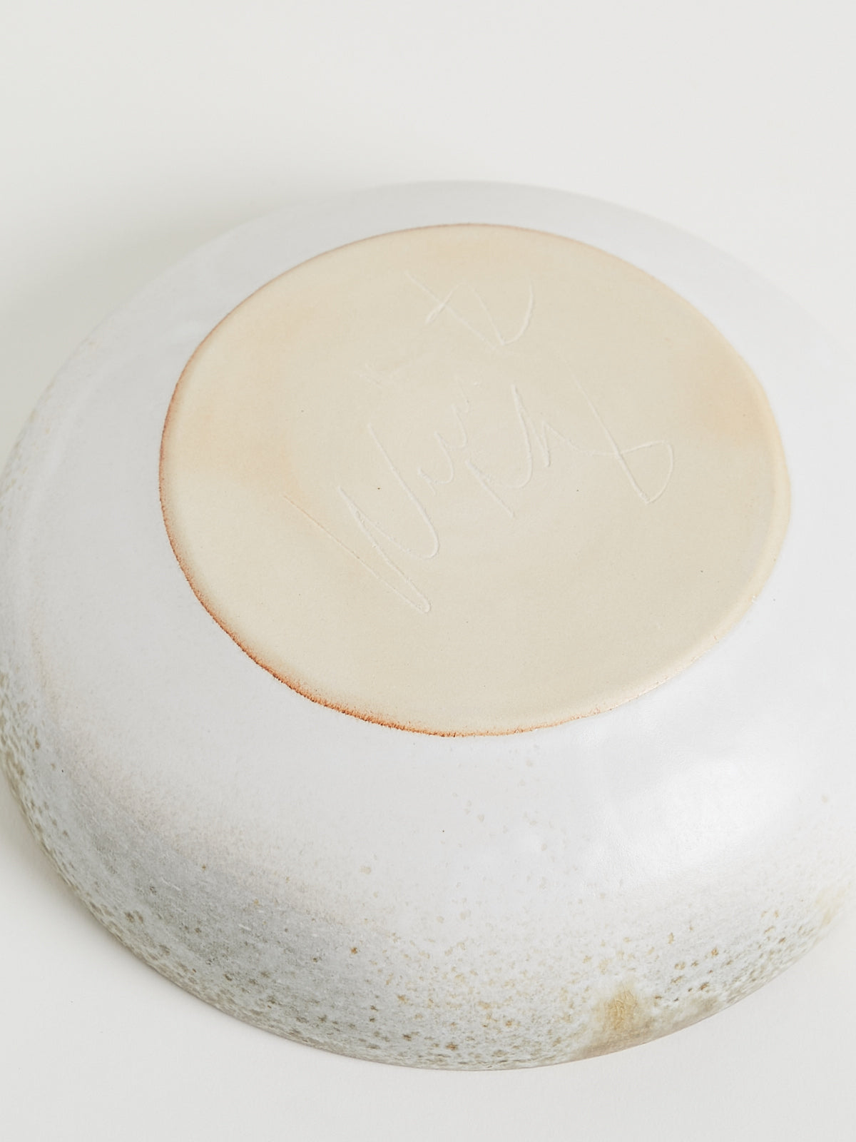 Hand-thrown, hand-glazed ceramic serving bowl in white and brown shades. Each piece is created using ancient wheel-turning and glazing methods.