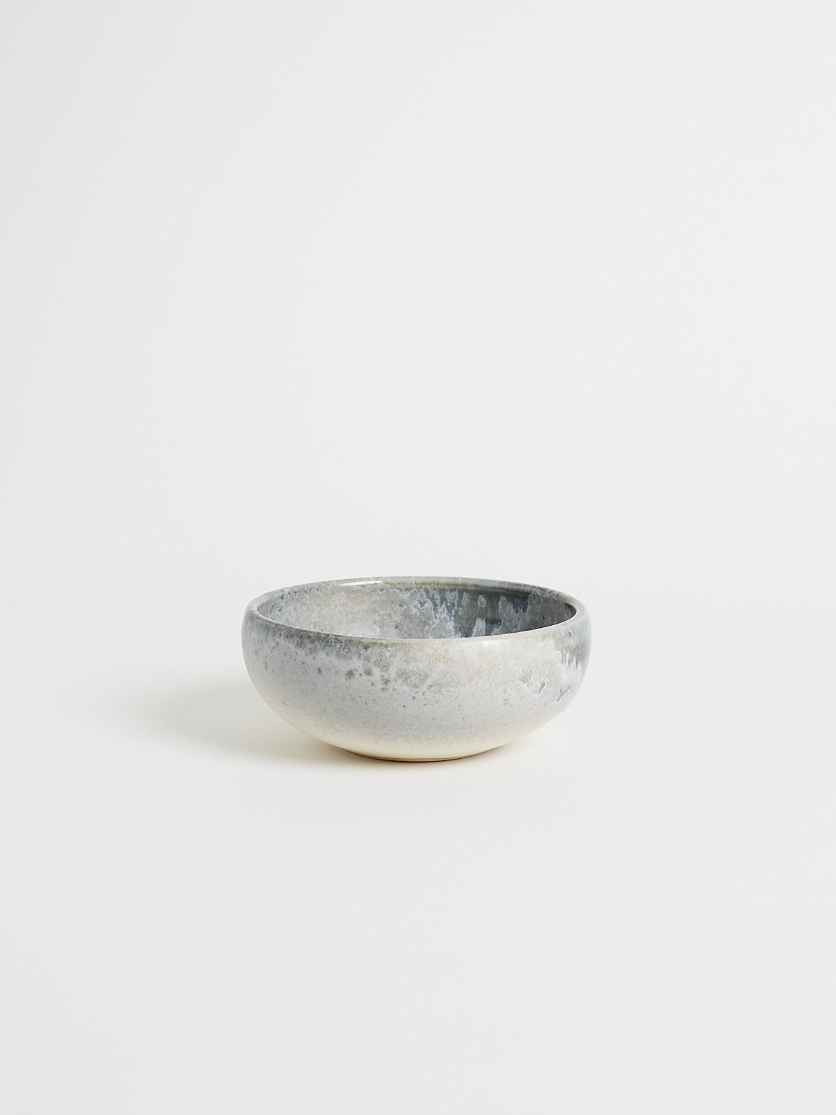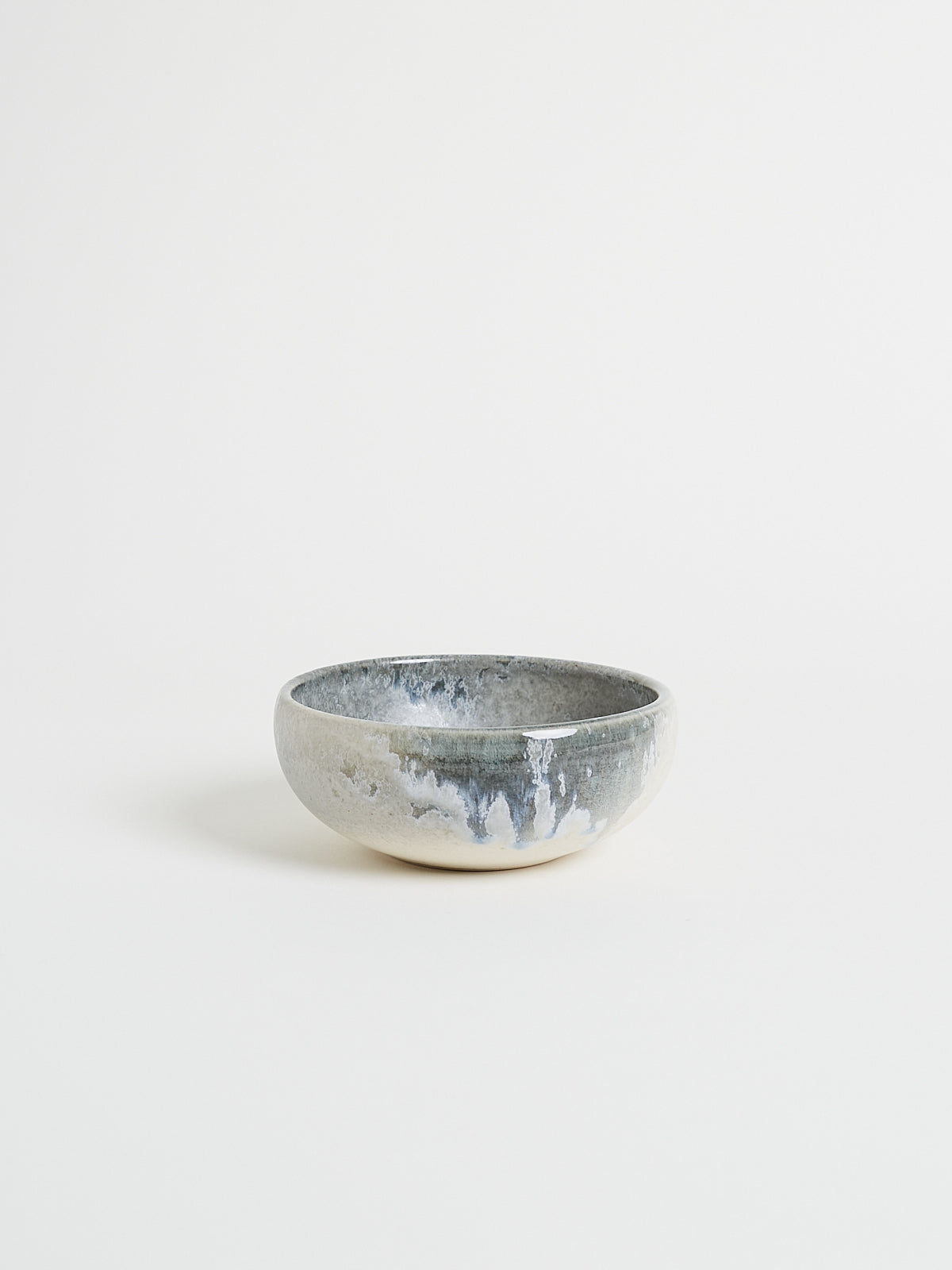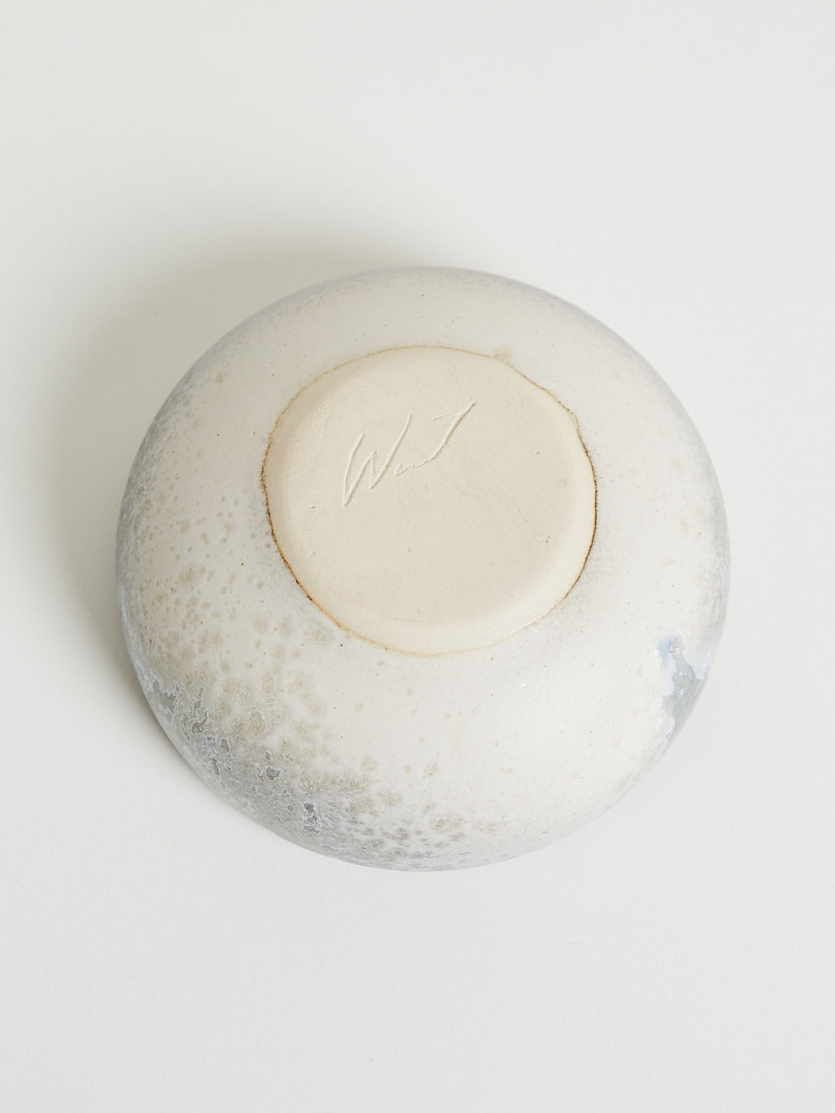 Hand-thrown, hand-glazed small ceramic bowl in white and soft blue. Each piece is created using ancient wheel-turning and glazing methods.