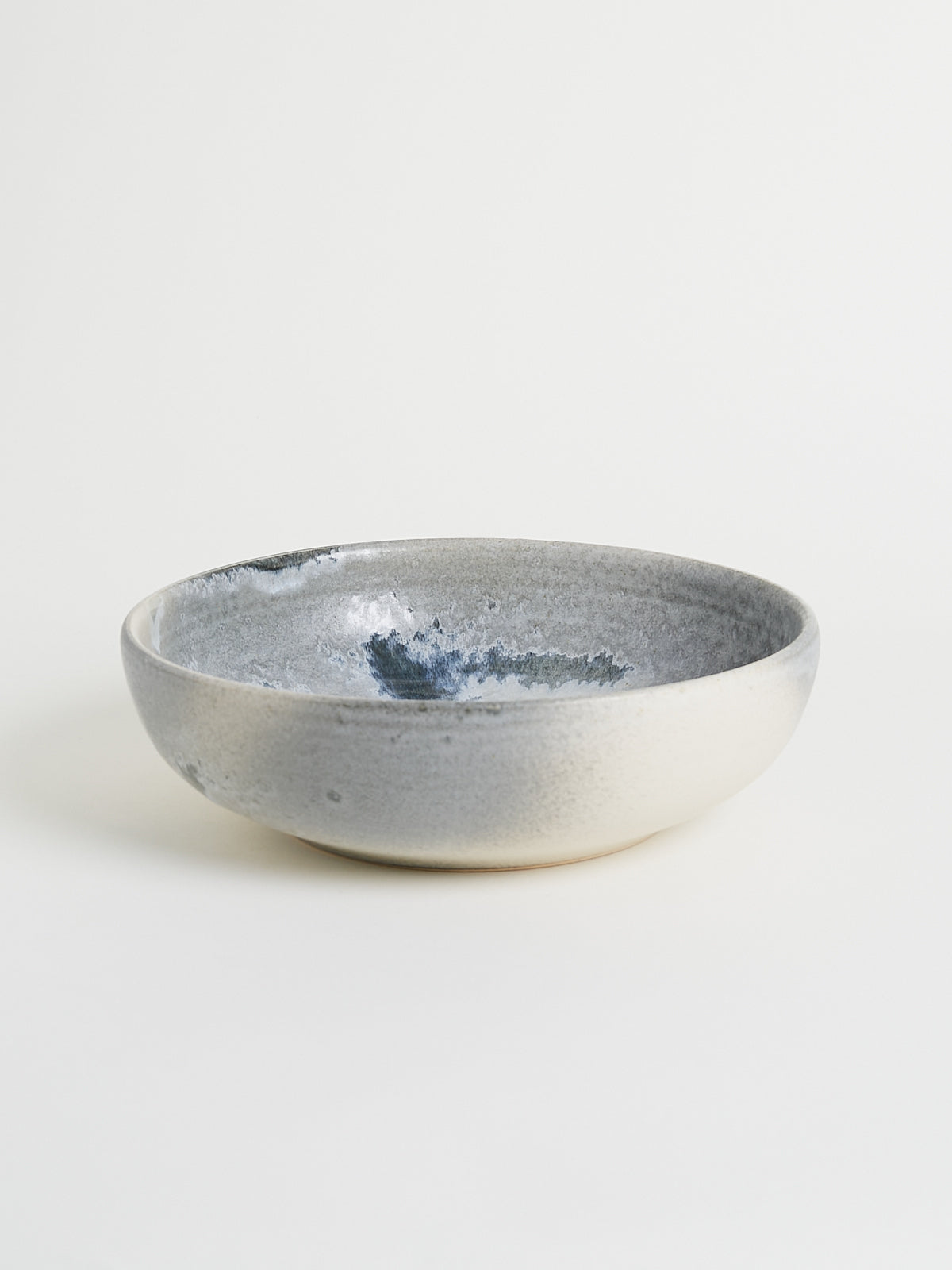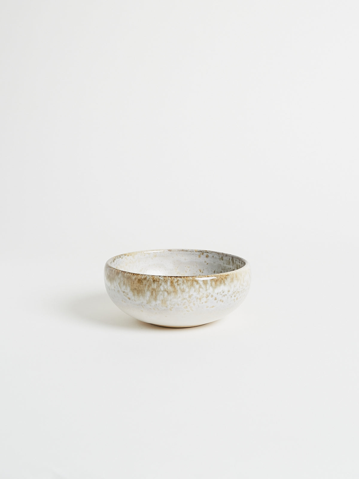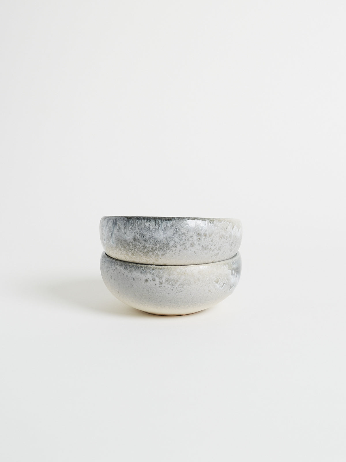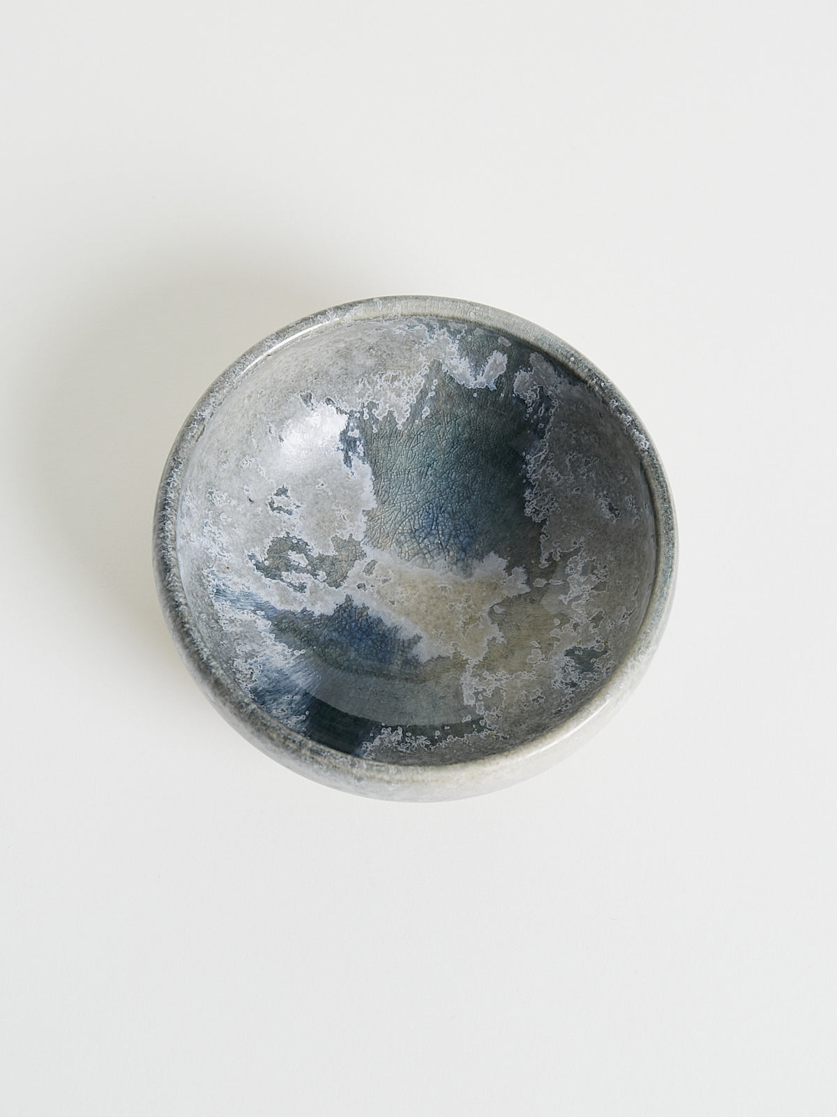 Hand-thrown, hand-glazed small ceramic bowl in white and soft blue. Each piece is created using ancient wheel-turning and glazing methods.