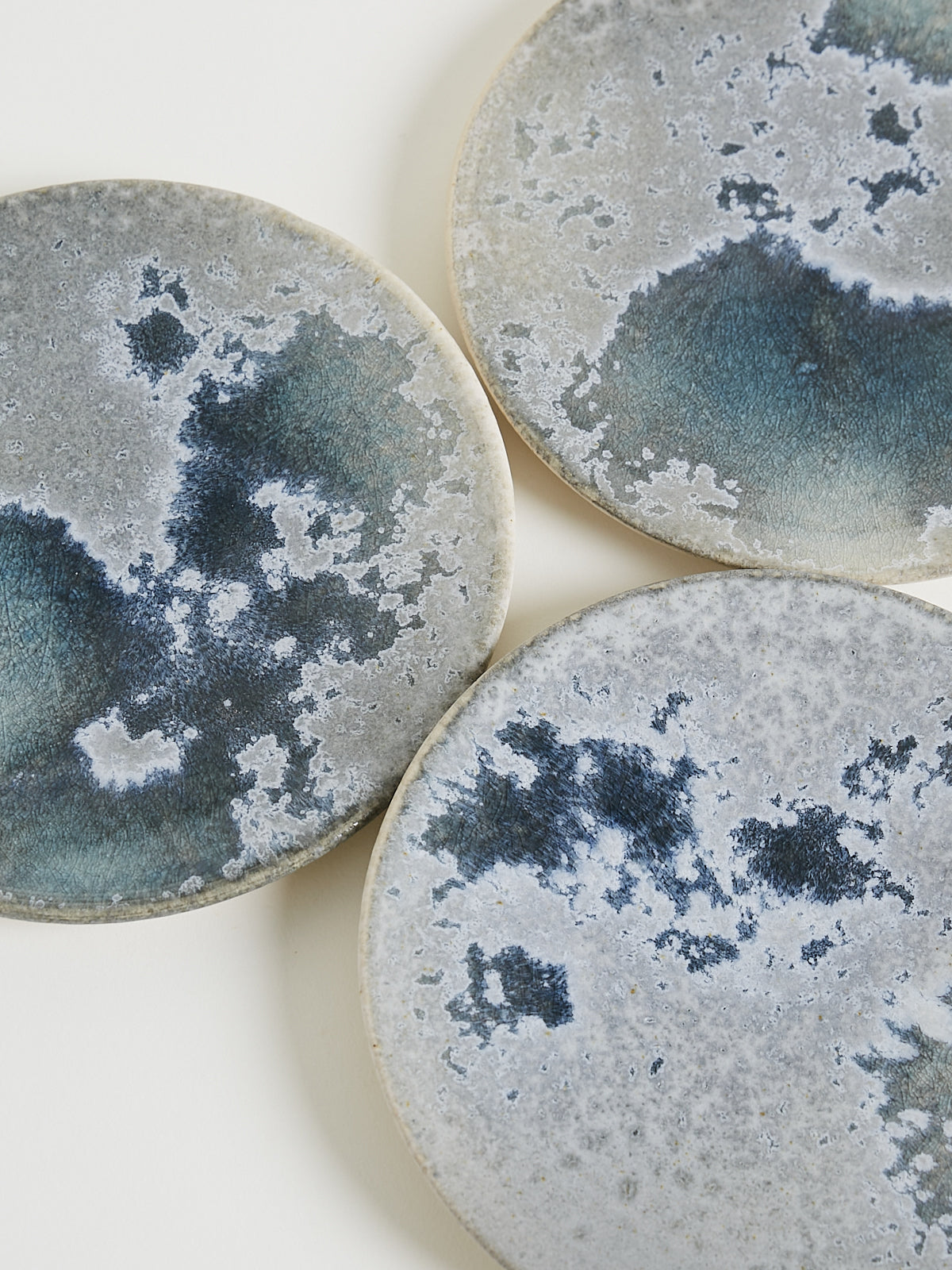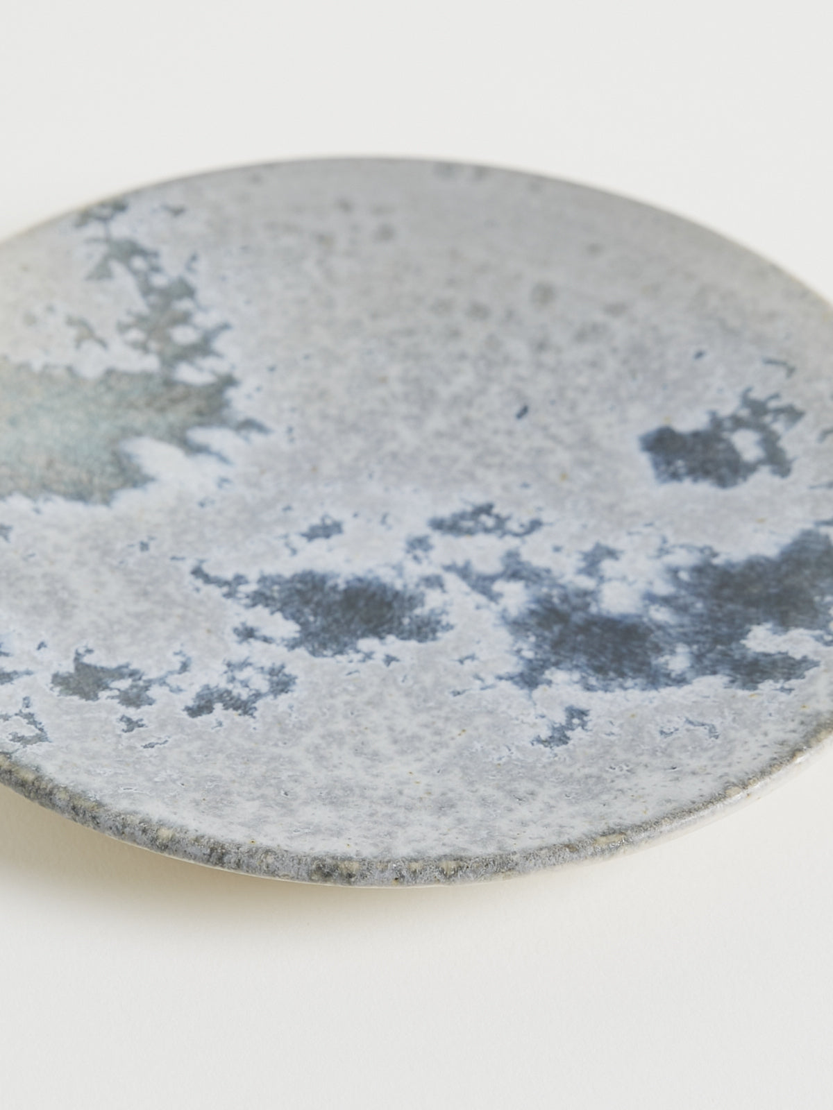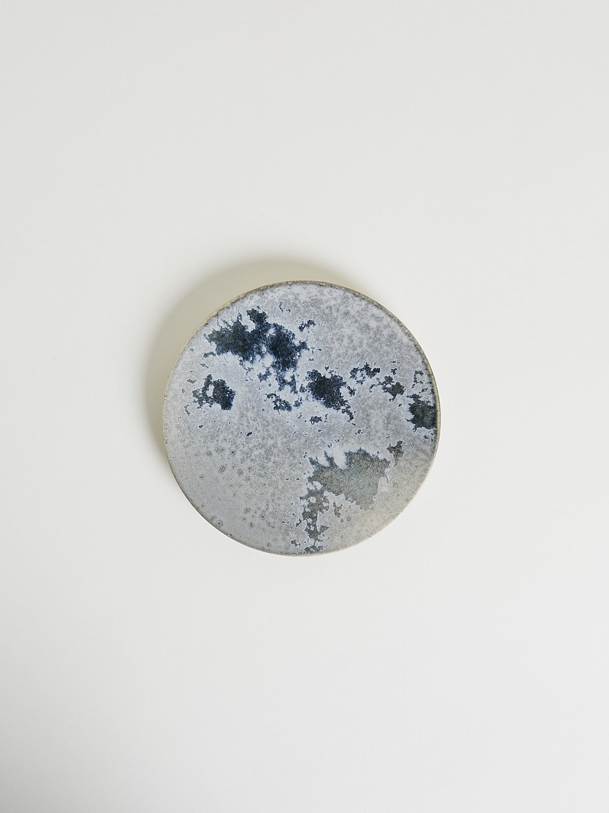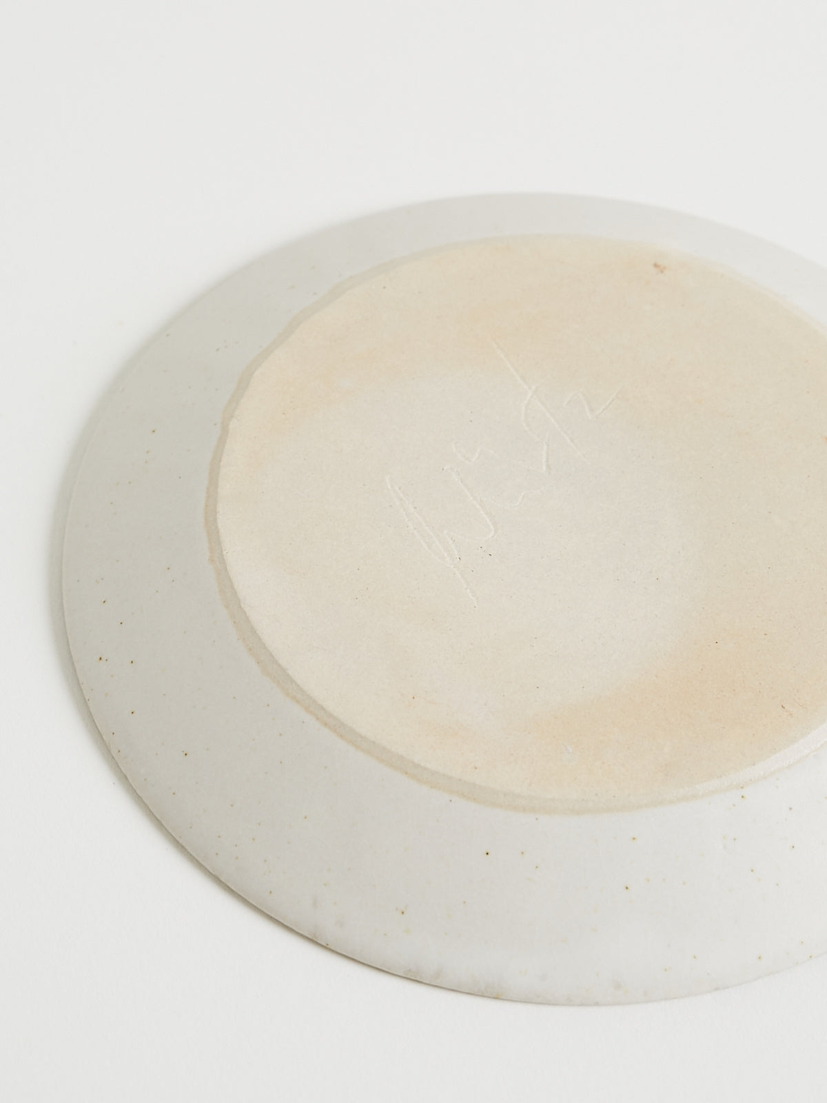 Hand-thrown, hand-glazed small ceramic plate in white and soft blue. Each piece is created using ancient wheel-turning and glazing methods.