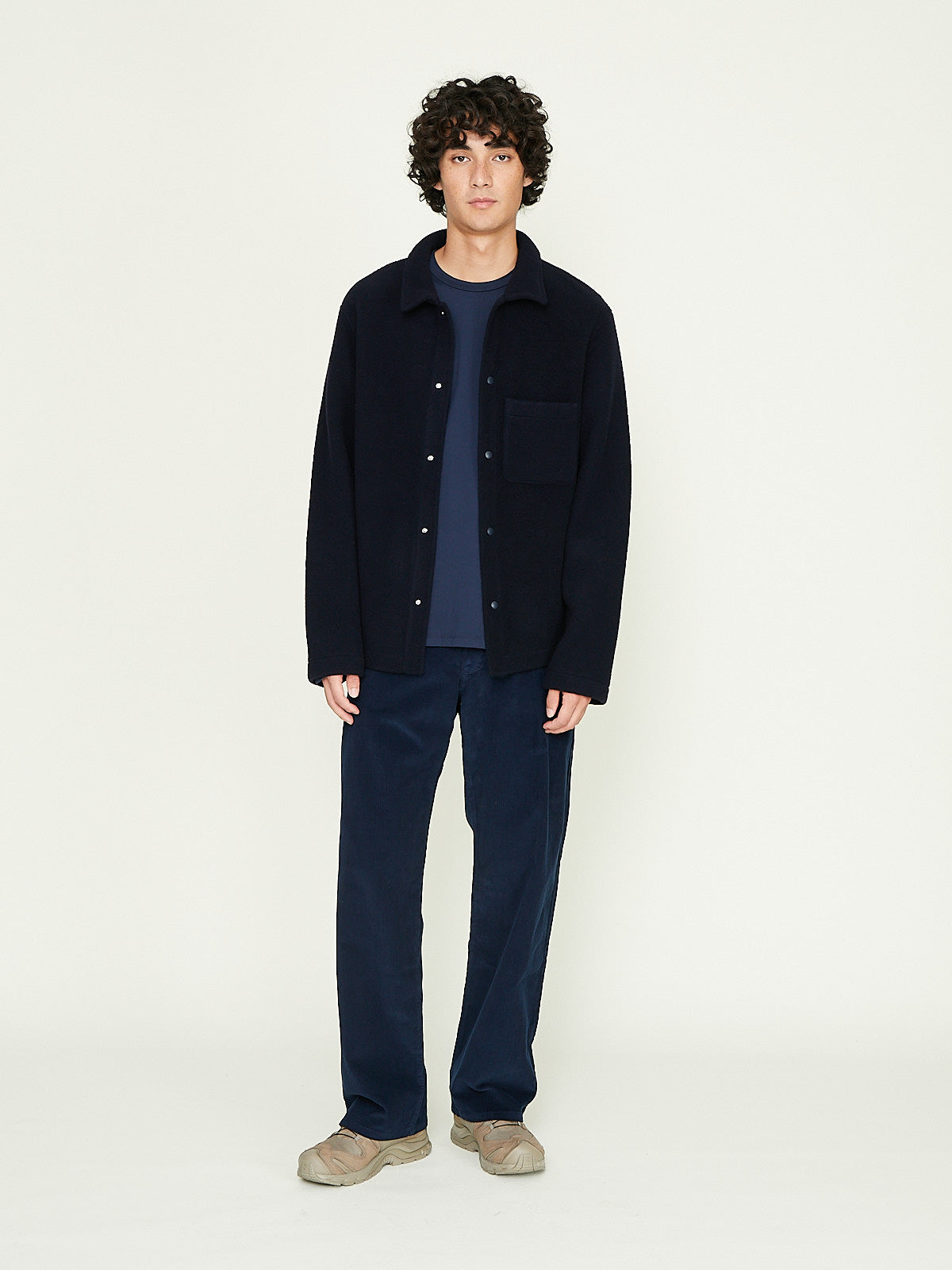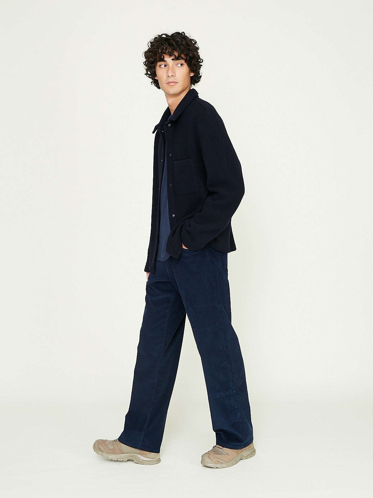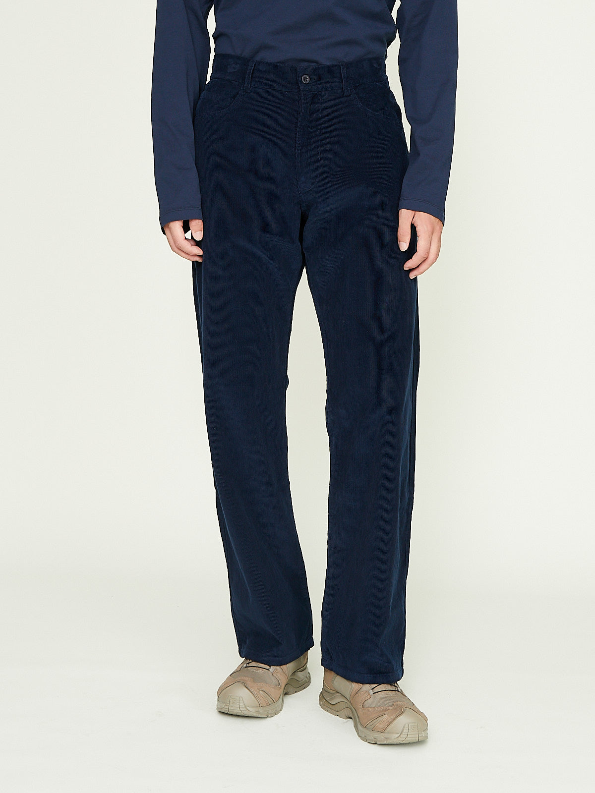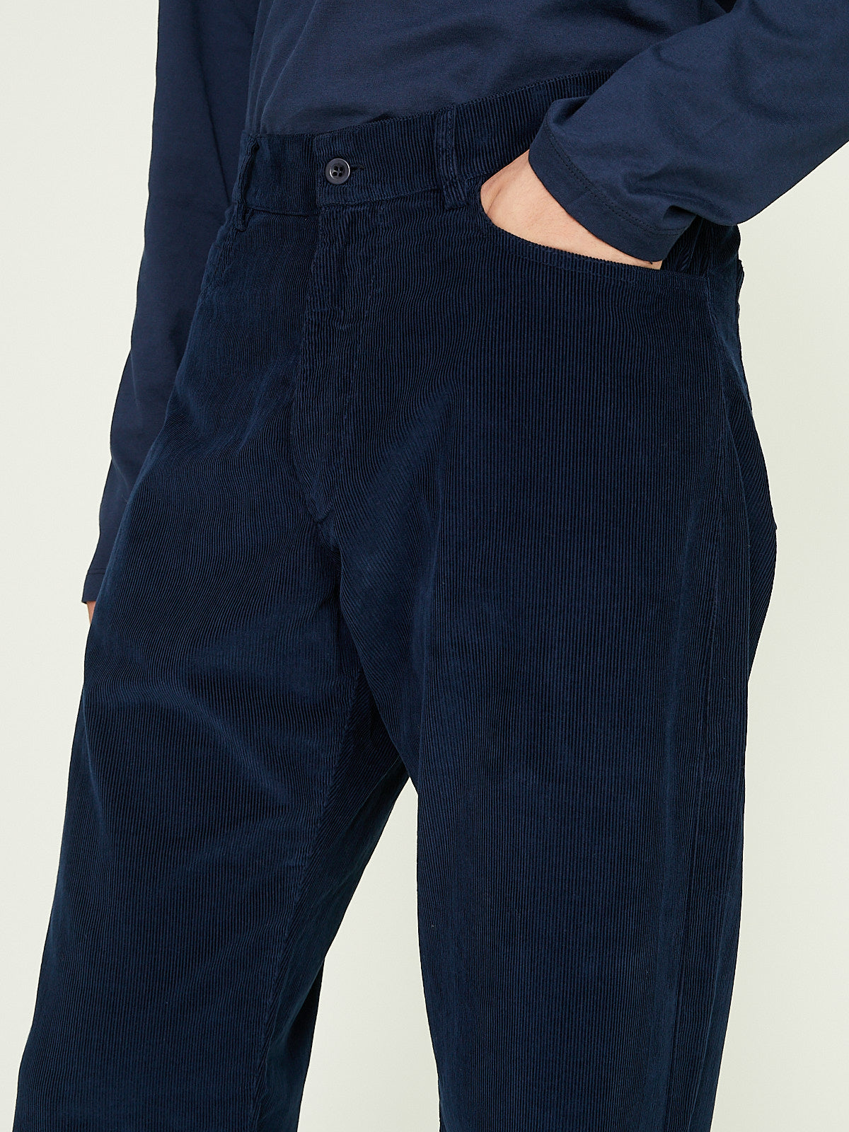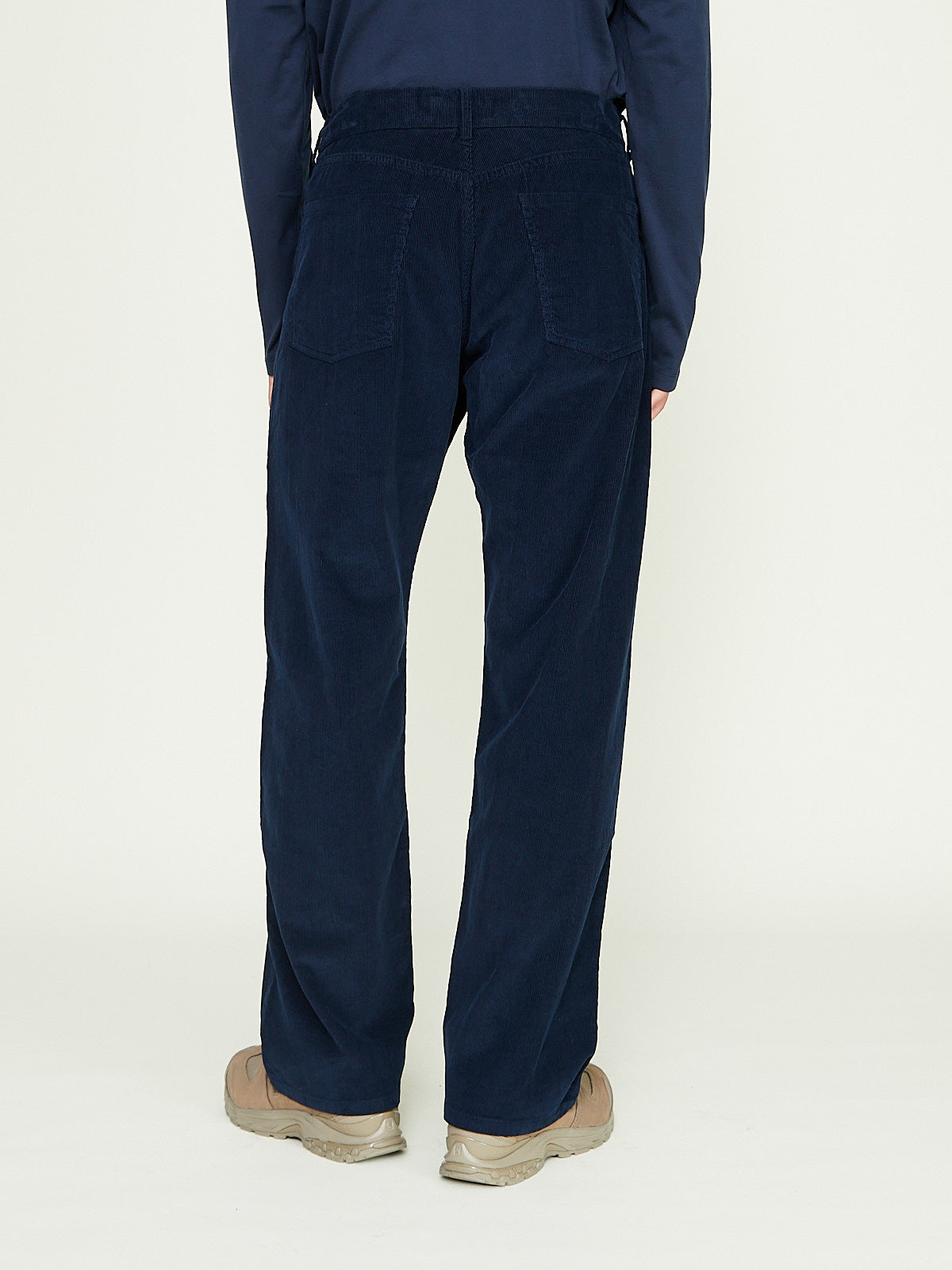 Relaxed trouser in dark blue cotton corduroy. Classic 5-pocket styling. Scoop pockets on the front and patch pockets on the back. Features a back yoke. Straight legs.