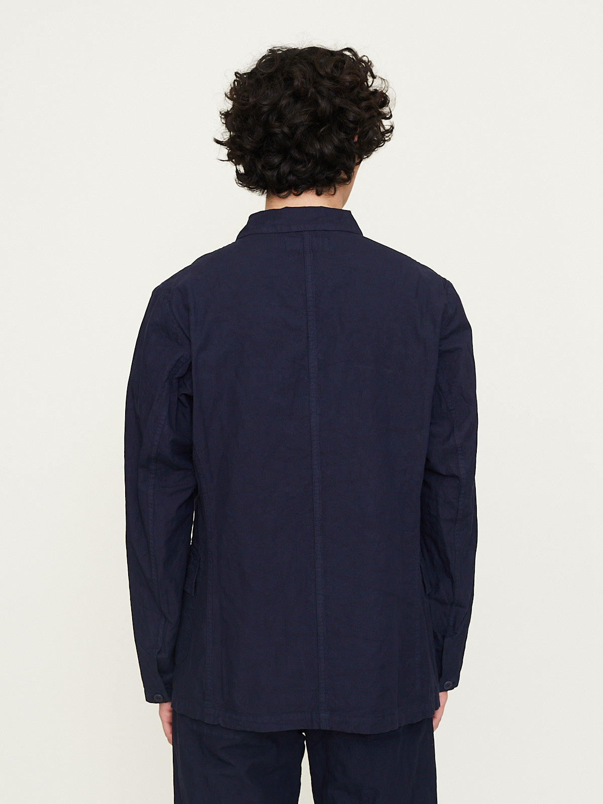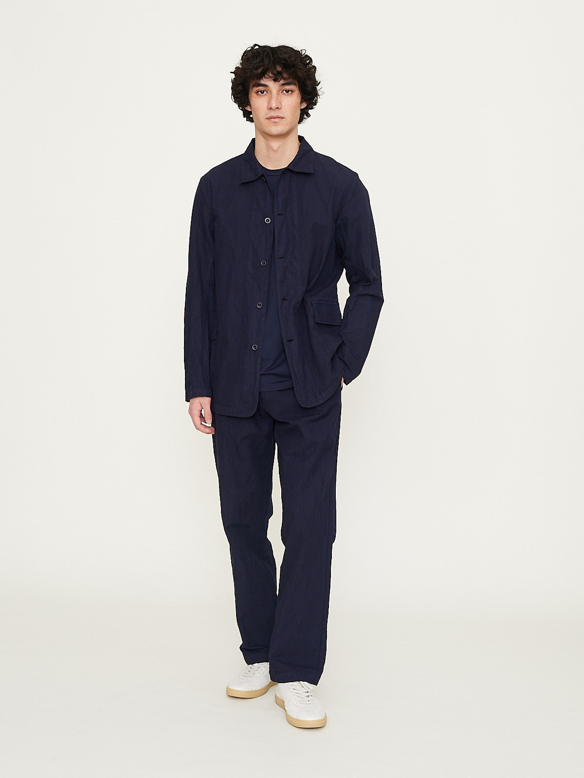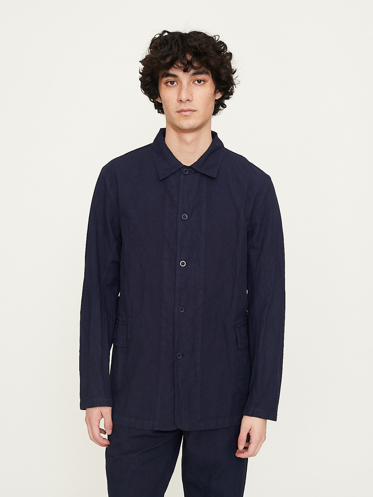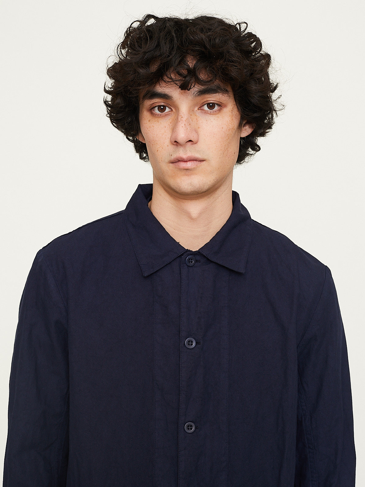 Workwear-inspired jacket in a dark blue cotton with metallic elements. Shirt collar, front button fastening and long sleeves with buttoned cuffs. Flap pockets on the front.