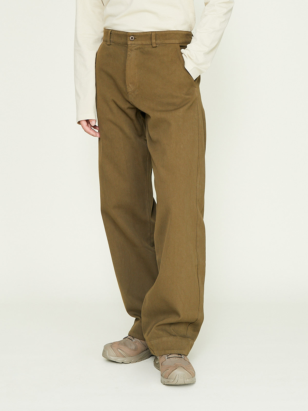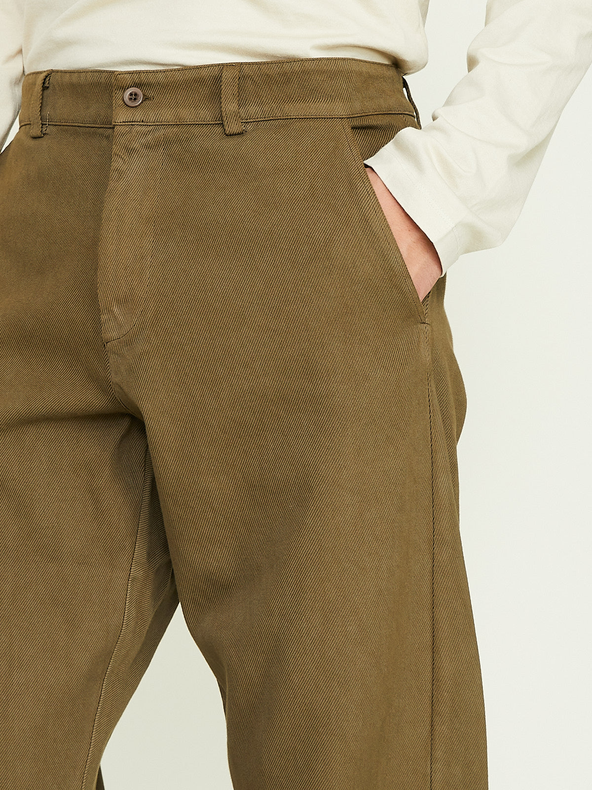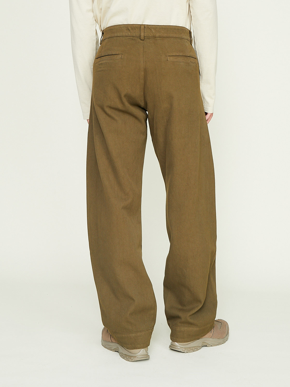 Oversized trouser in brown cotton twill. Button fly and belt loops. Slash pockets on the front and welted pockets on the back. Wide straight legs with a subtle curved seams and wide cuffs.