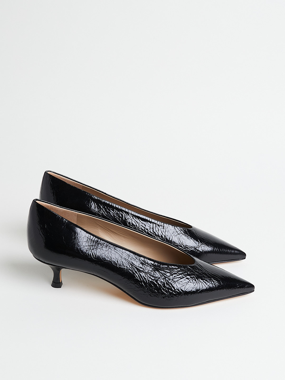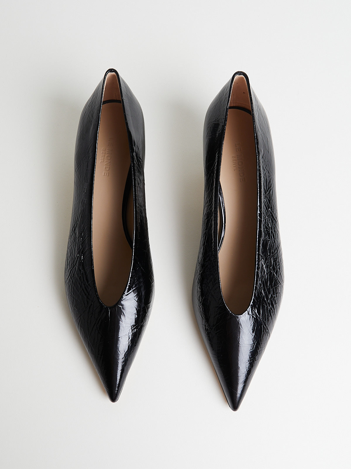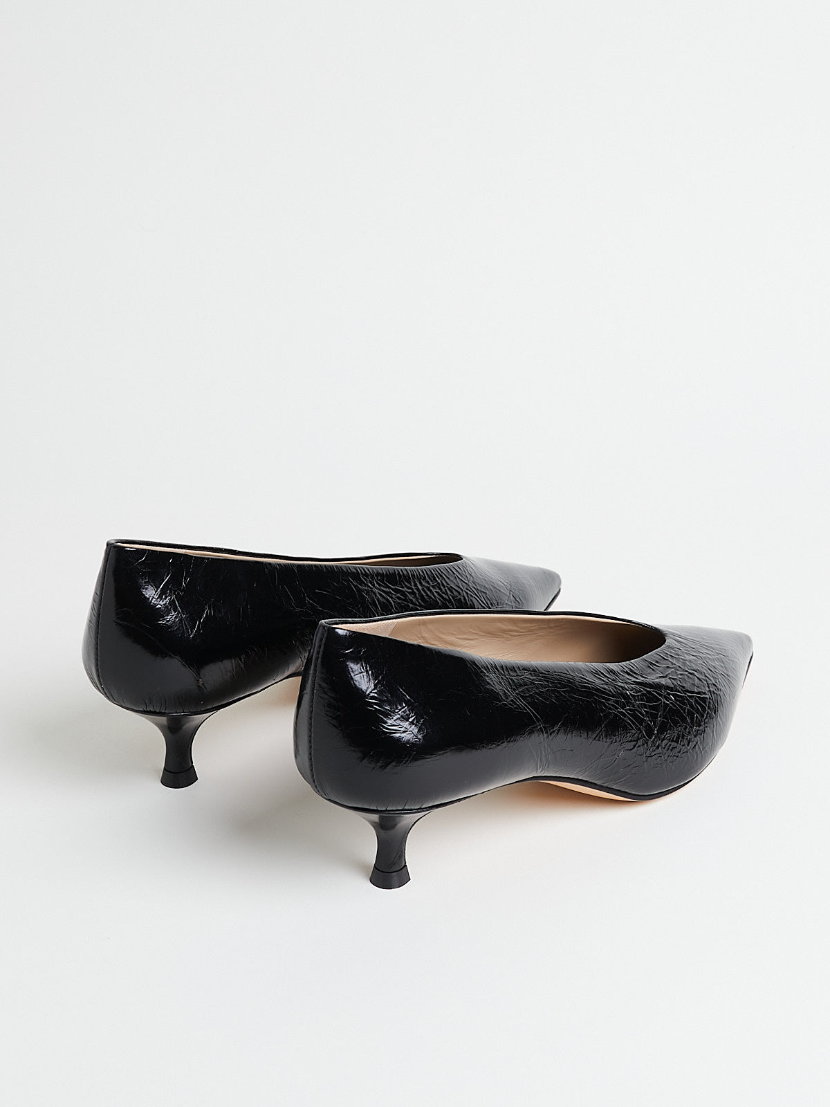 Pump in black naplack leather. Pointy toe, cushioned calf leather insole and a 40mm kitten heel.