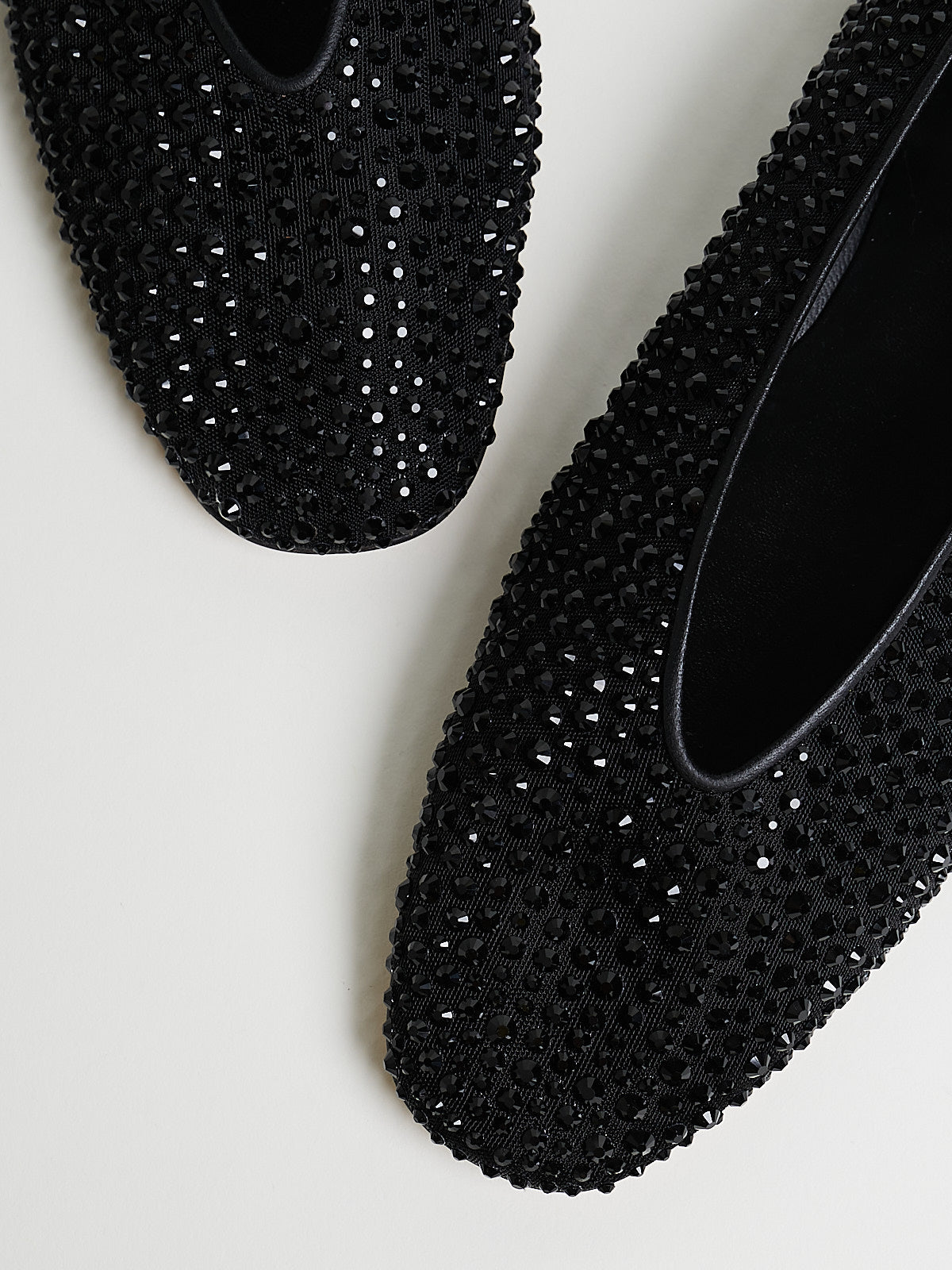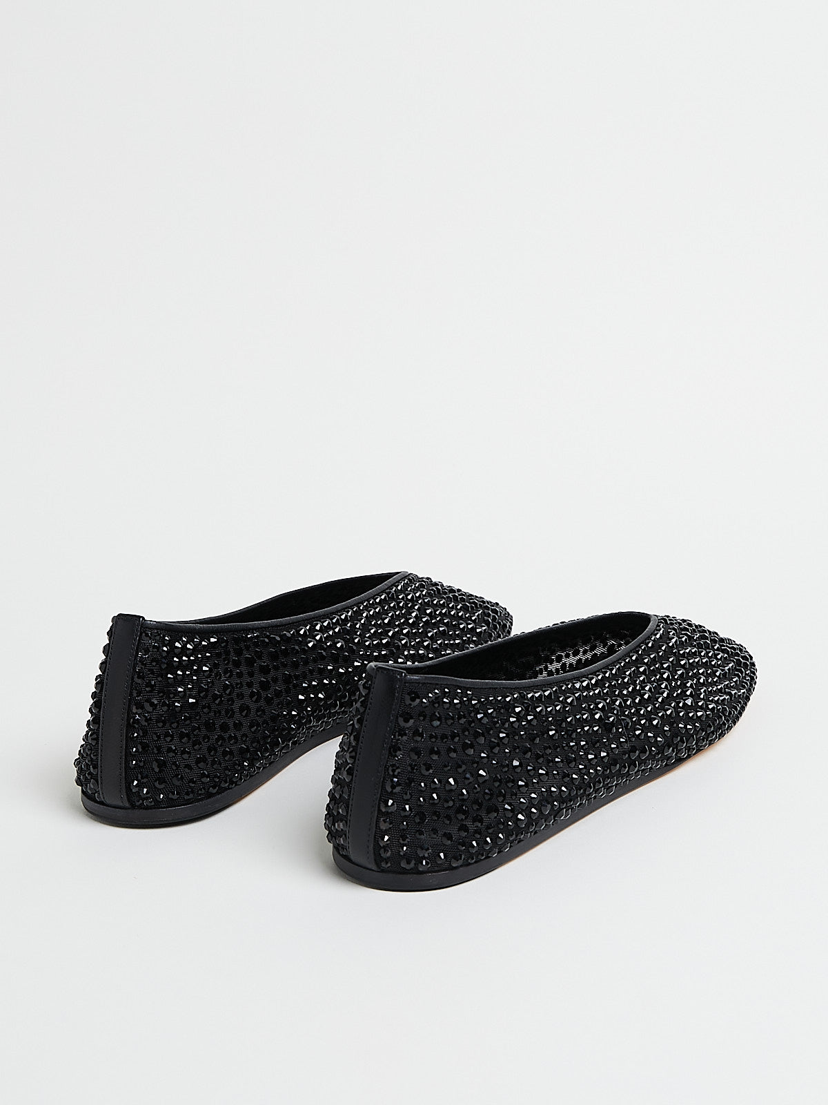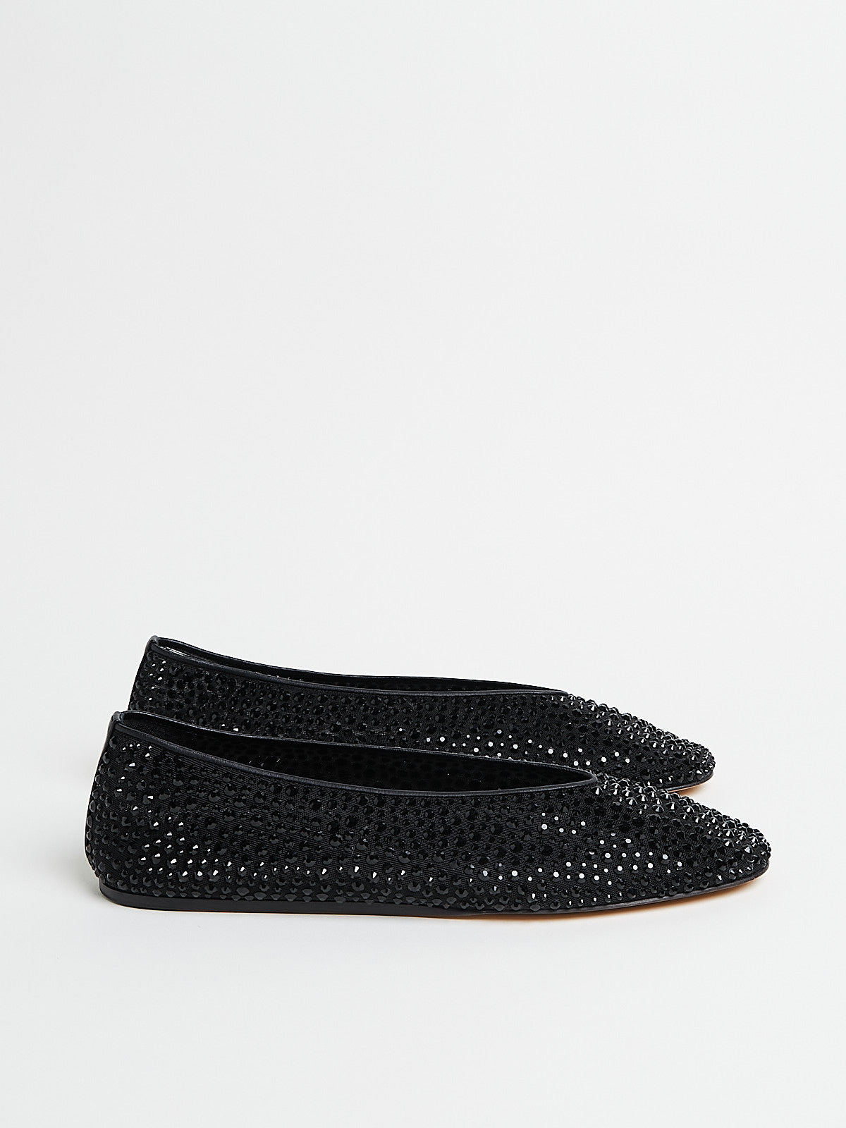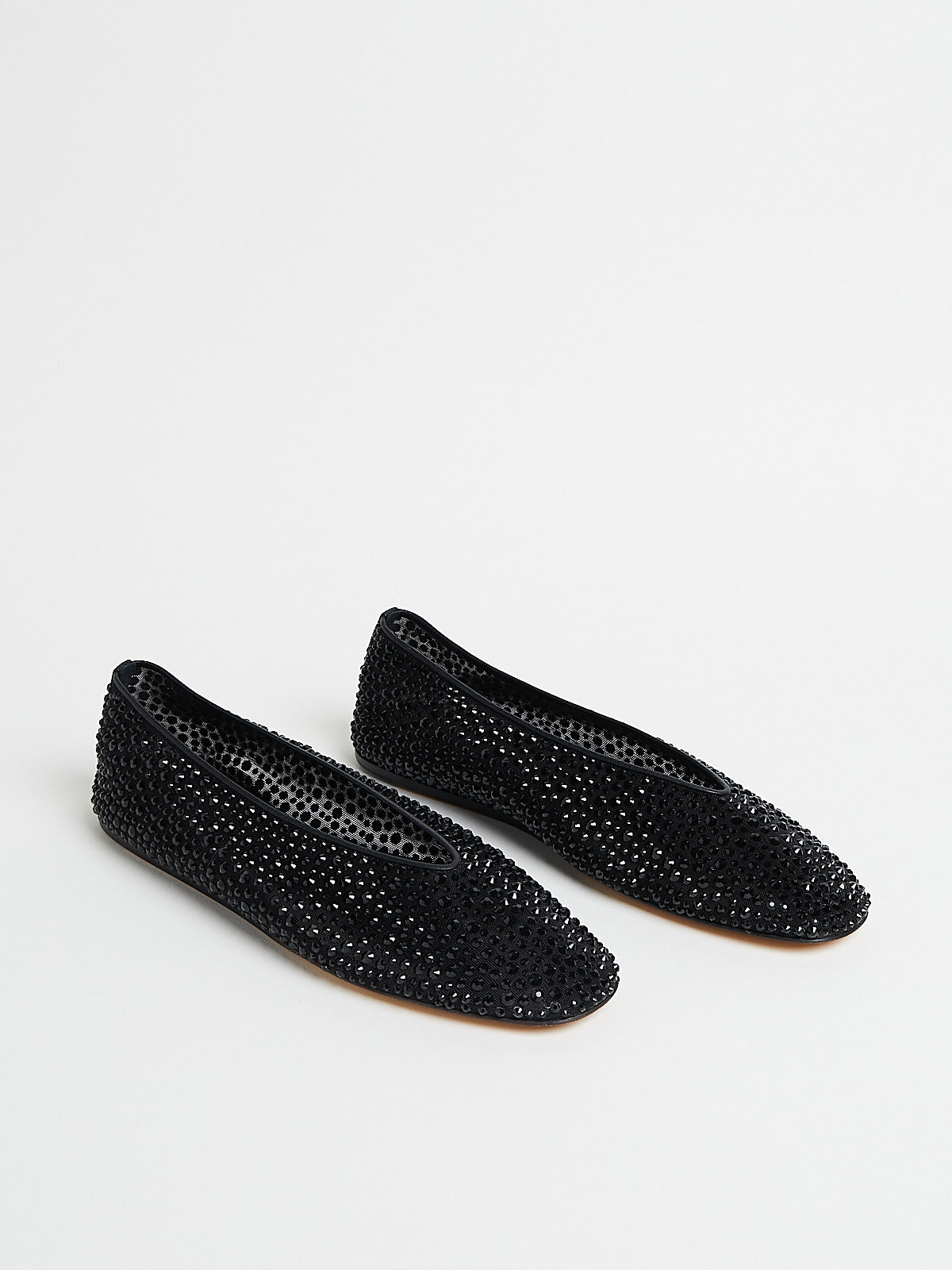 Slipper in black mesh encrusted with black crystals. Cap toe and a pull on design. Features a cushioned calf leather insole and a flat 8mm leather outsole. Unlined and piped edges in lamb leather. Gondolier-inspired silhouette.