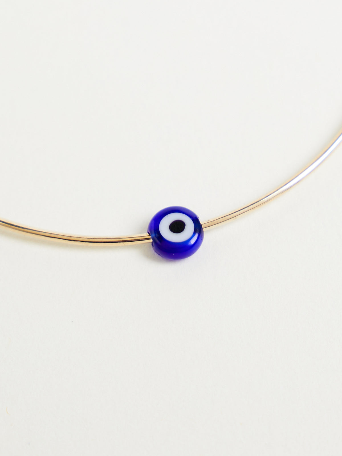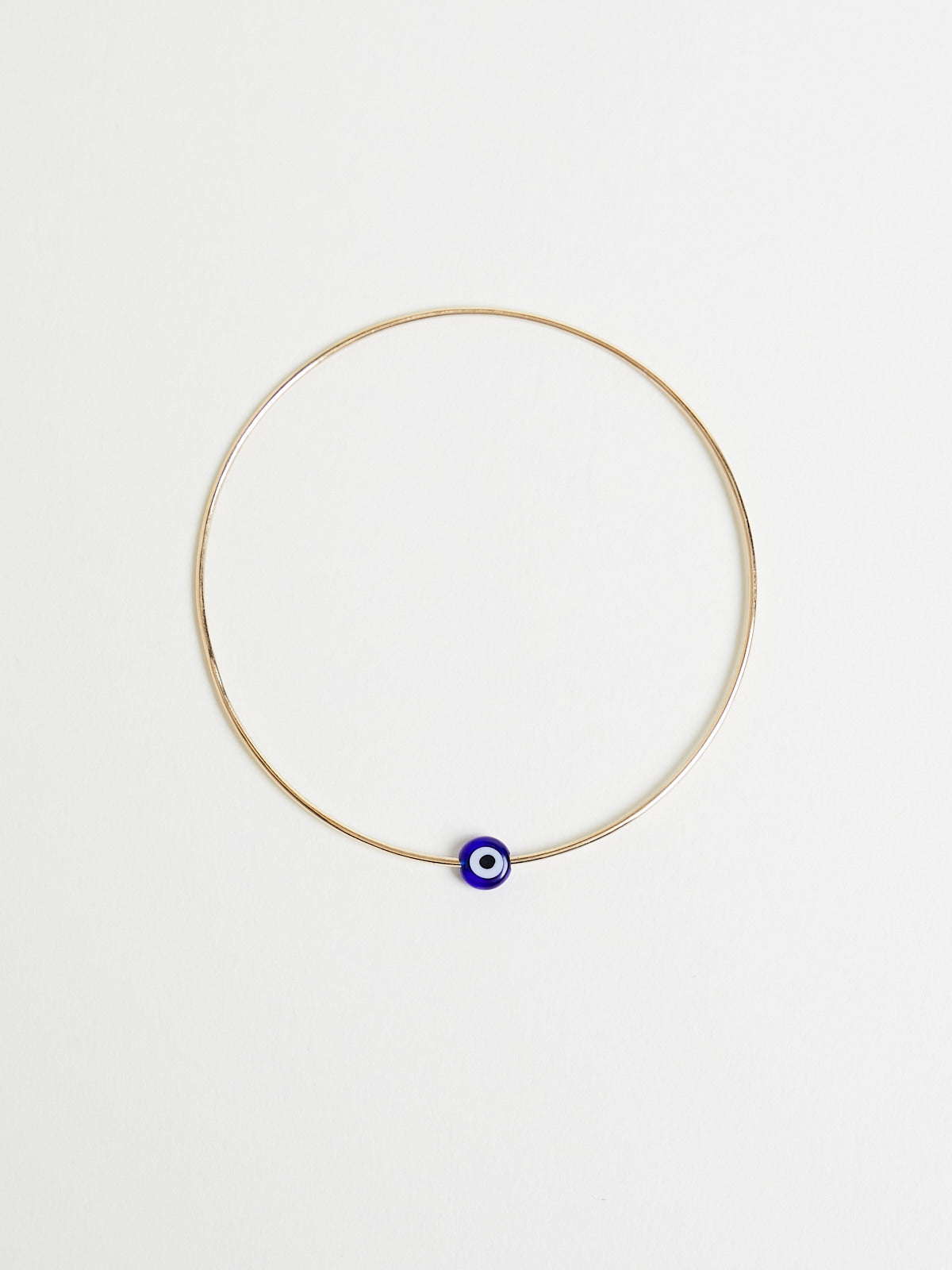 Handcrafted delicate bracelet made from 14k yellow gold wire with a glass eye bead. The bead has been passed through the wire enabling it to move. Slips on.