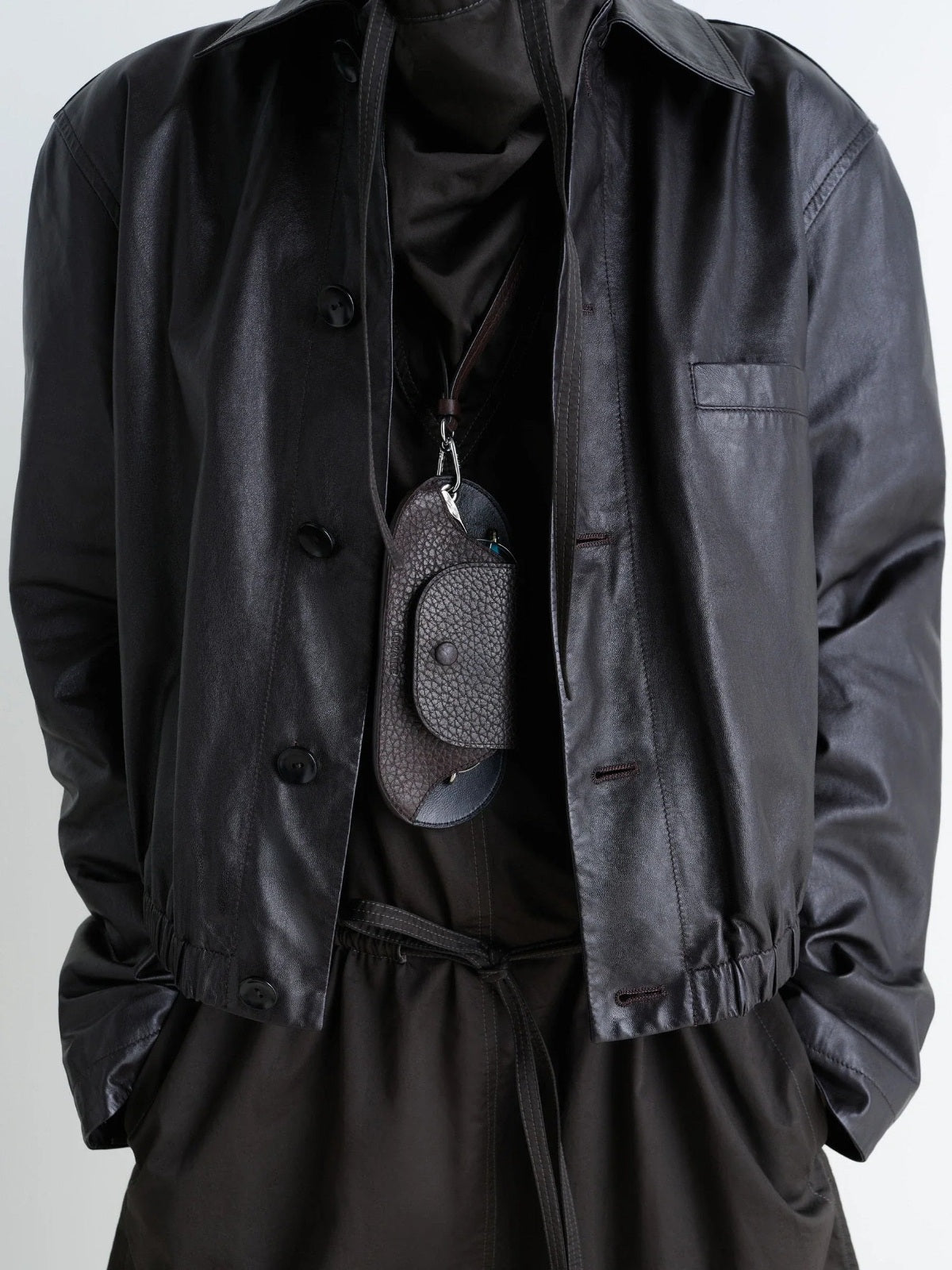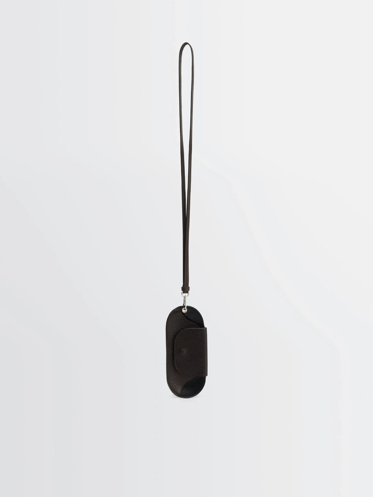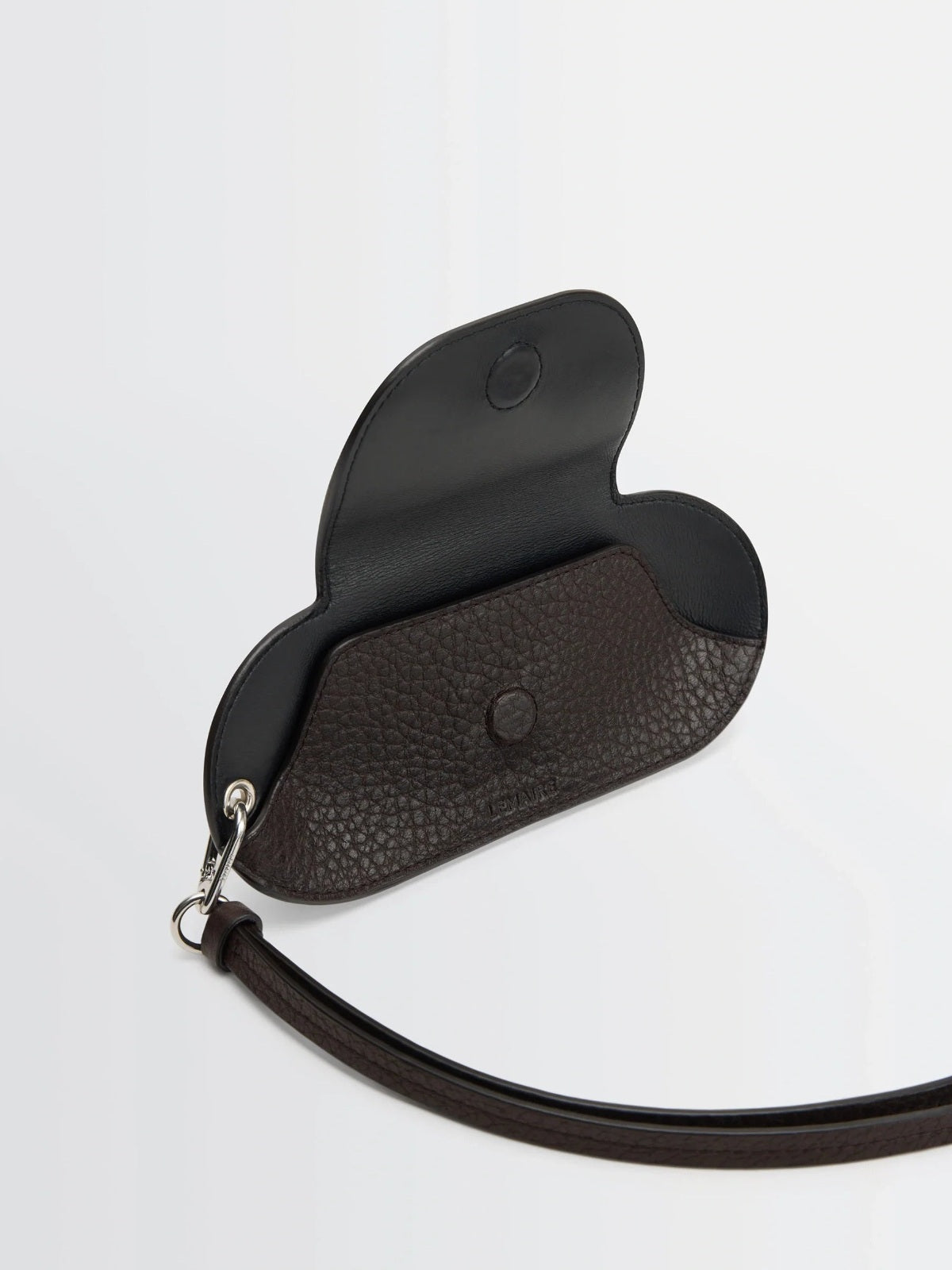 Glasses holder made from dark brown LWG Gold-certified grained leather, a thick, resistant material with a textured finish. Removable leather strap with ring, carabiner's clasp and metal eyelet. Magnetic flap closure. Silver-plated metalwork and an embossed Lemaire logo.
