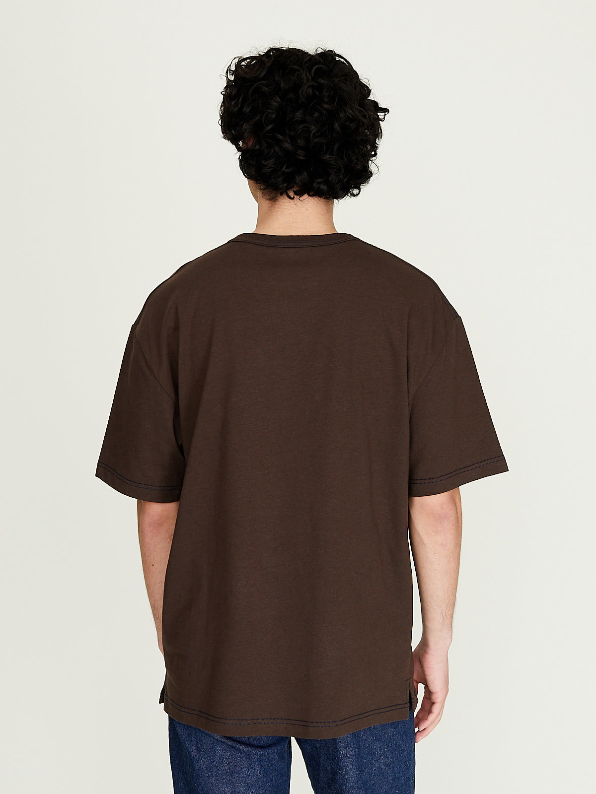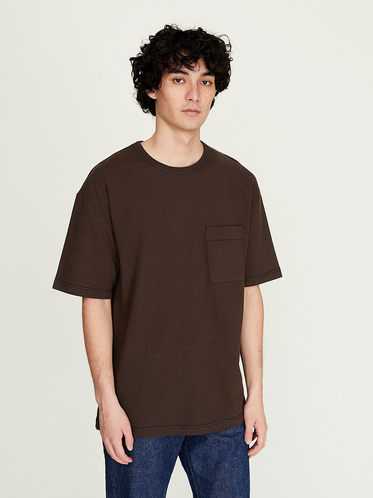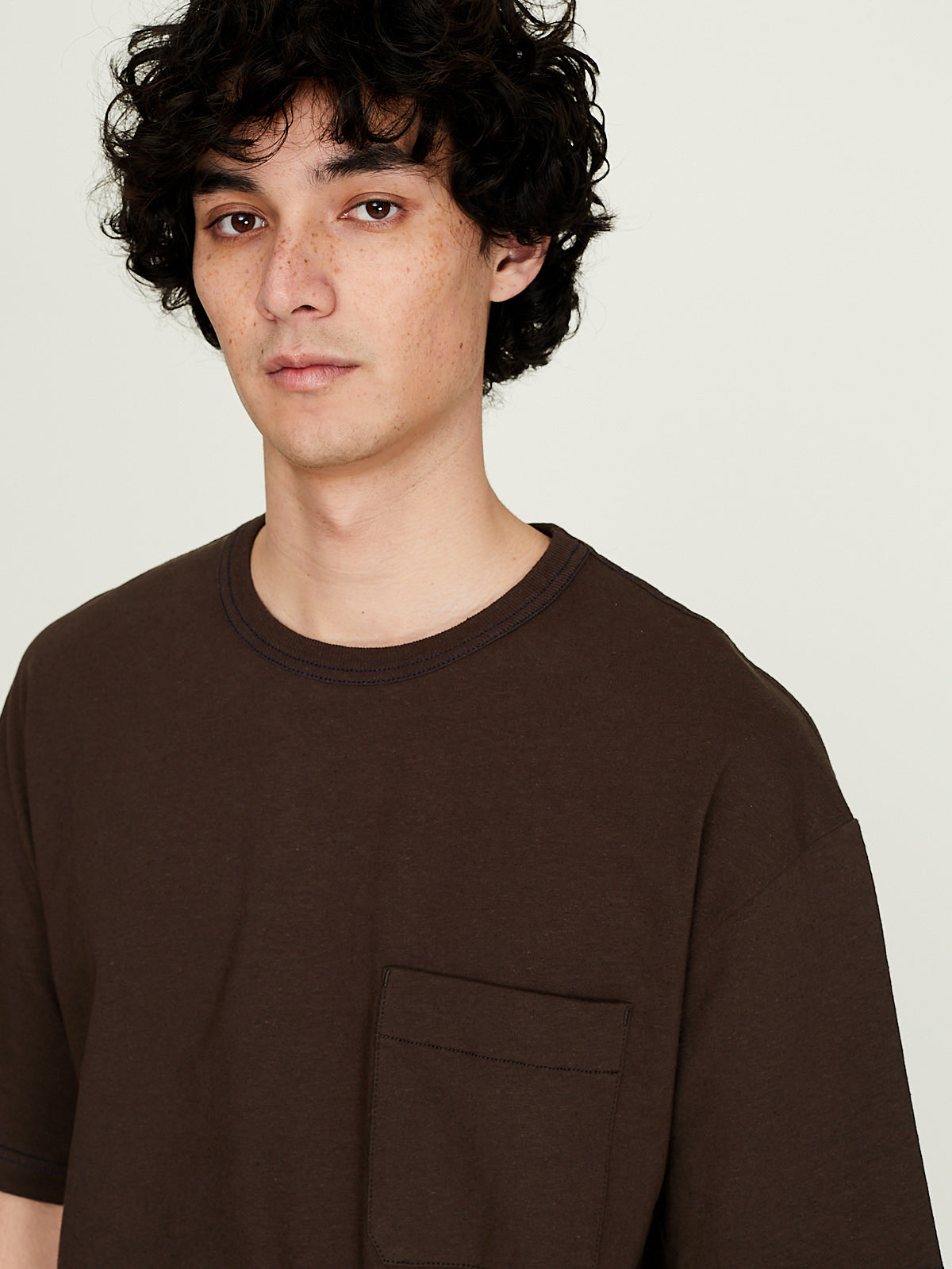 Boxy t-shirt in brown made from fluid soft linen cotton jersey. Round neckline and short sleeves with a dropped shoulder. Single chest pocket and side slits at the bottom hem. Rib detail around the neckline.