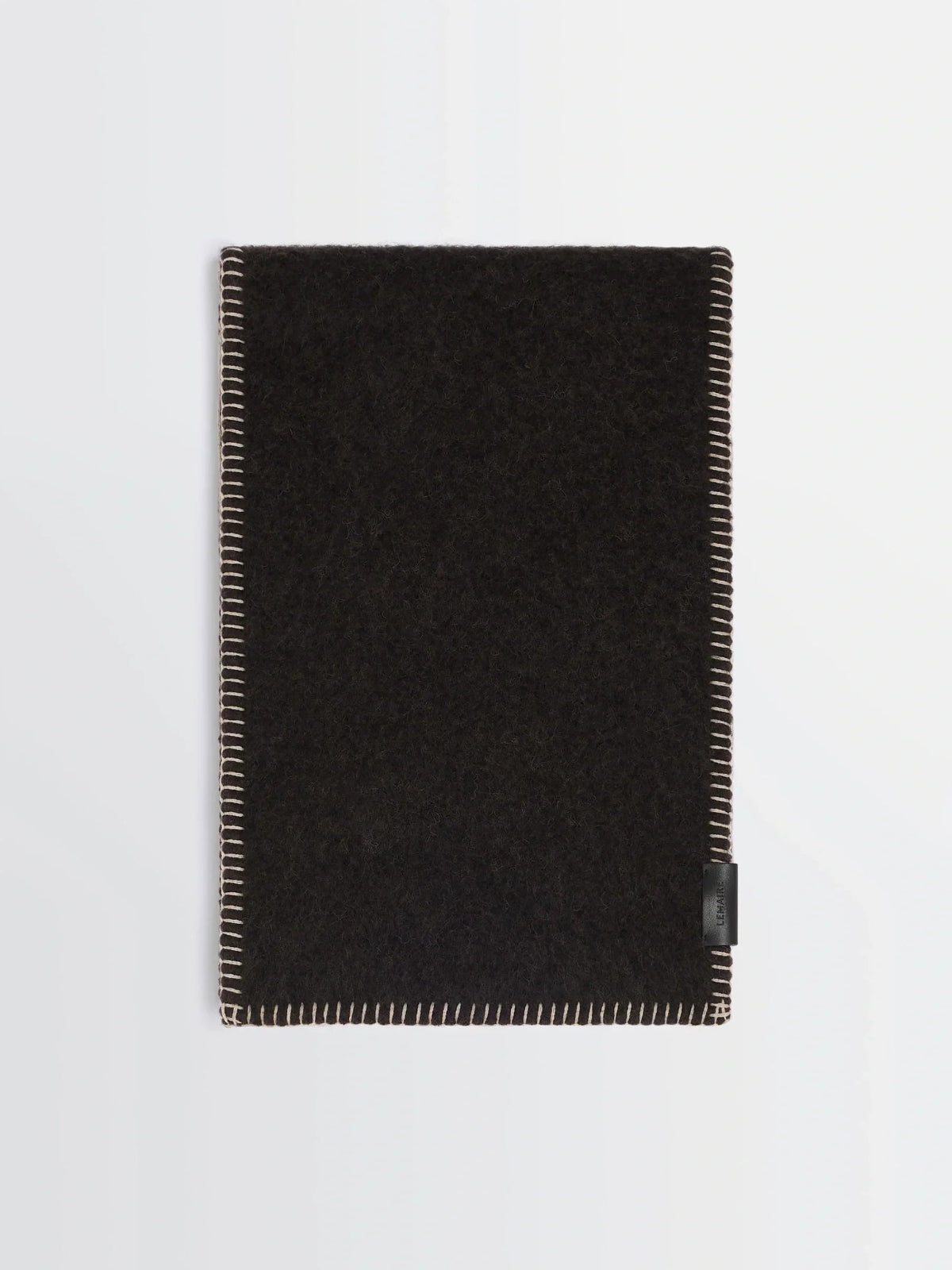 Long scarf made from warm, fluffy brown alpaca blend and cocotte-stitch detailing at the edges. Features a Lemaire-embossed leather label.
