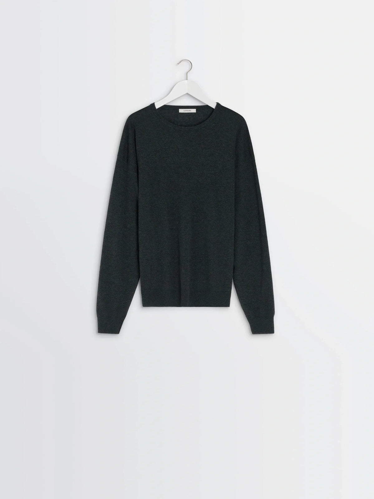 Relaxed classic sweater crafted in fine dark grey lightly mercerized wool melange with a subtle sheen. Crewneck and long sleeves with a dropped shoulder. Rib detail around the neck, cuffs and bottom hem. Straight cut.