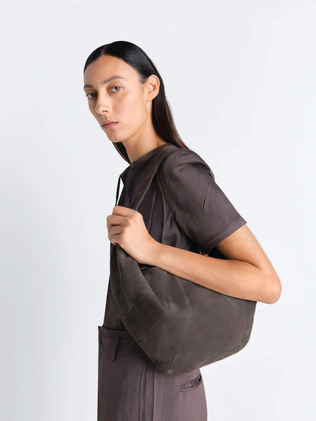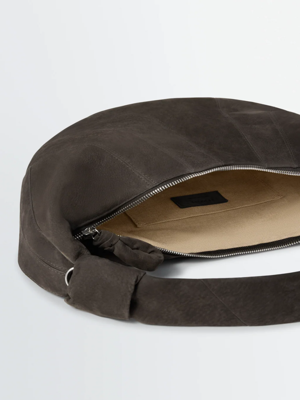 Unisex bag made from dark brown alpaca nubuck leather that can be carried in hand or on the shoulder. Handle with side knot detailing with knot detailing, zip fastening with a quilted pull tab and a zipped side pocket. Internal card pocket, silver-plated metalwork and an embossed interior leather label. Lined in cotton canvas.