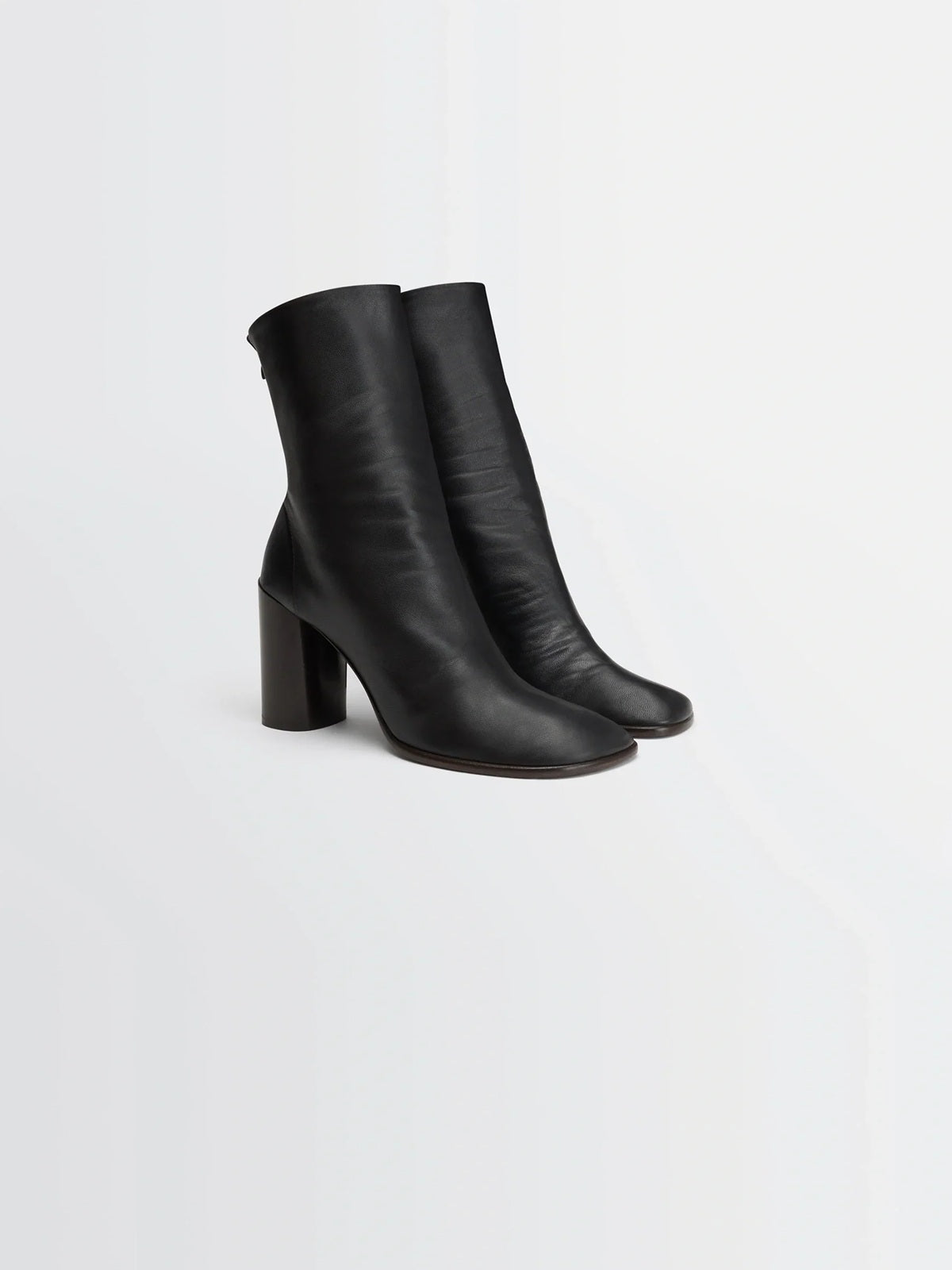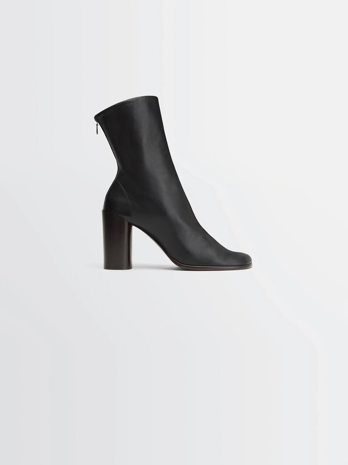 Ankle boot in supple and soft dark brown LWG Gold-certified lamb leather, inspired by the suppleness of a glove. Round toe, zip fastening at the back and a laminated leather block heel. Lined in leather.