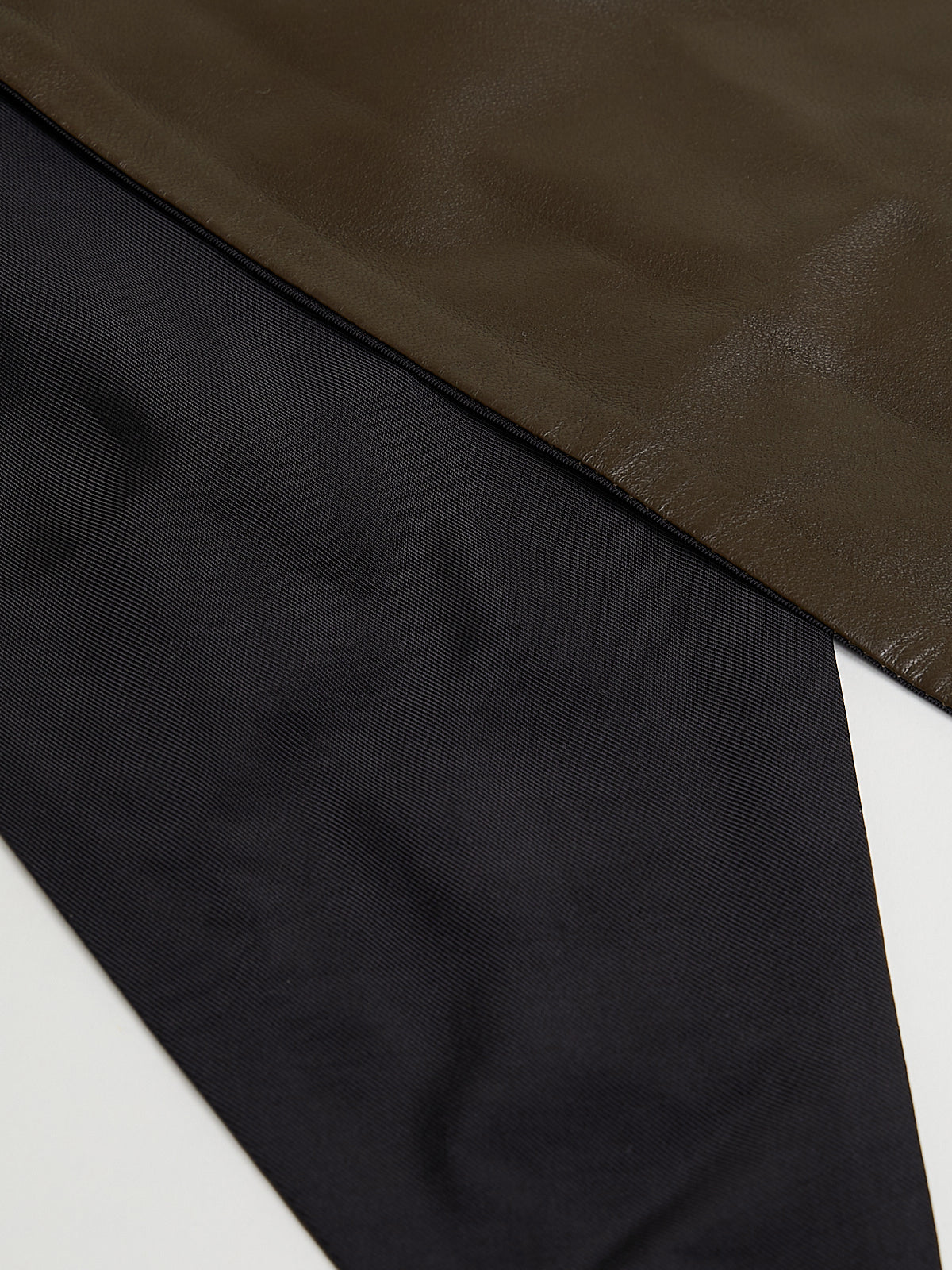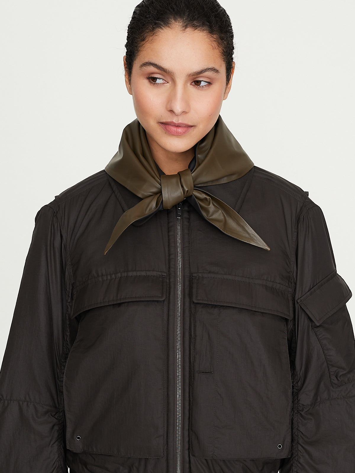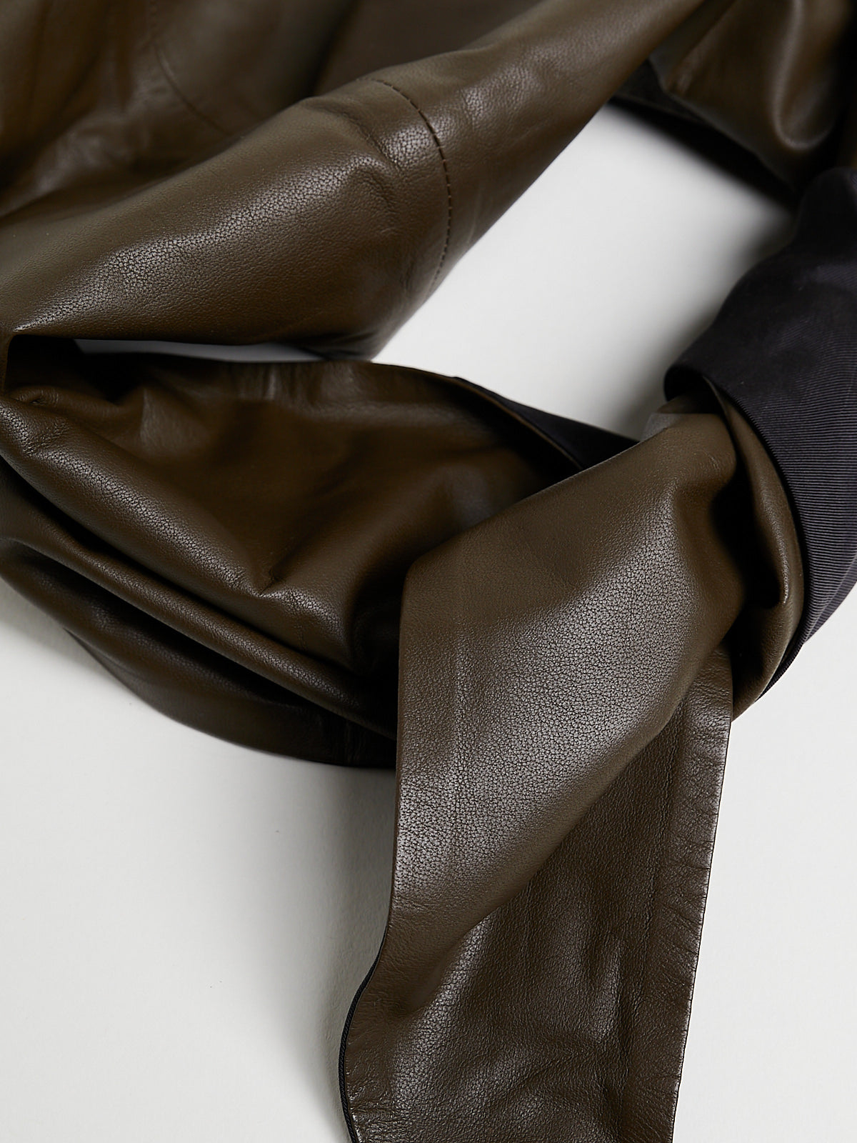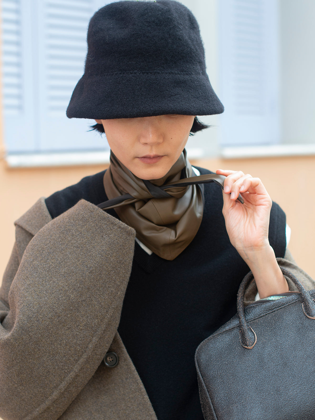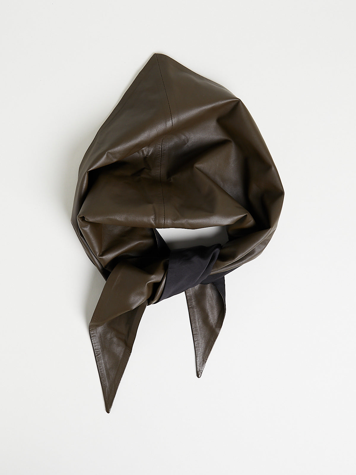 Triangular-shaped scarf crafted in supple brown nappa lamb leather with a glossy finish. Lined in silk twill.