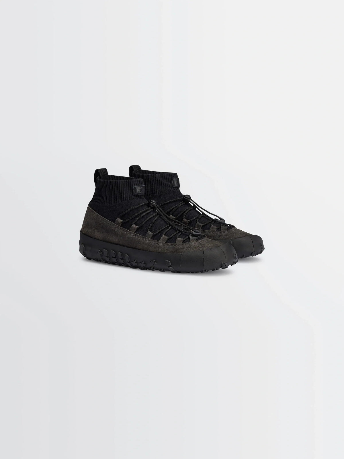 Men's wrap-on sneaker with an upper made from off black supple leather. Round toe and with an interior sock constructed from a technical fabric that has a ribbed trim at the ankle. Adjustable closure with laces and loops and a grosgarin pull tab at the back. Features a waterproof wrap-around Vibram sole.