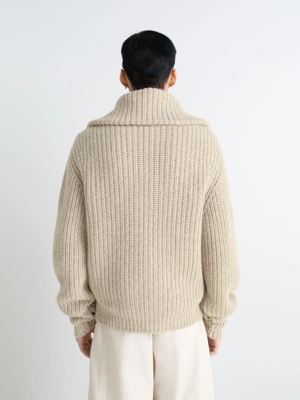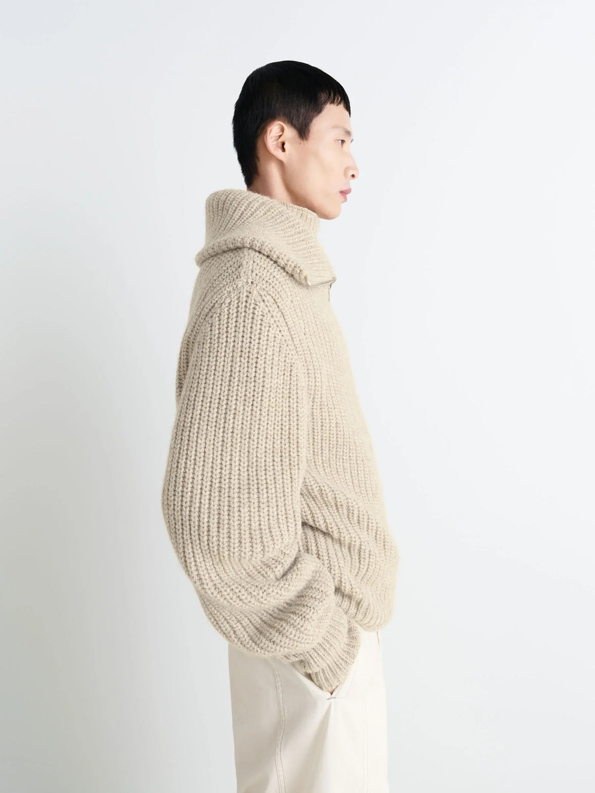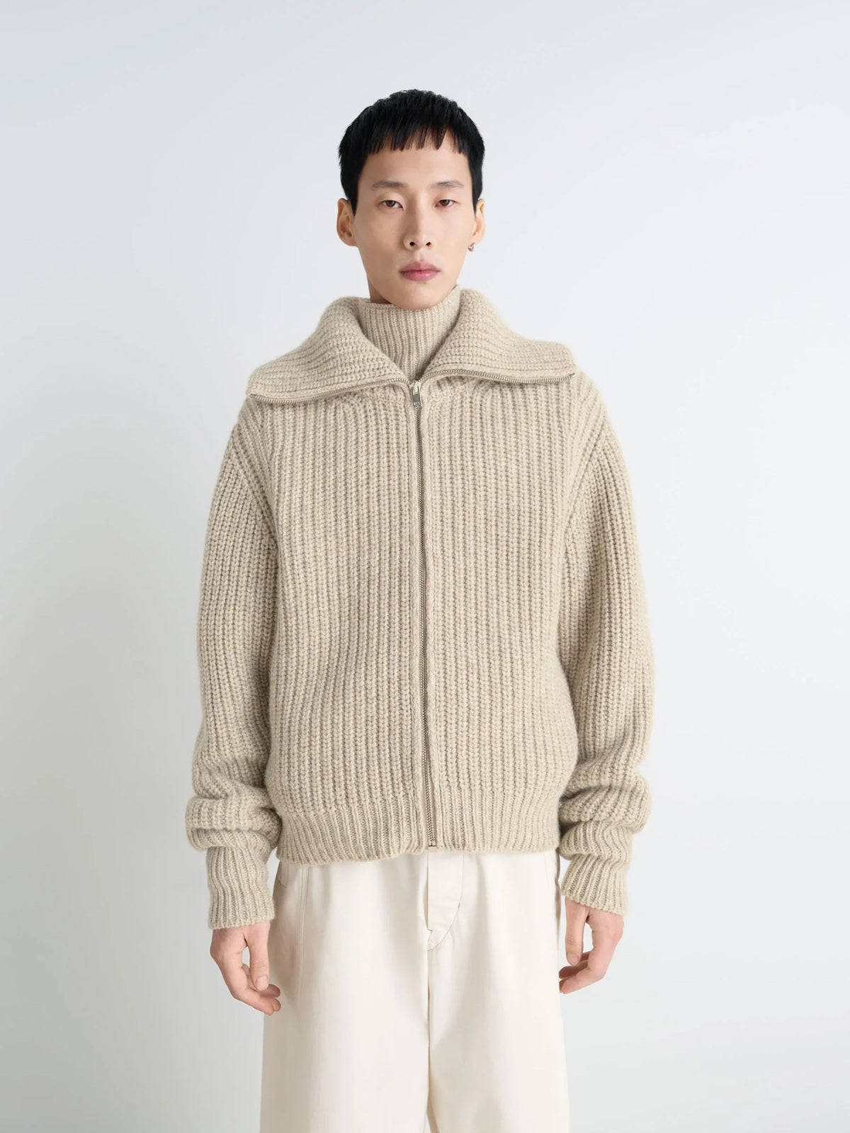 Oversized men's bomber-style cardigan in two-toned beiged yak/alpaca with a dense rib-knit. Stand collar, front zip fastening and long blouson sleeves with a dropped shoulder. Zipped slip pockets on the sides. Ribbed trim at the neck, cuffs and bottom hem.