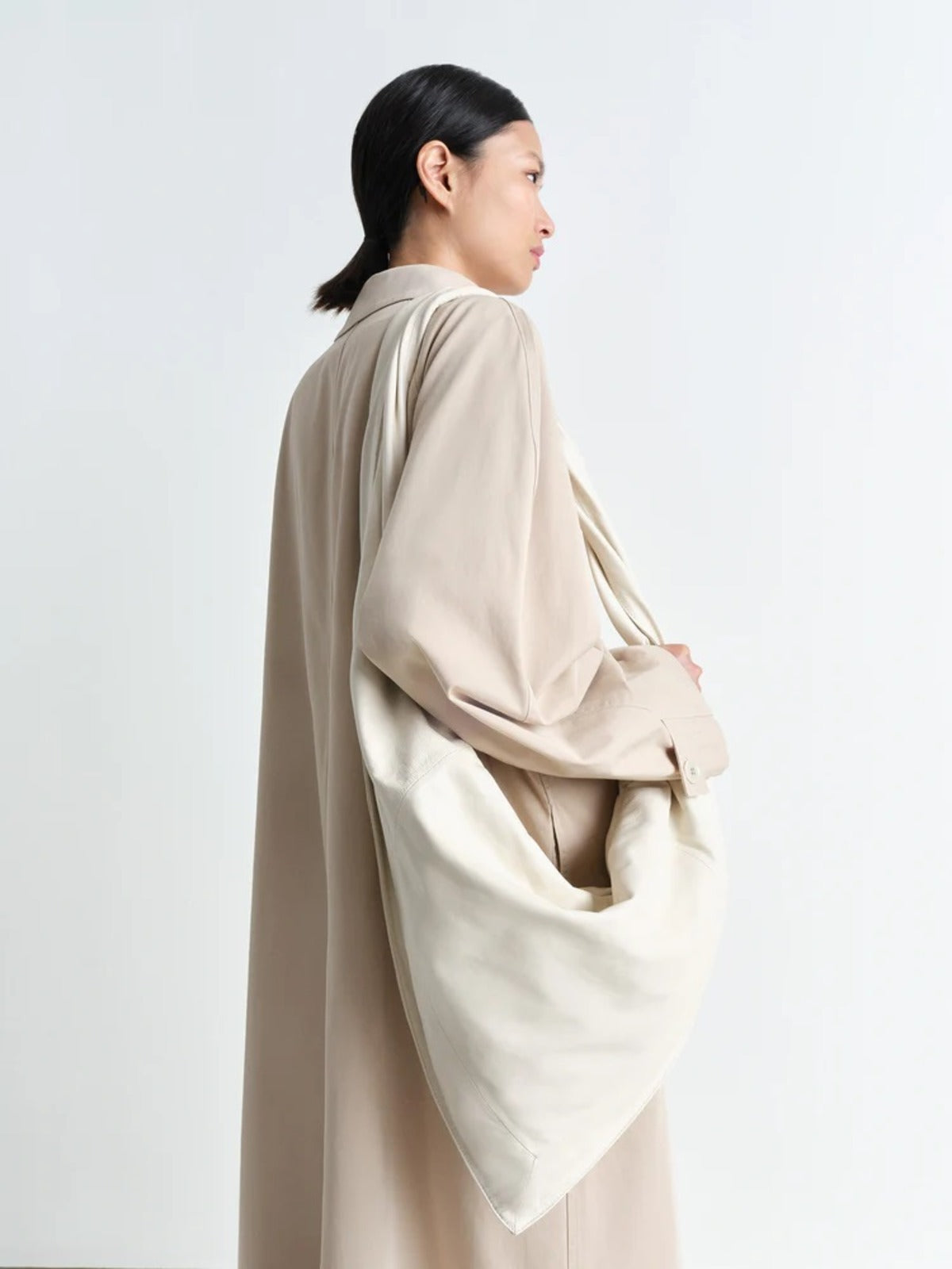 Scarf bag in smooth off white Nappa sheep leather with a shiny finish. Designed as a "trompe l’oeil" as a nod to an oversized foulard. Zip fastening, one large main compartment and a small internal pocket with a zip fastening. Features a twisted strap that allows the bag to be worn on the shoulder or cross-body. Can hold a 13" laptop. Lined in leather.