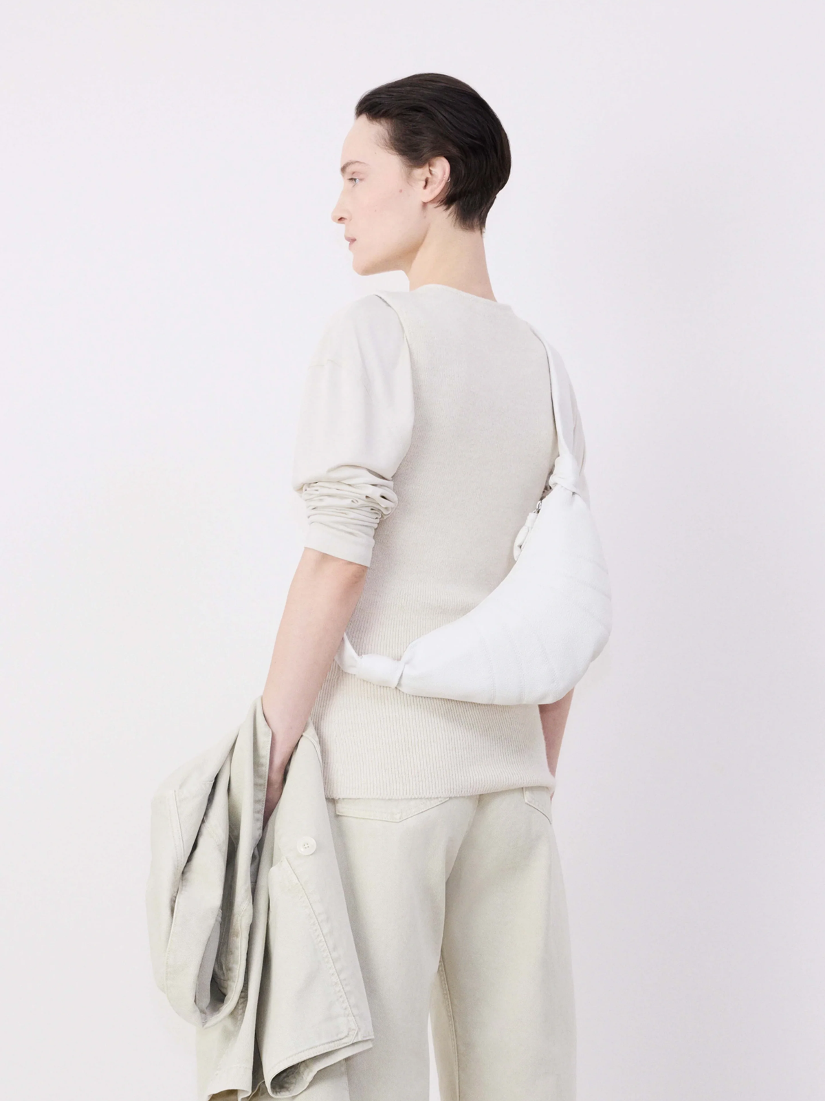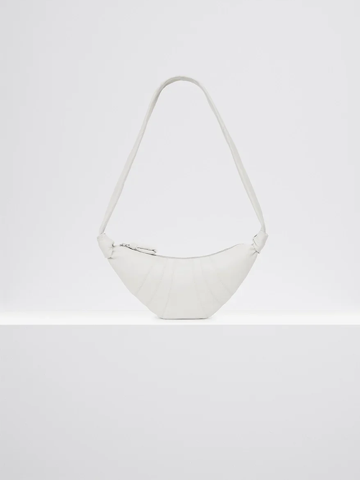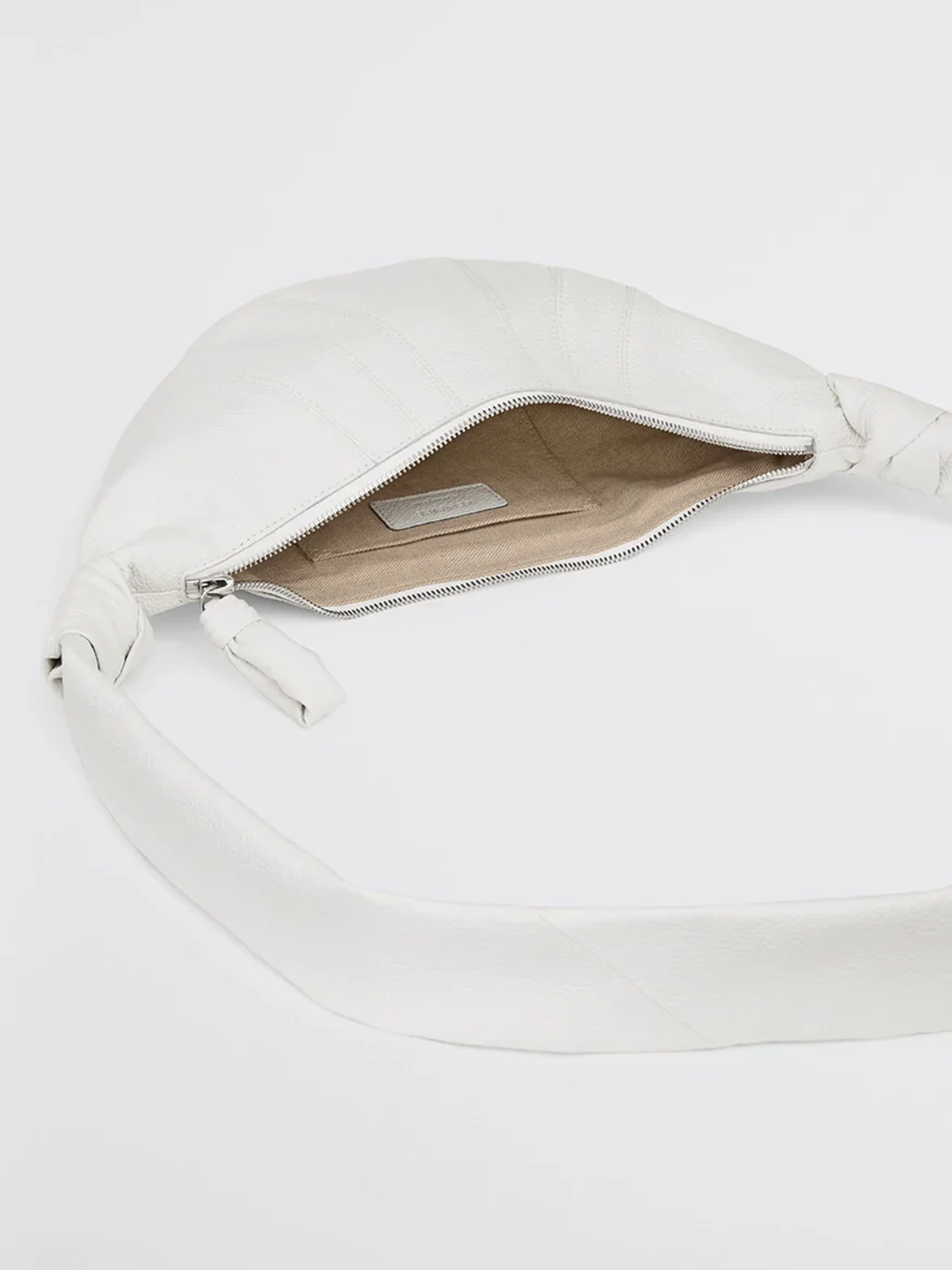 Small version of the classic Lemaire bag, inspired by the shape of a croissant pastry. Made of soft chalk lamb nappa leather that is supple yet resistant. Its design was achieved through an assembly of topstitched cutouts. Metal zip fastening with a puller and an internal slip pocket. Open seam details and side knot details. Lined in cotton canvas. Can be worn on the shoulder or crossbody.