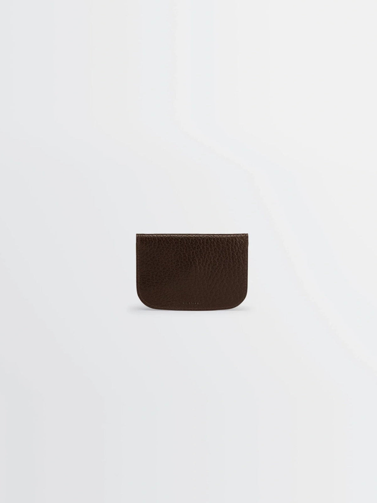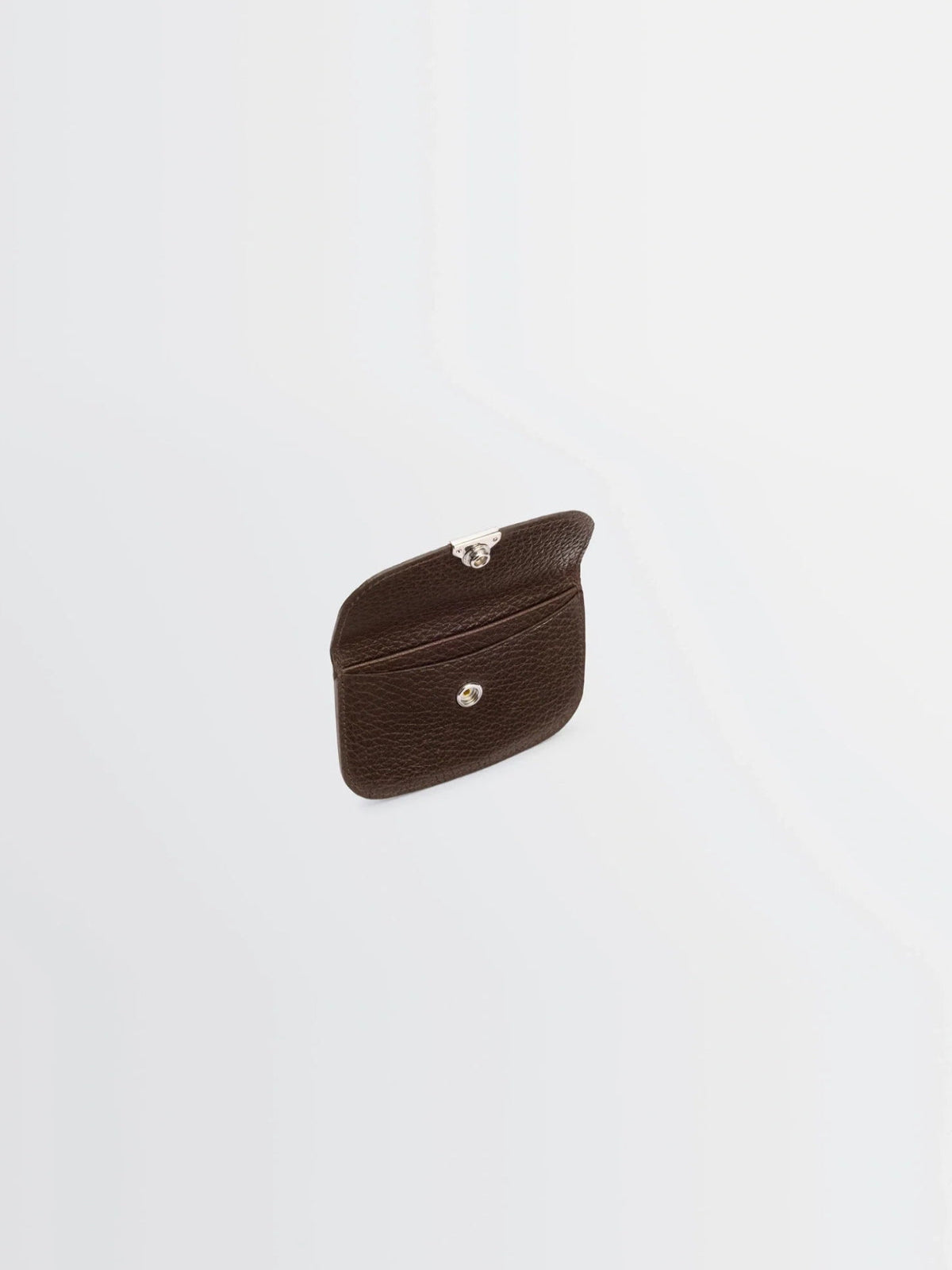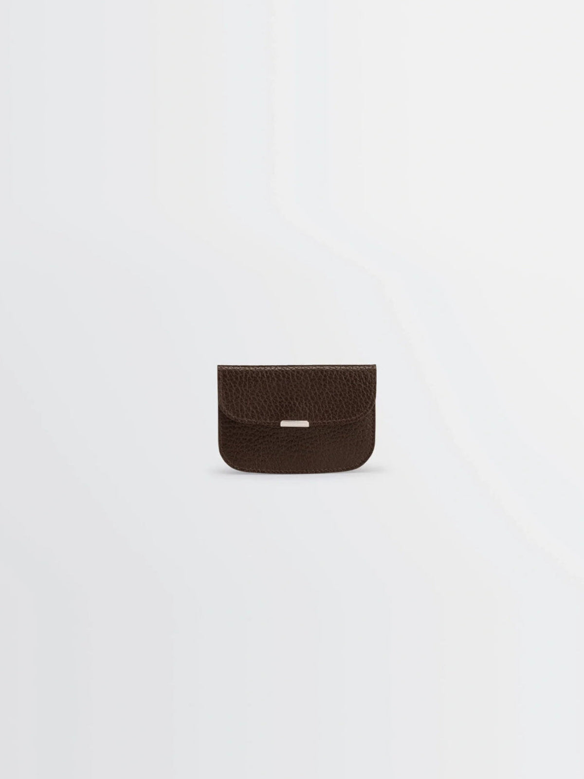 Card holder made from dark brown LWG Gold-certified grained cow leather, a thick resistent material with a textured finish. Flap with a snap closure and two interior compartments. Silver-plated metalwork and an embossed Lemaire logo at the back. Lined in Nappa sheep leather.