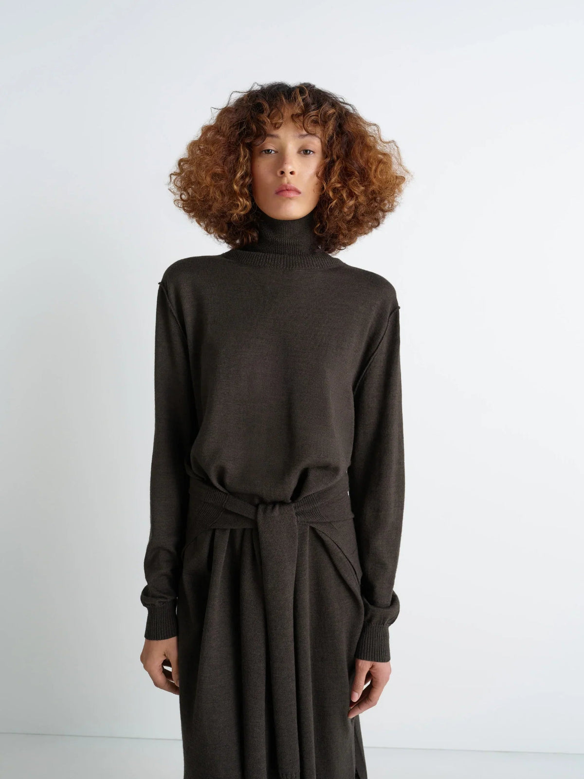 Knitted dress in a dark brown Merino wool blend. Stand collar and long sleeves with a dropped shoulder. Features Trompe L'Oeil sweater-style tie-around back panels and visible shoulder and armhole seams. Side slits at the hem. Ribbed trim detailing throughout. Mid-calf length.