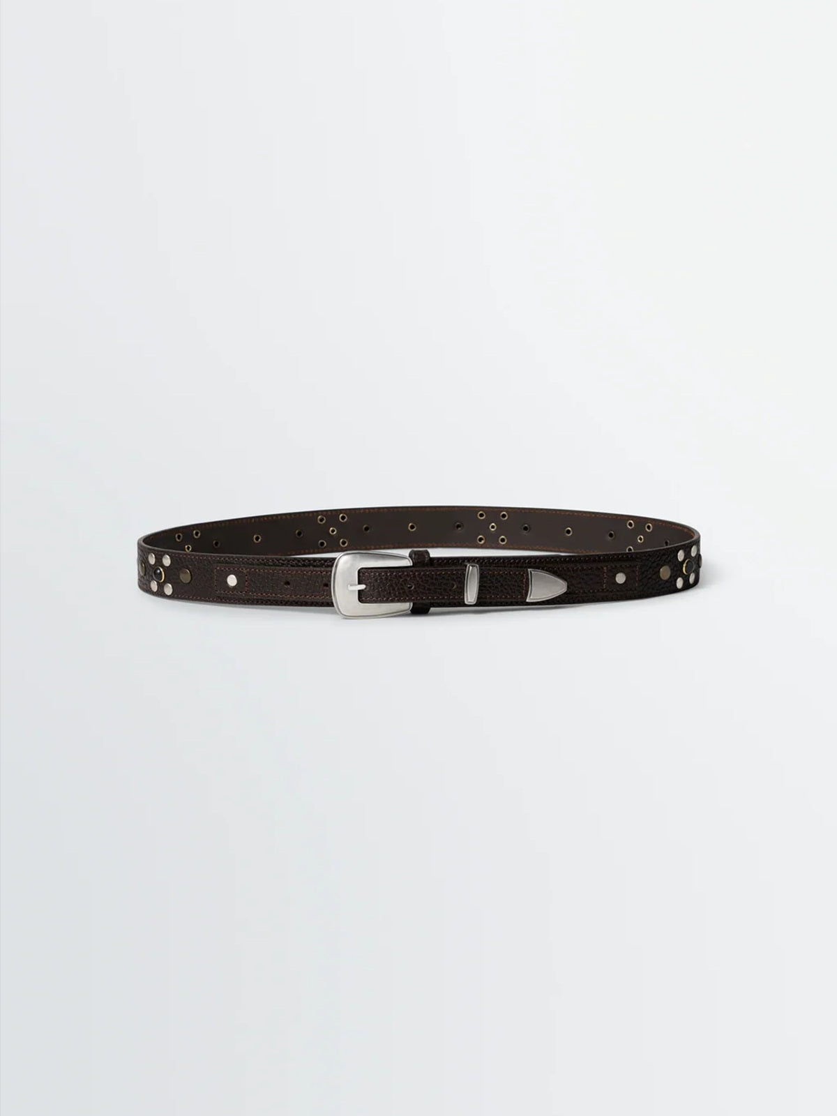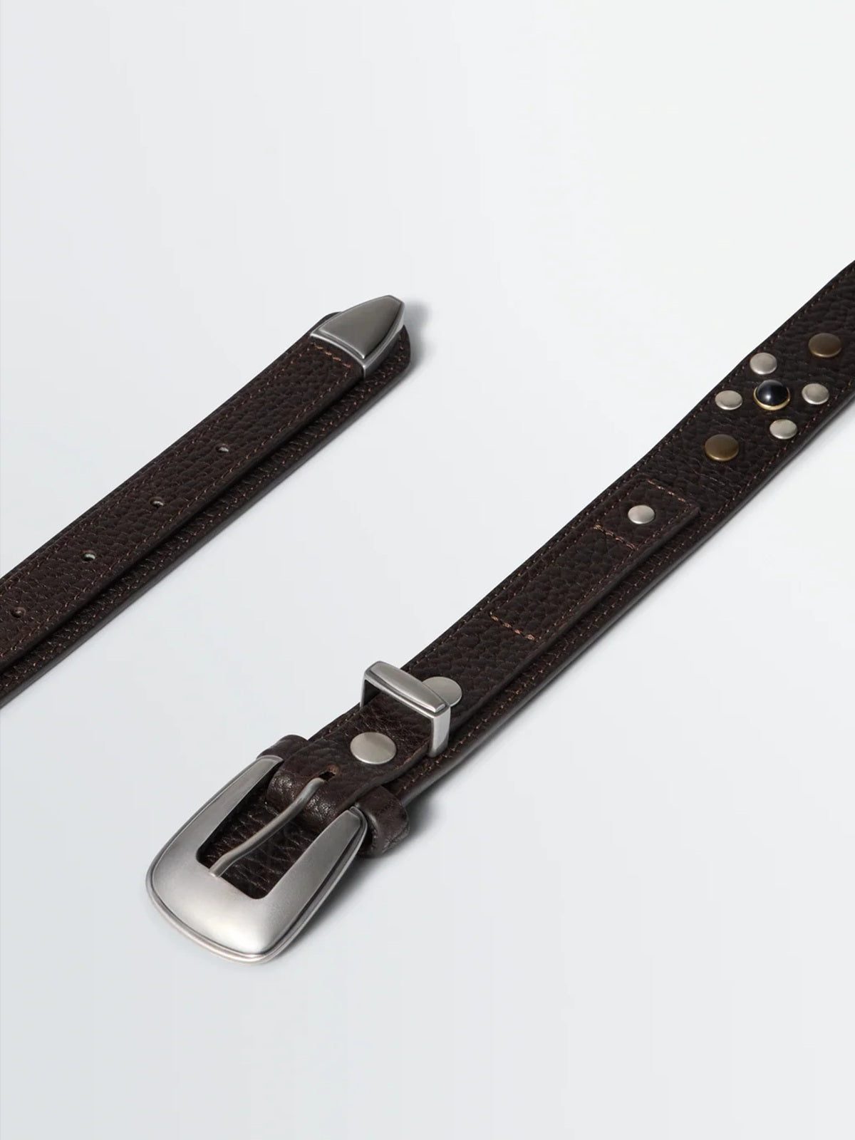 Belt made from dark brown grained cow leather decorated with metal studs. Metal buckle fastening, metal loop and a metal tip. Adjustable length. Features an embossed Lemaire logo on the inside.