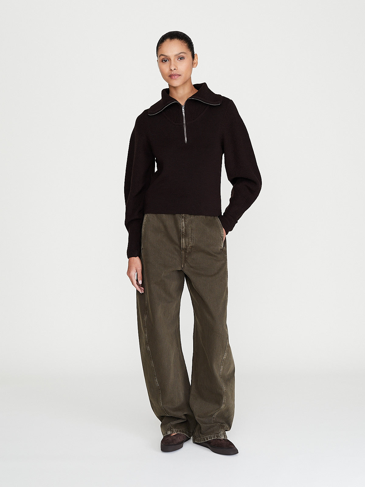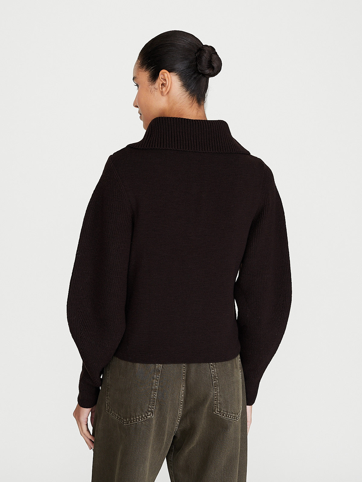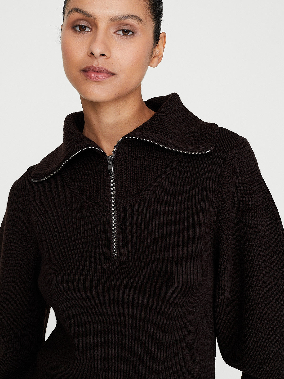 Knitted sweater in dark burgundy worsted wool that features different types of at the collar, sleeves and body. Stand collar, partial zip fastening and long scuplted sleeves. Rib detail around the collar, neckline and sleeves. Straight cut.